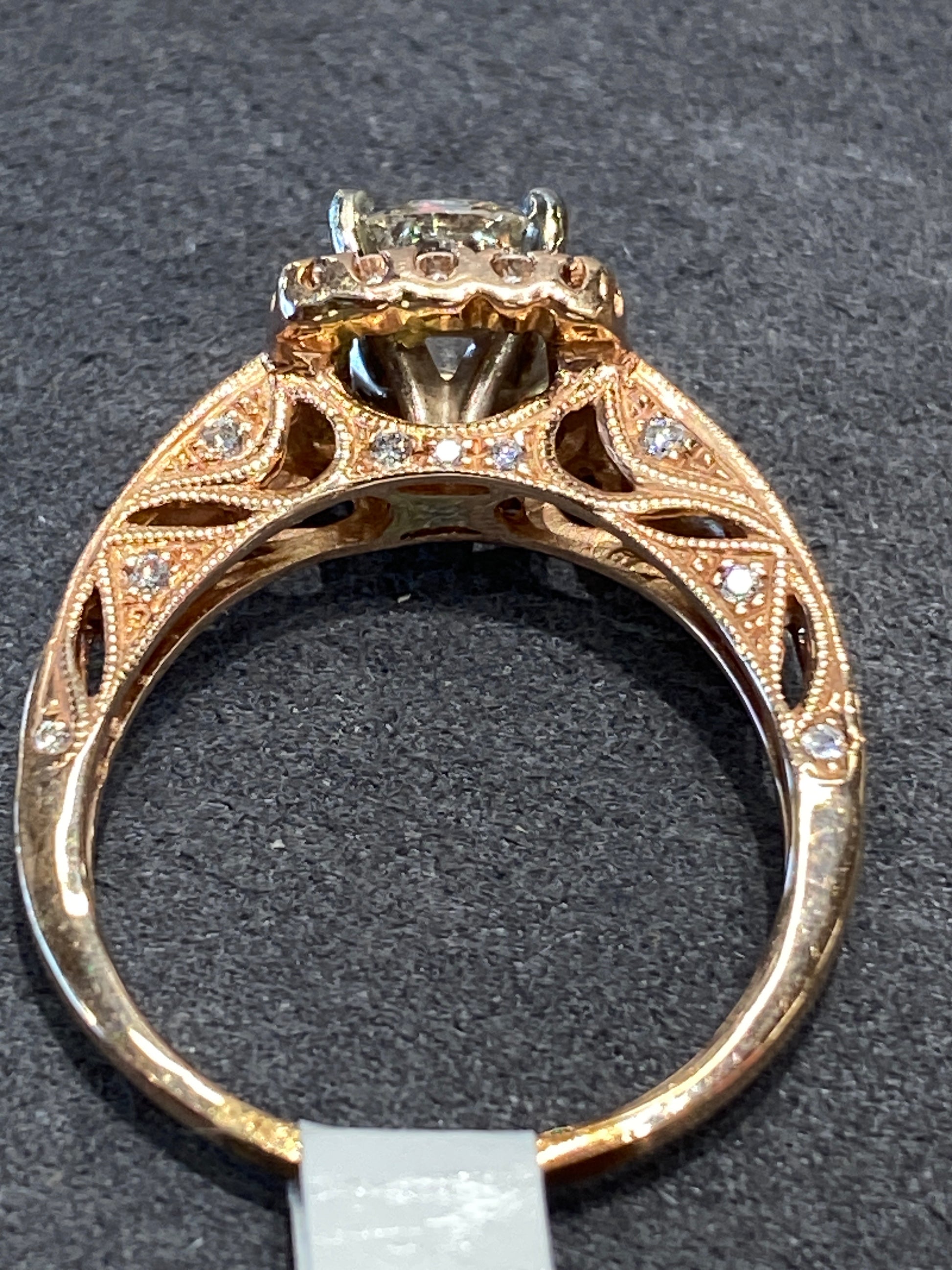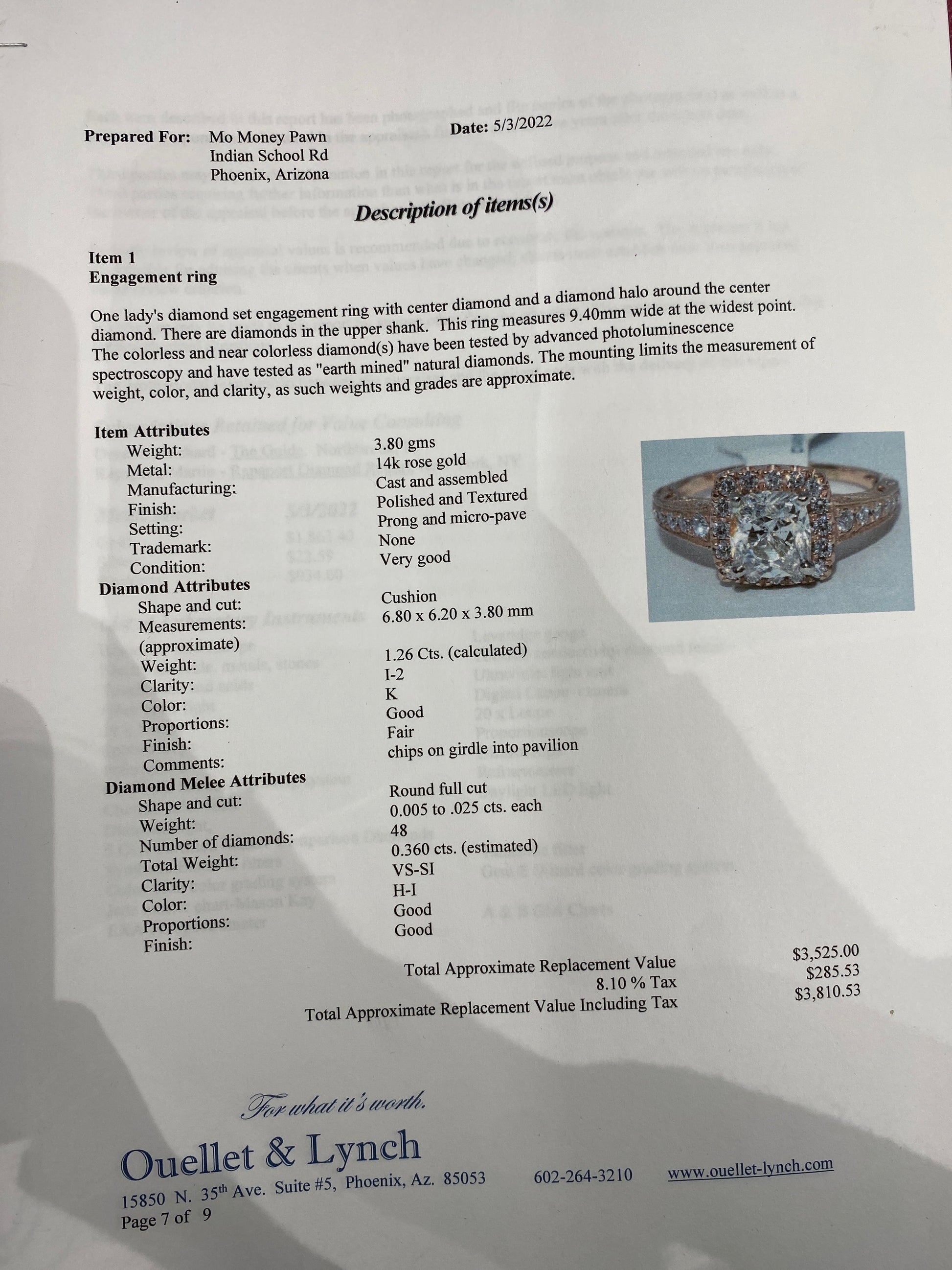 3.8 Grams Of 14k Rose Gold Diamond Engagement Ring. Engagement Ring Has A 1.26CT Cushion Cut Diamond In The Center With A Clarity & Color of (I-2-K). Engagement Ring Also Has 0.36CTW Of Round Diamonds Around The Band With A Clarity Of (VS/SI) & A Color Of (H/I). Engagement Ring Is A Size 7 & Comes With An Appraisal.