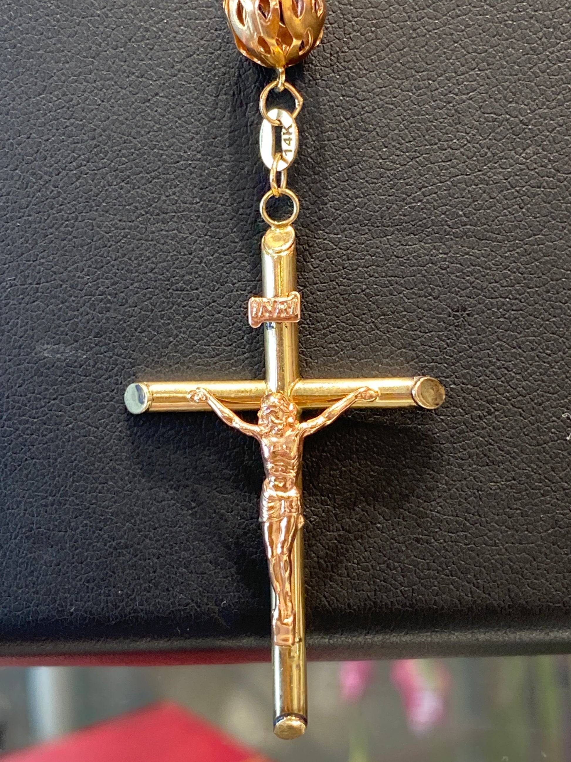 30 Grams Of 14k Tri Gold Rosary. Rosary Is 28” Long In The Neck & 33” Total Length. Rosary Beads Are 6.3MM & 8MM