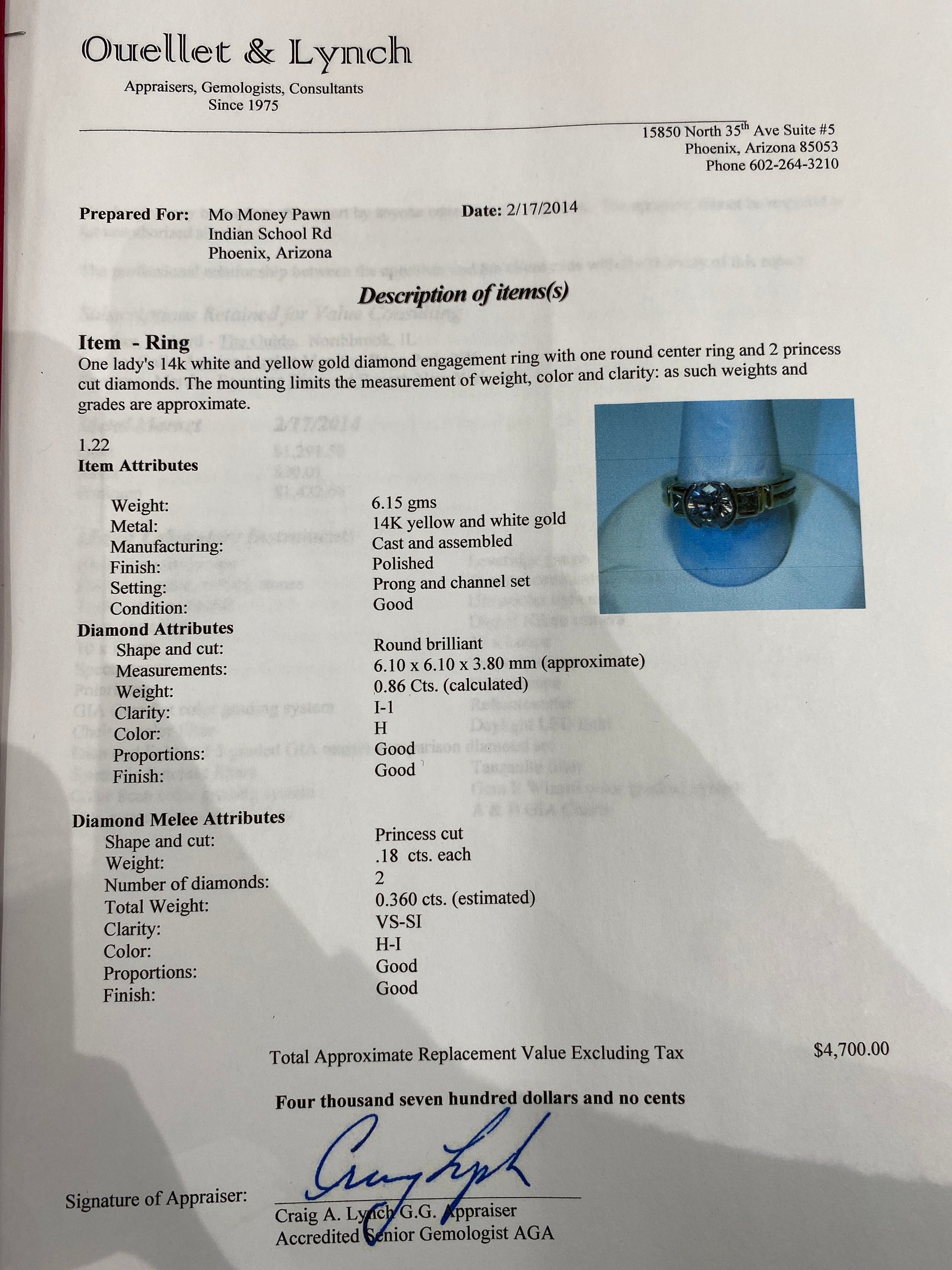 6.1 Grams Of 14k Two Tone Diamond Engagement Ring. Engagement Ring Has A 0.86CT Round Brilliant Diamond In The Center With A Clarity & Color Of (I-1-H). Engagement Ring Also has 2 Princess Cut Diamonds On Each Side Of The Band That Are 0.18CT Each With A Total Diamond Weight Of 0.36CTW With A Clarity Of ( VS / SI) & Color Of ( H / I). Engagement Ring Is A Size 6.5 & Comes With An Appraisal.