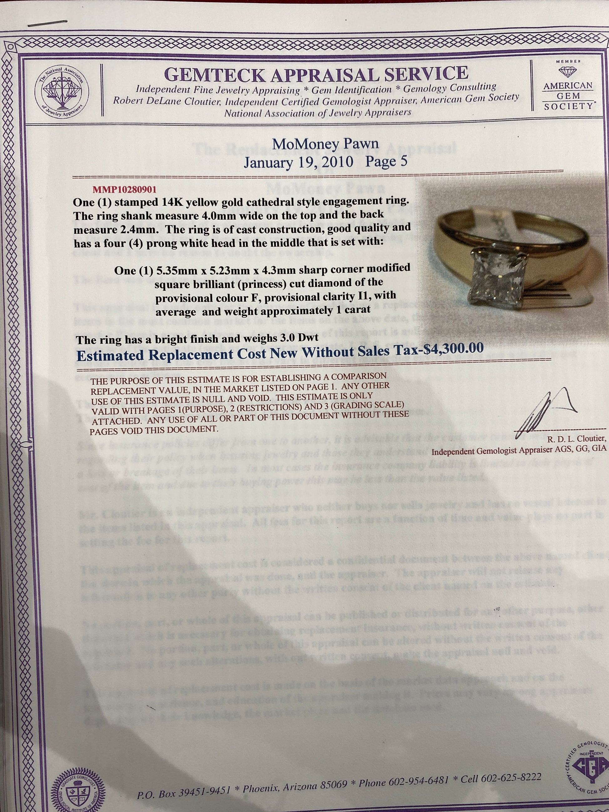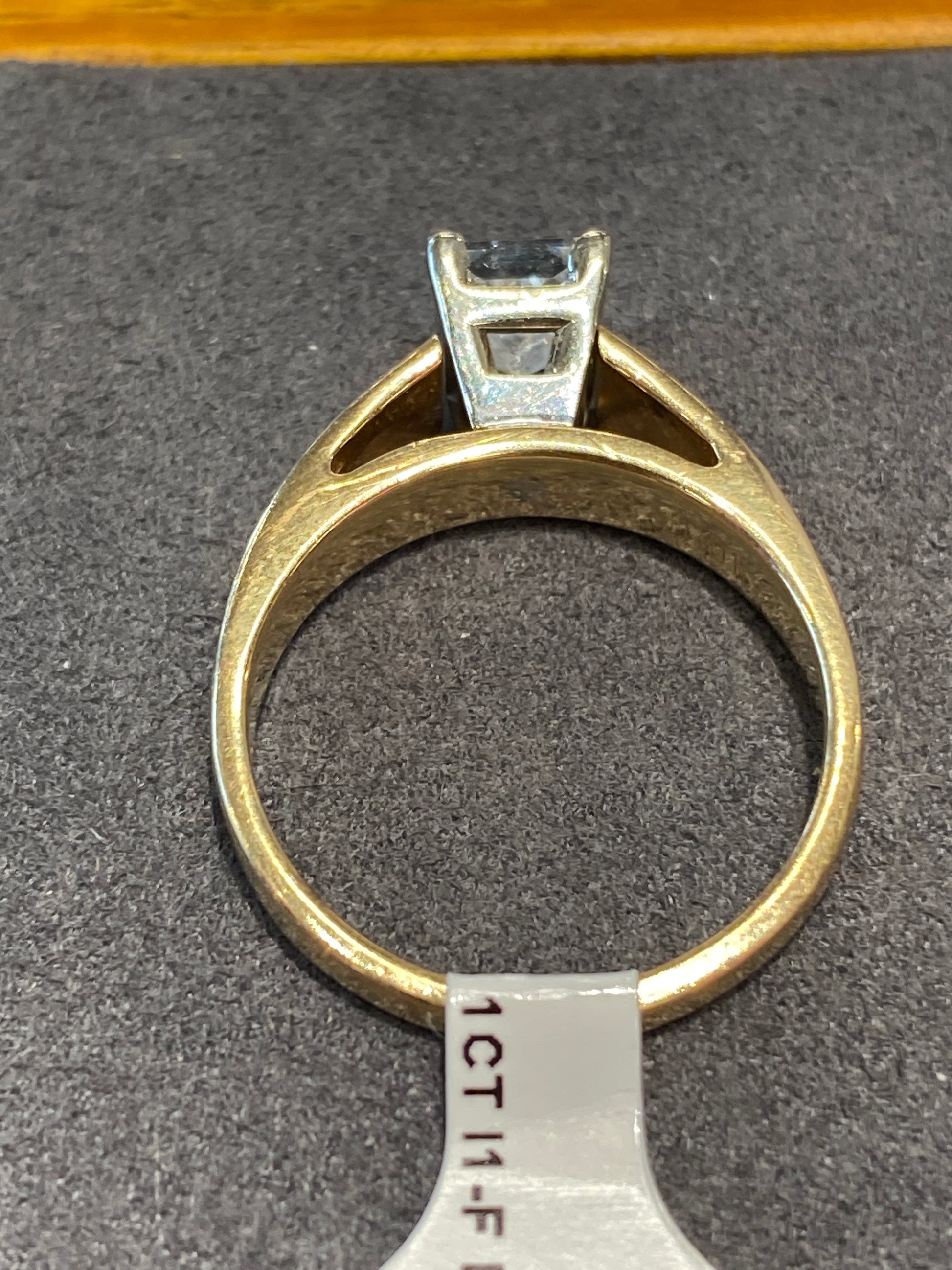 4.6 Grams Of 14k Two Tone Diamond Engagement Ring. Engagement Ring Has A 1.00CT Princess Cut Diamond InThe Center With A Clarity & Color Of (I-1-F). Engagement Ring Is A Size 7 & Comes With An Appraisal.