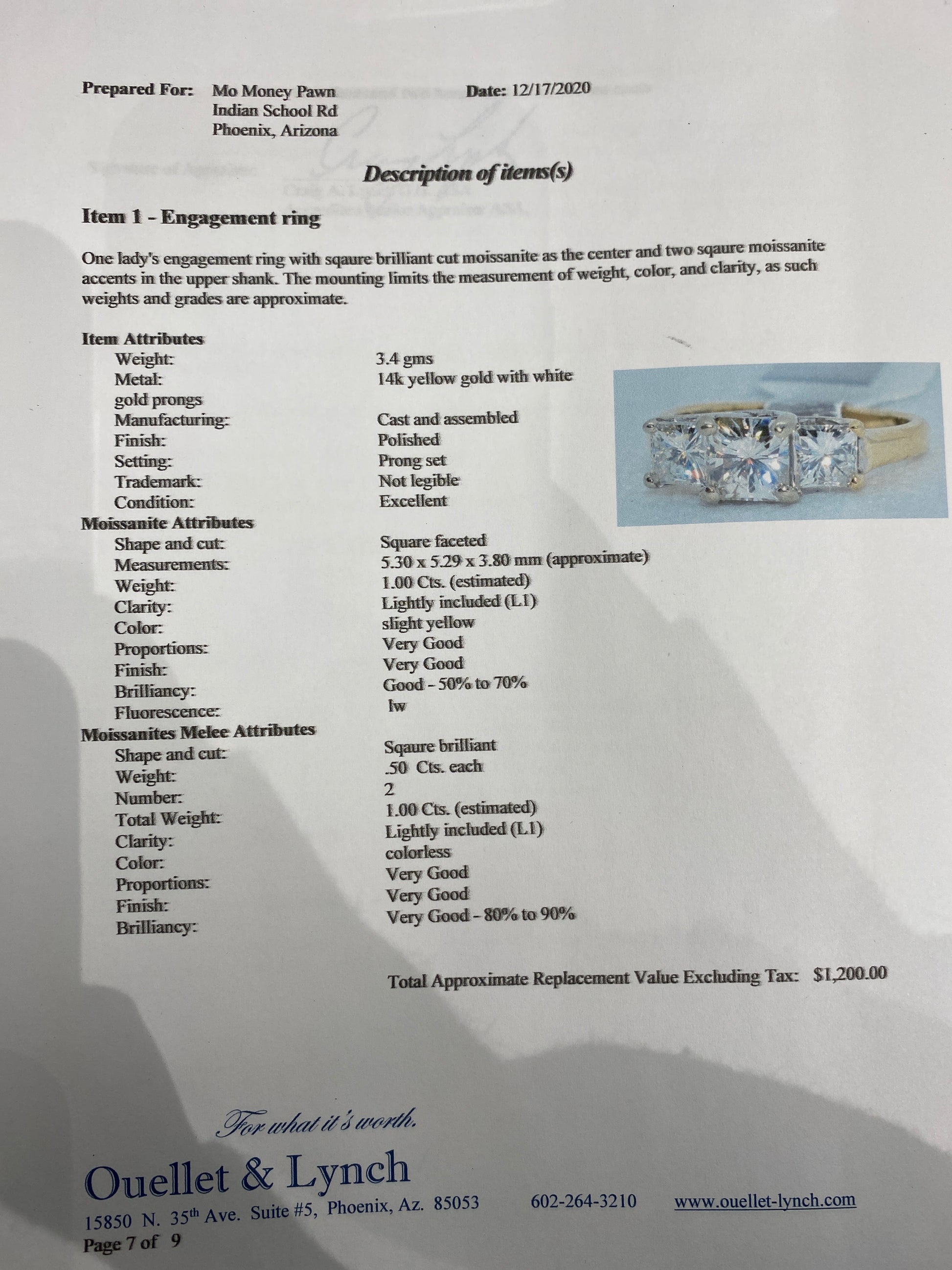 3.4 Grams Of 14k Two Tone Gold Moissanite Engagement Ring. Engagement Ring Has A 1 Ct Princess Cut Moissanite In The Center With A Clarity Of Lightly Included (L1) & Color Of Slight Yellow. Engagement Ring Also Has 2 Princess Cut Moissanite On Each Side With A Weight Of 1.00CTW. With A Clarity of Lightly Included ( L1) & Color Of Colorless. Engagement Ring Is A Size 5.25 & Comes With An Appraisal.