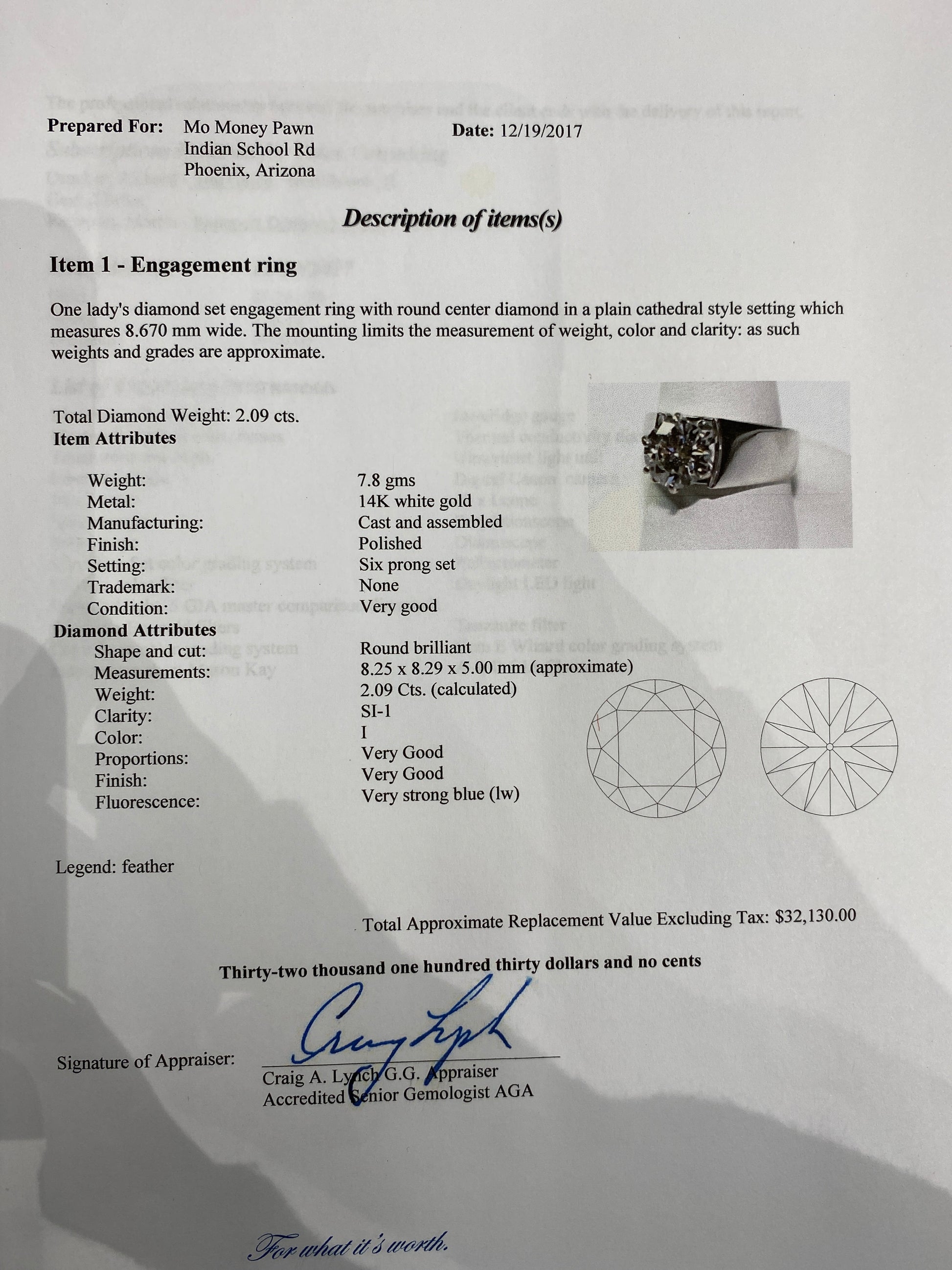 7.8 Grams Of 14k White Gold Diamond Engagement Ring. Engagement Ring Has A Round Brilliant Diamond In The Center That Measures 2.09CT With A Clarity & Color Of (SI-1-I). Engagement Ring Is A Size 7.5 & Comes With An Appraisal.