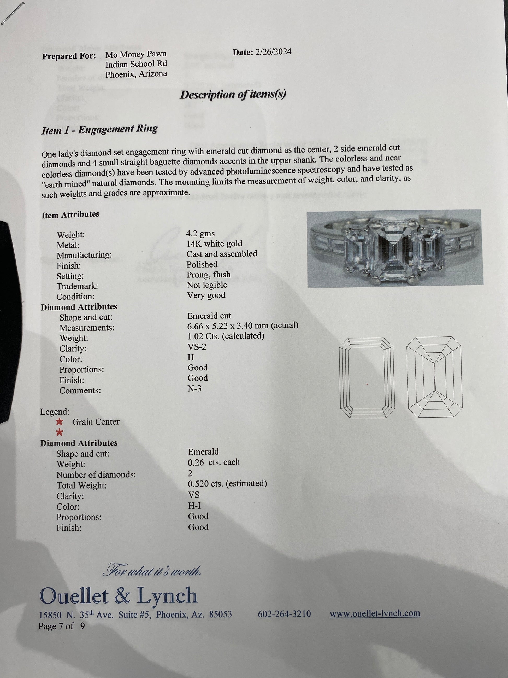 4.2 Grams Of 14k White Gold Diamond Engagement Ring. Engagement Ring Has A 1.02CT Emerald Cut Diamond In The Center With A Clarity & Color Of (VS-2-H). Engagement Ring Also Has 2 Emerald Cut Diamonds On Each Side With A Weight If 0.52CTW With A Clarity Of (VS) & Color Of (H-I).Engagement Ring Also Has 4 Straight Baguettes On The Band With A Weight Of 0.20CTW & A Clarity Of (VS) & Color Of (H /I ). Engagement Ring Is A Size 7 & Comes With An Appraisal.