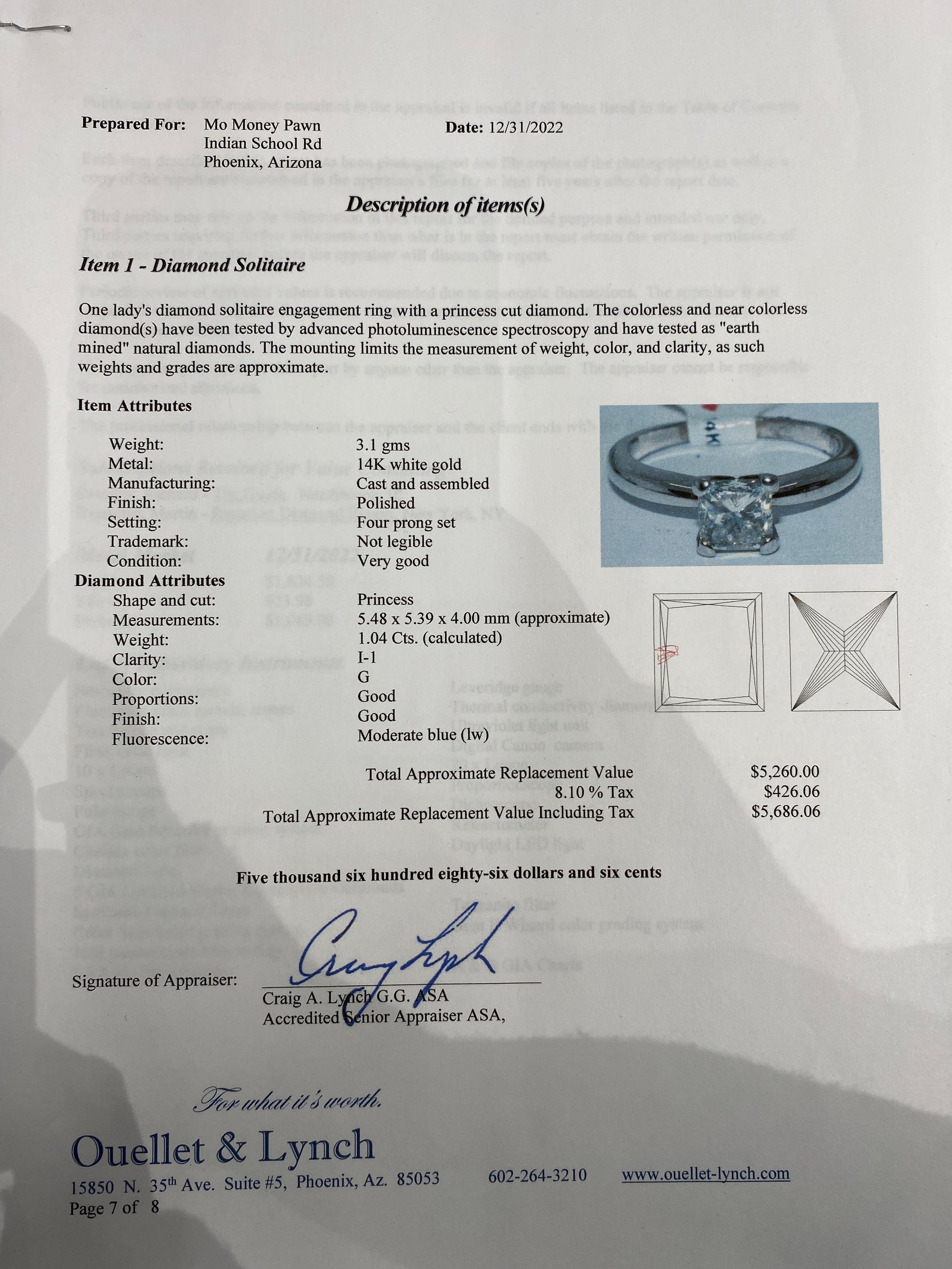3.1 Grams Of 14k White Gold Diamond Engagement Ring. Engagement Ring Has A 1.04CT Princess Cut Diamond & Has A Clarity & Color Of (I-1-G). Engagement Ring Is A Size 6 & Comes With An Appraisal.