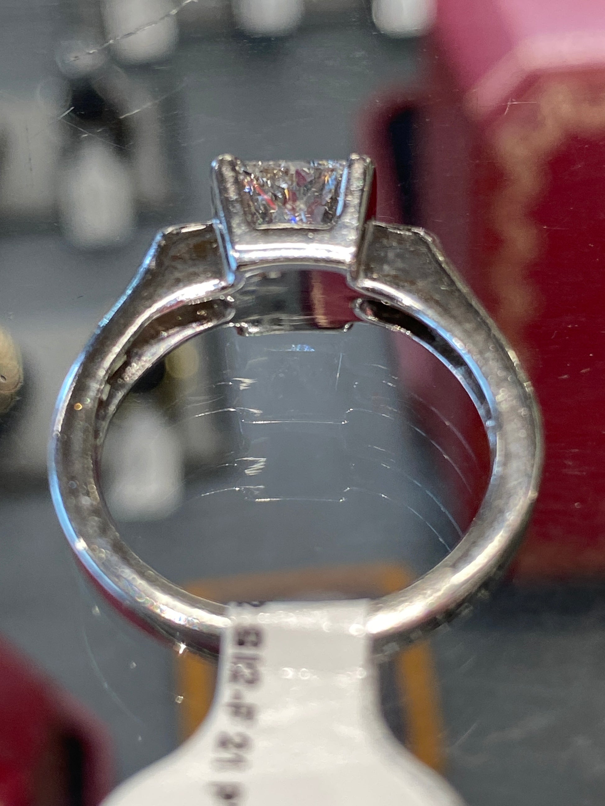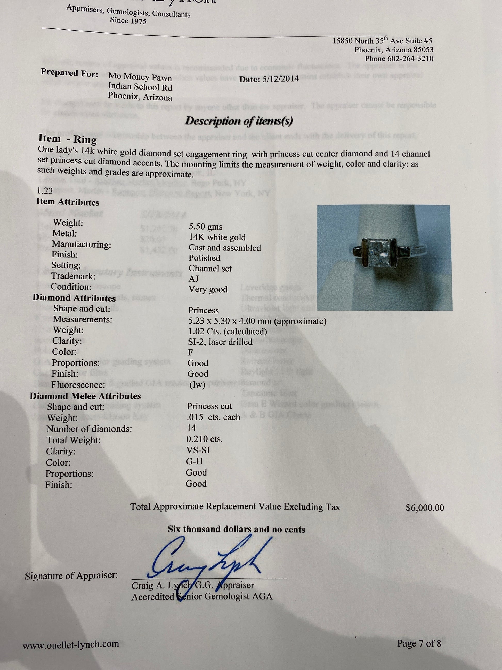 5.5 Grams Of 14k White Gold Diamond Engagement Ring. Engagement Ring Has A 1.02CT With A Clarity & Color Of (SI-2-F). Engagement Ring Also Has 14 Princess Cut Diamonds On The Band With A Total Weight Of 0.21CTW & Clarity Of (VS / SI) & Color Of ( G / H). Engagement Ring Is A Size 6.5 & Comes With An Appraisal.
