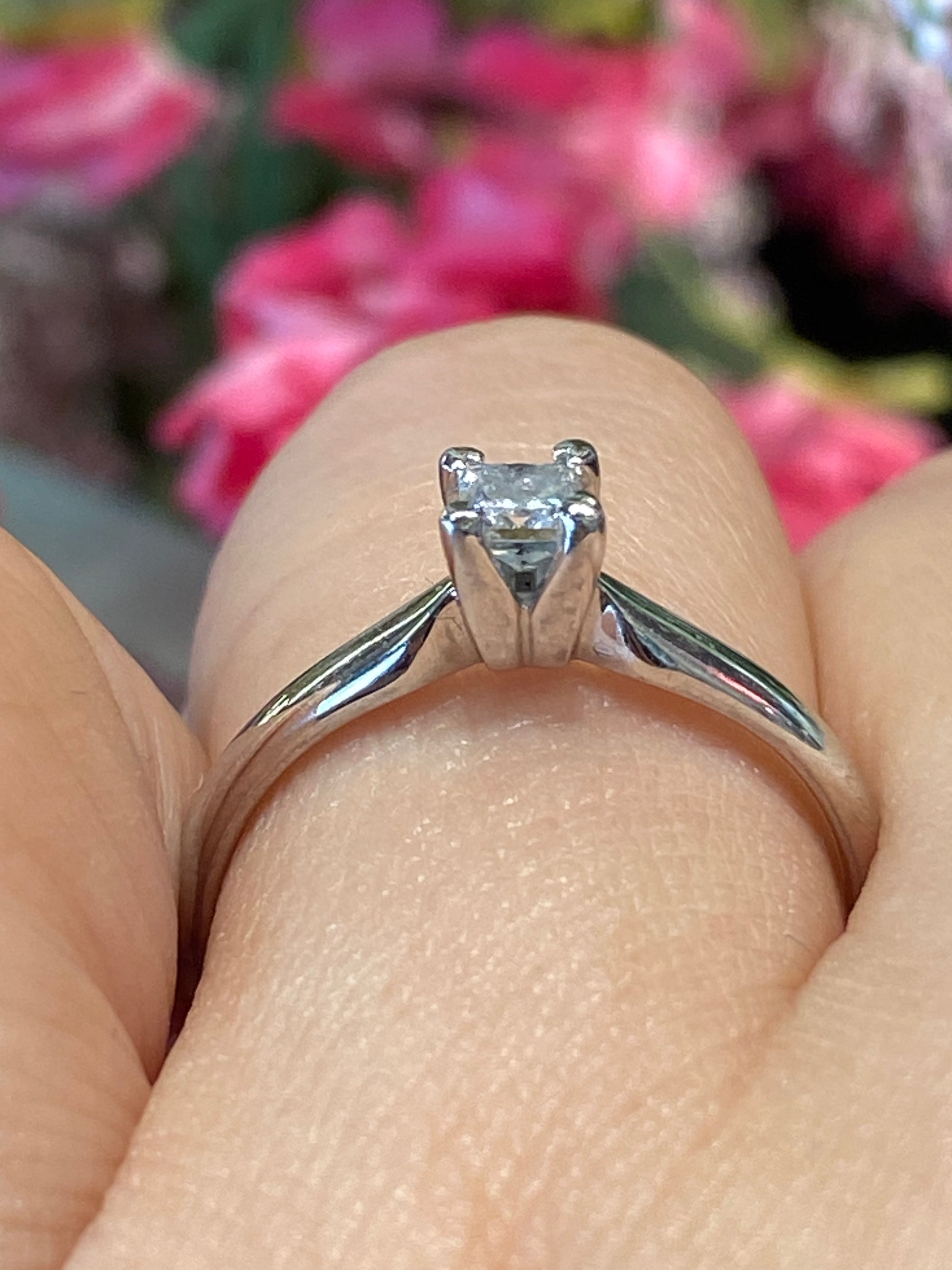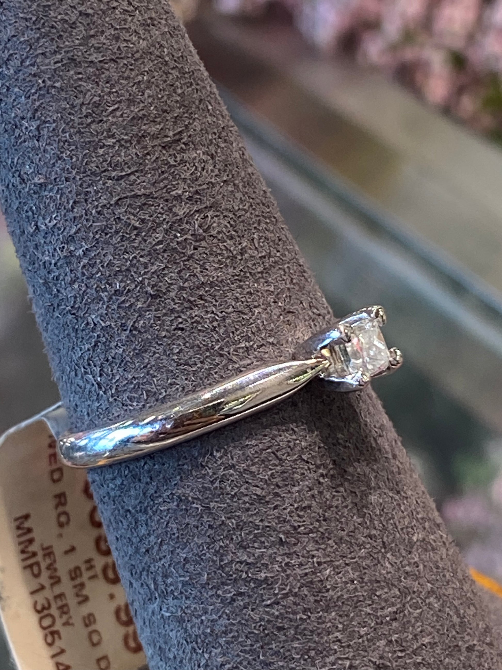 2.2 Grams Of 14k White Gold Engagement Ring With A 0.23CT Princess Cut Diamond. Ring Is A Size 6.75