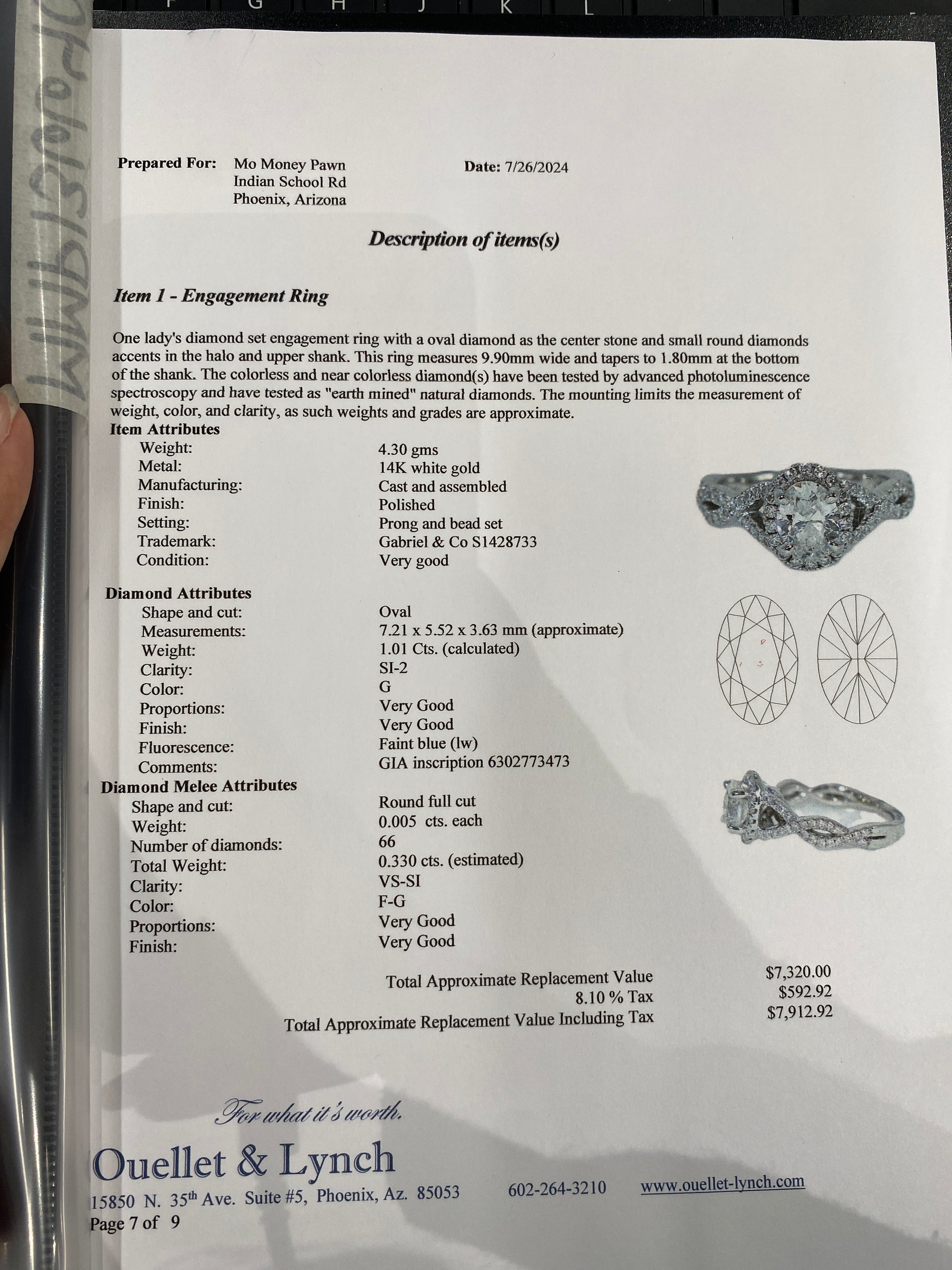 4.5 Grams of 14k White Gold Oval Diamond Engagement Ring. Engagement Ring Has A 1.01 CT Oval Cut Diamond In The Center With A Clarity & Color Of (SI-2-G). Engagement Ring Also Has Round Diamonds On The Mounting That Measure 0.33CTW With A Clarity Of (VS-SI) & Color Of (F-G). Engagement Ring Is A Size 5.75 & Comes With An Appraisal.
