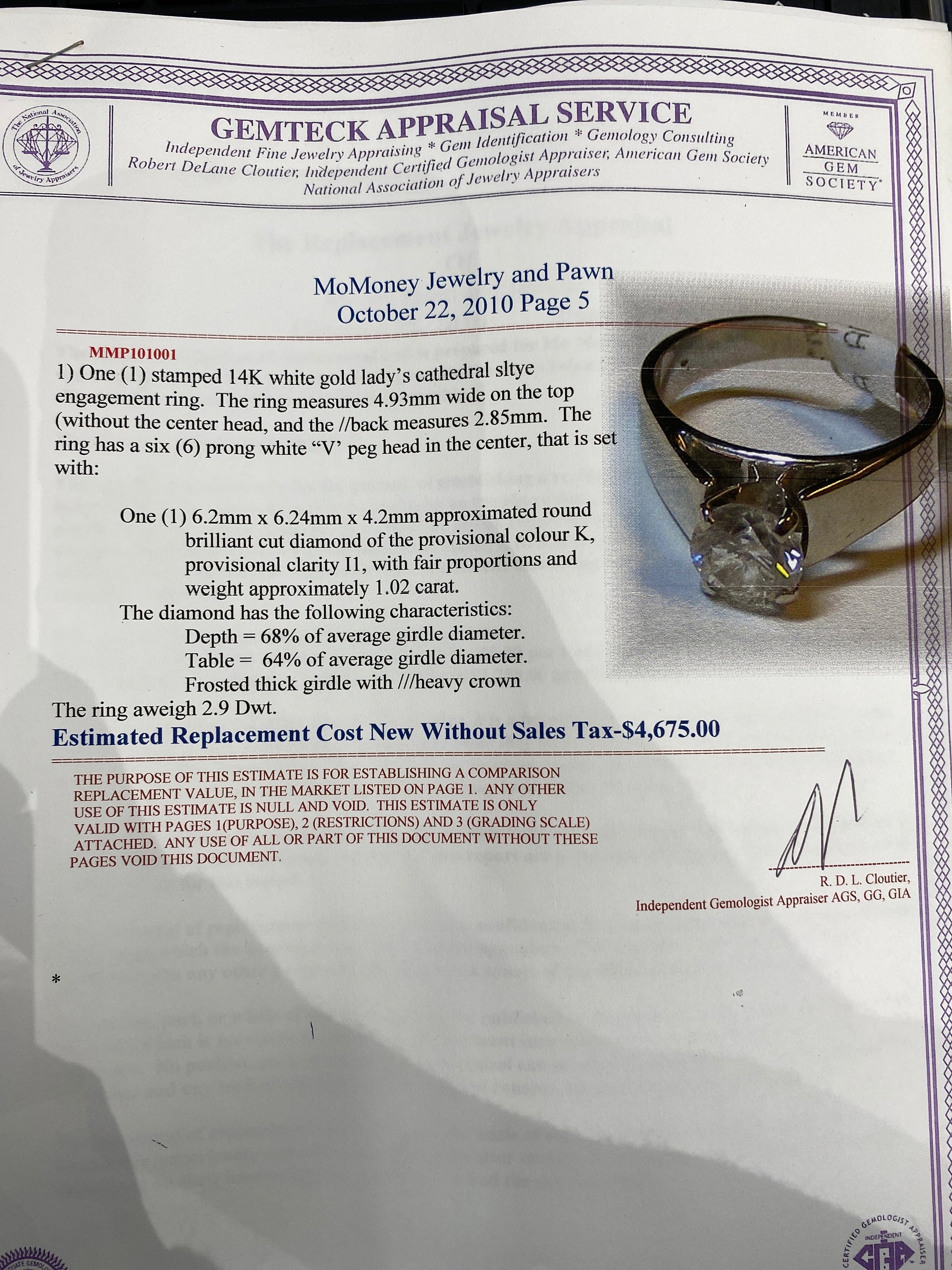 4.6 Grams Of 14k White Gold Diamond Engagement Ring. Engagement Ring Has A 1.02CT Round Diamond in The Center With A Clarity & Color Of (I-1-K). Engagement Ring Is A Size 6.25 & Comes With A Appraisal.