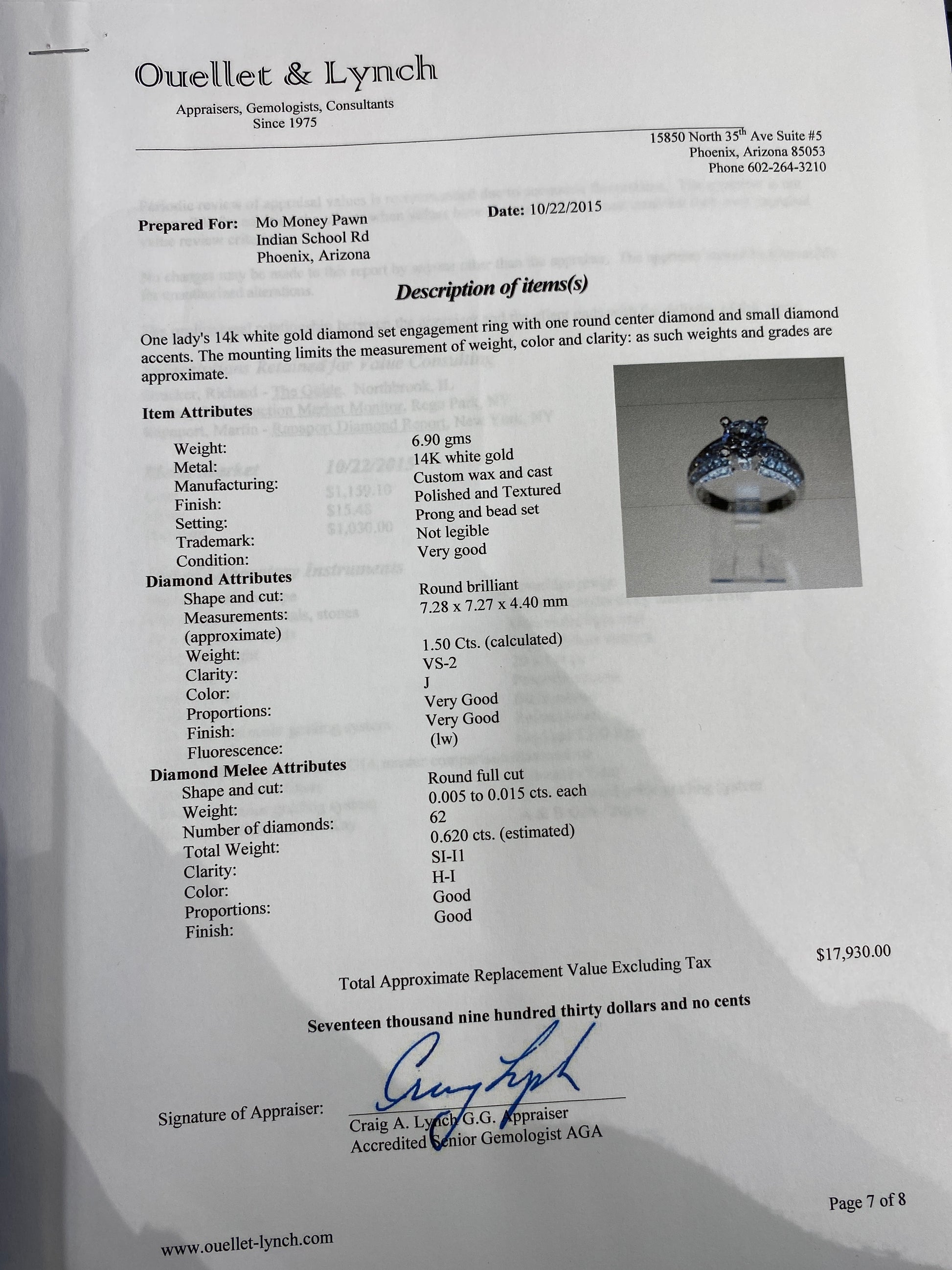 6.9 Grams Of 14k White Gold Diamond Engagement Ring. Engagement Ring Has A 1.50CT Round Diamond In The Center With A Clarity & Color Of (VS-2-J). Engagement Ring Also Has 0.62CTW Of Round Diamonds On The Band With Clarity & Color Of (SI/I1 - H-I). Engagement Ring Is A Size 6.5 & Comes With An Appraisal.