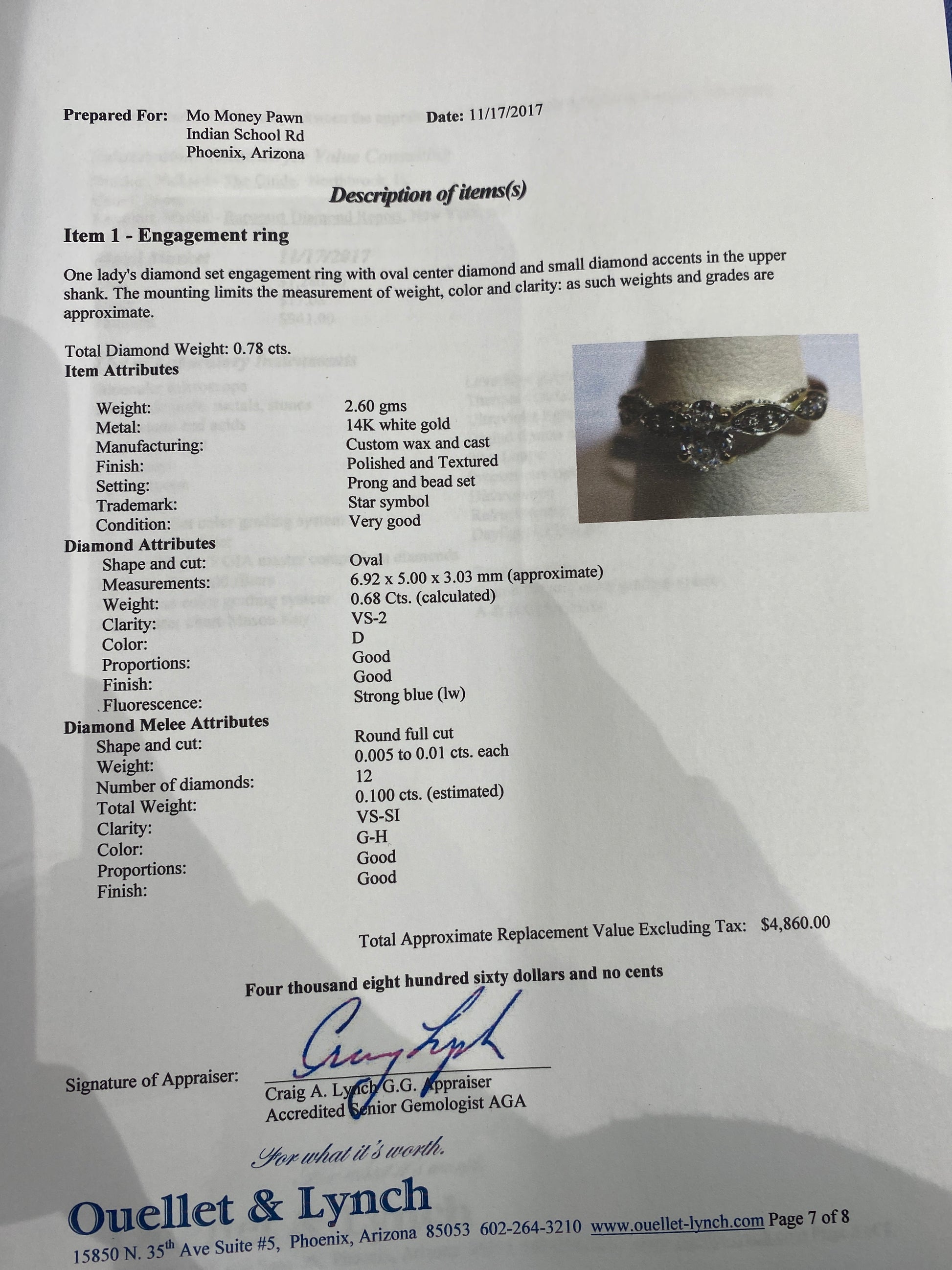 2.6 Grams Of 14k White Gold Engagement Ring. Engagement Ring Has A 0.68CT Oval Cut Diamond In The Center With A Clarity & Color Of (VS-2-D). Engagement Ring Also Has 0.10CTW Of Diamonds On The Band With A Clarity Of (VS/SI) & Color Of (G-H). Engagement Ring Is A Size 6.25 & Comes With A Appraisal.
