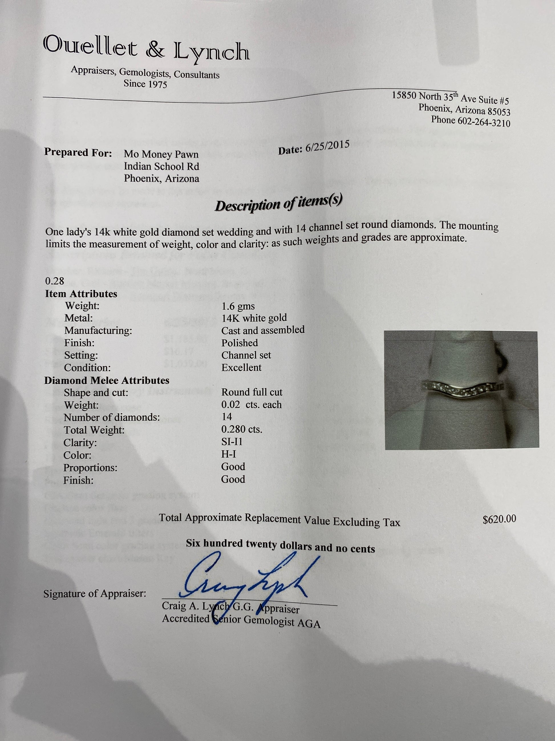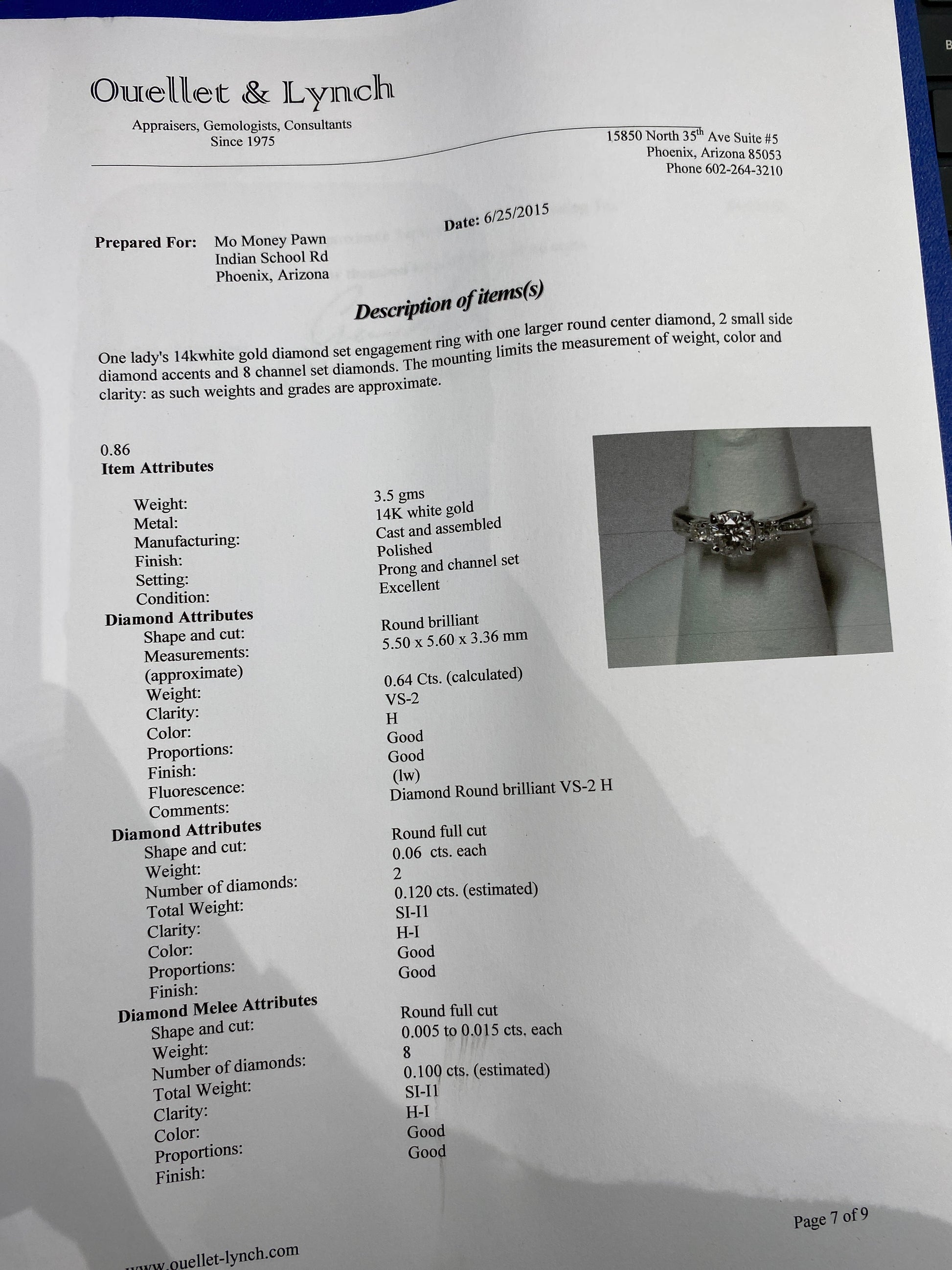 4.8 Grams Of 14k White Gold Diamond Wedding Set. Wedding Set Has A 0.64CT Round Brilliant Diamond In The Center With A Clarity & Color Of (VS-2-H) On The Engagement Ring. Engagement Ring Also Has 0.12CTW Of Round Side Diamonds With A Clarity Of (SI / I1) & Color Of (H / I). Engagement Ring Also Has 0.10CTW Of Round Accent Diamonds With A Clarity Of (SI / I1) & Color (H / I) On The Engagement Ring. Wedding Band Has 0.28CTW Of Round Accent Diamonds With A Clarity (SI / I1) & Color Of (H / I). Wedding Set Is A Size 5.5 & Comes With An Appraisal.