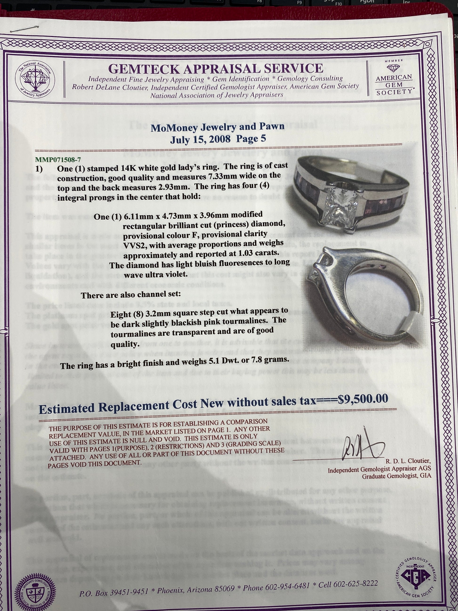 7.9 Grams Of 14k White Gold Diamond & Pink Tourmaline Ring. Ring Has A Rectangle Brilliant Cut Princess Diamond In The Center That Is 1.03CT With A Clarity & Color Of (VVS-2-F). Ring Has (8) 3.2MM Square Cut Pink Tourmalines On The Side Of The Band. Ring Is A Size 5.5. Ring Comes With An Appraisal.