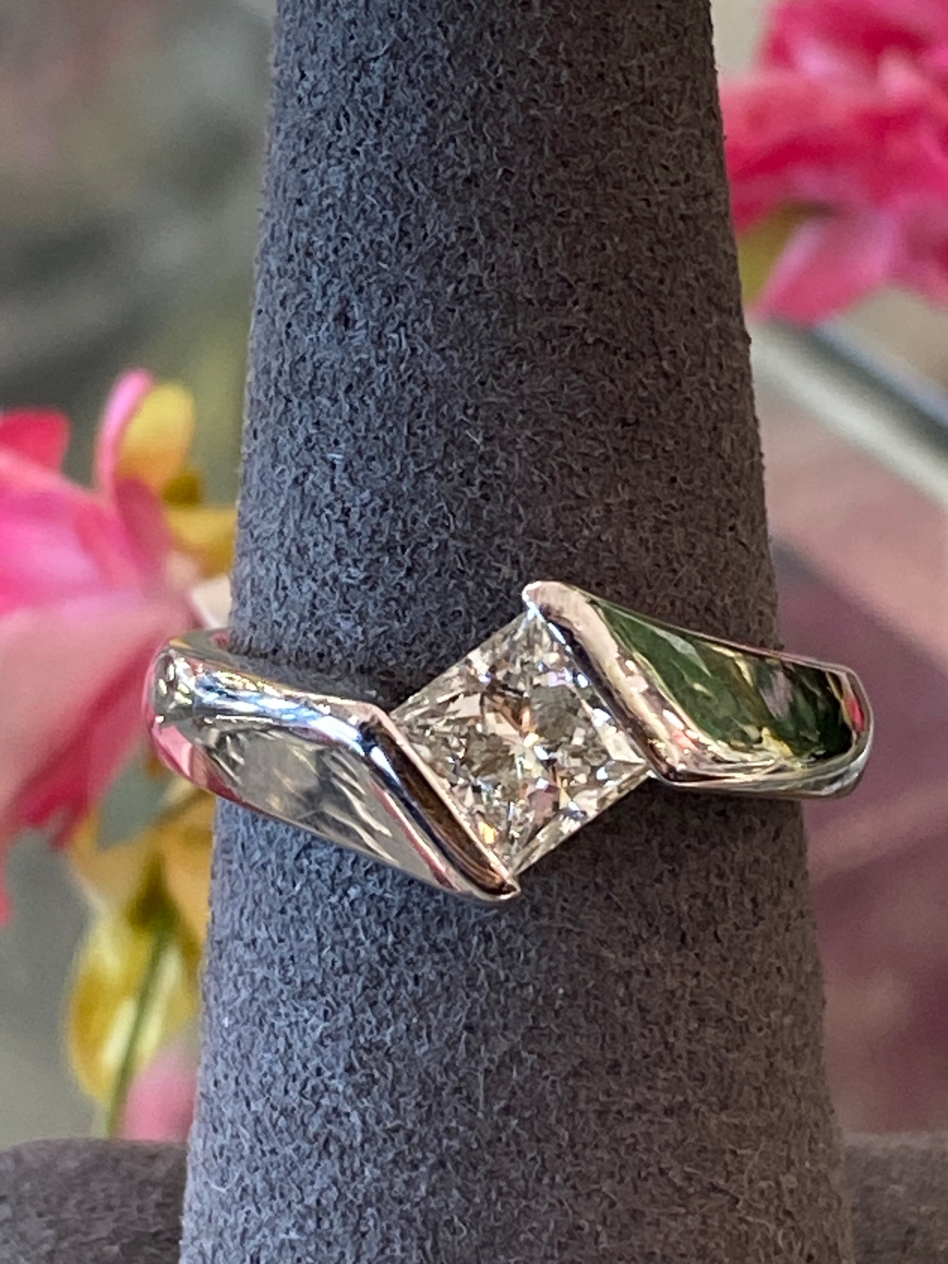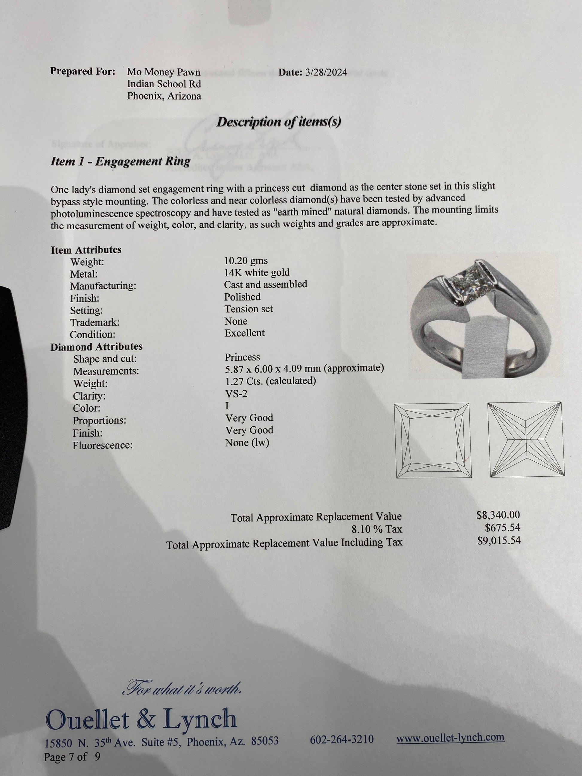 10.2 Grams Of 14k White Gold Diamond Ring. Diamond Ring Has A 1.27CT Princess Cut Diamond In The Center With A Clarity & Color of (VS-2-I). Diamond Ring Is A Size 7.25 & Comes With An Appraisal.