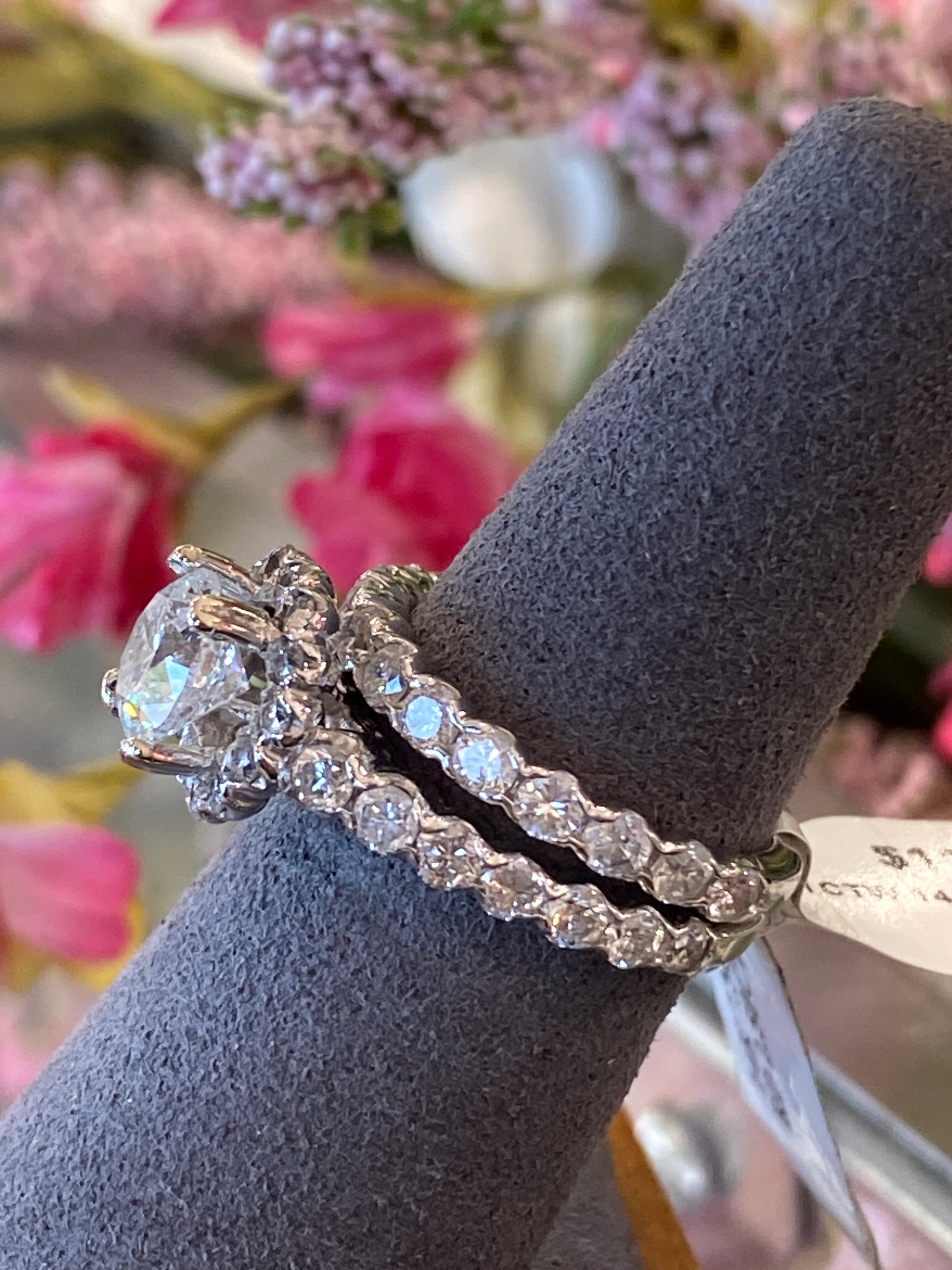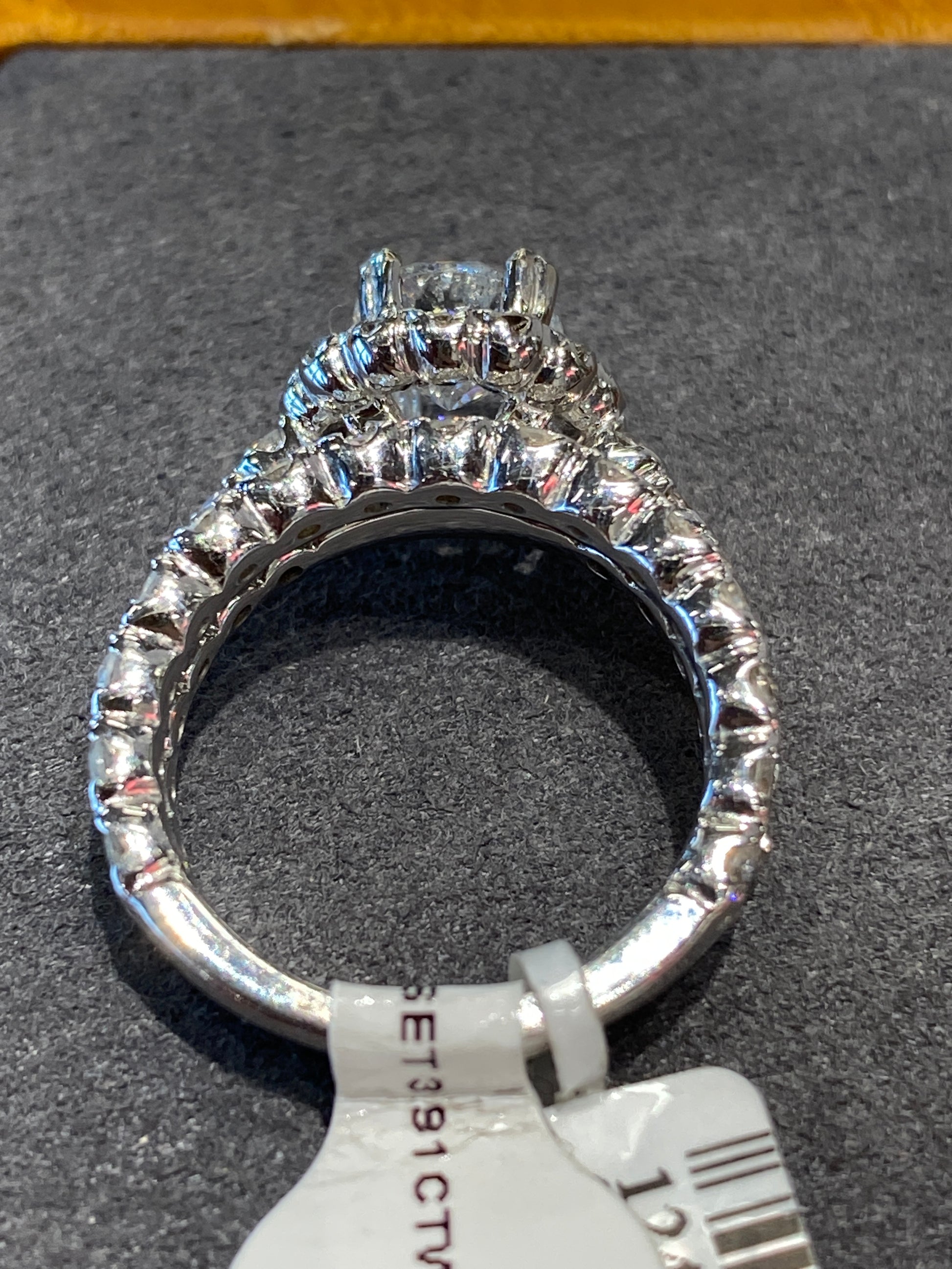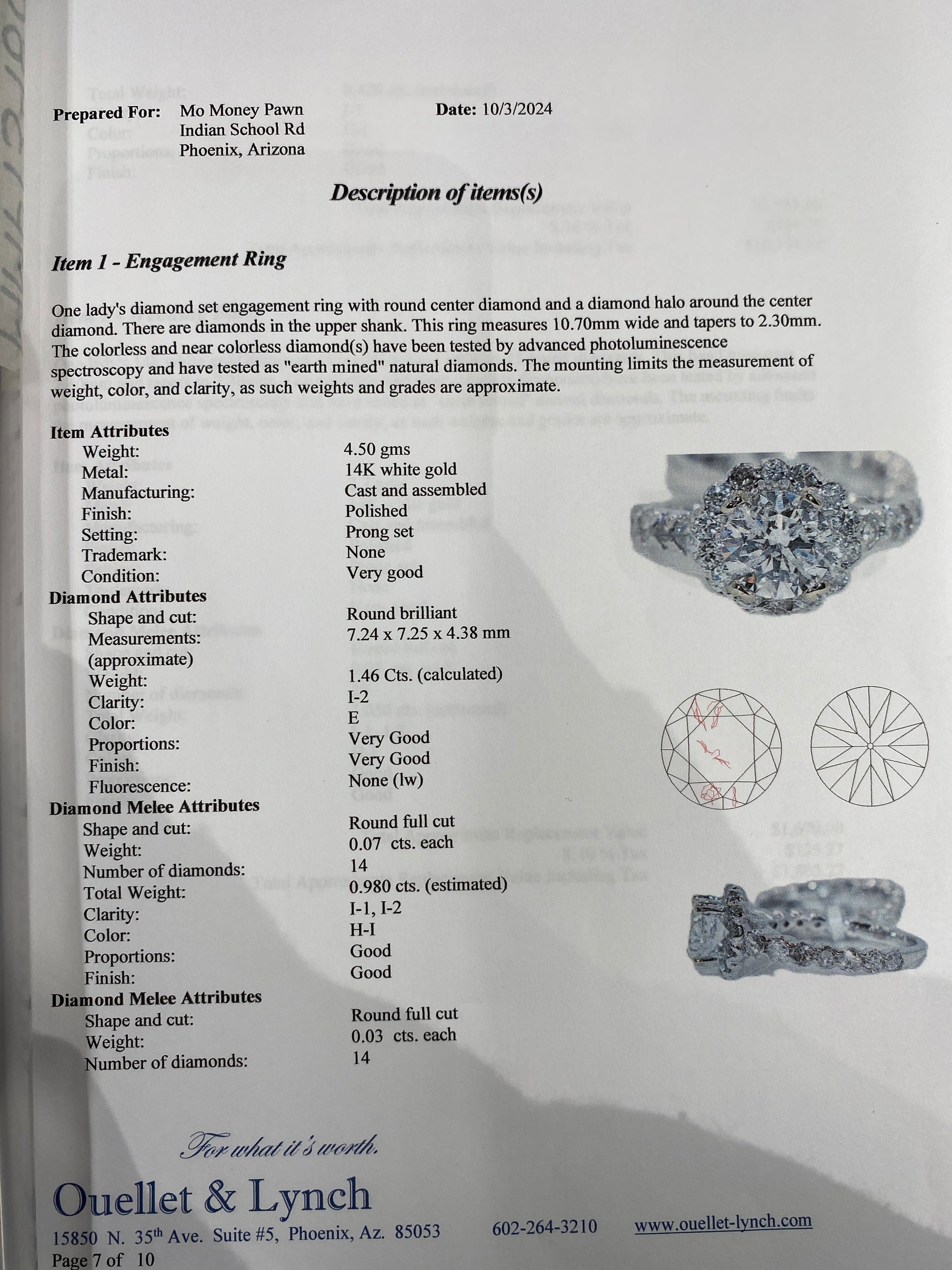 8.0 Grams Of 14k White Gold Diamond Wedding Set. Engagement Ring Has A 1.46CT Round Diamond In The Center With A Clarity & Color Of (I-2-E). Engagement Ring Also Has 14 Round Diamonds With A Diamond Weight Of 0.98CTW & A Clarity Of (I-1 / I-2) & Color Of ( H / I). Engagement Ring Also Has 14 Round Diamonds With A Weight Of 0.42CTW & A Clarity Of (I-1) & Color Of (H / I). Diamond Wedding Band Has 15 Round Diamonds With A Total Diamond Weight Of 1.05CTW & A Clarity Of ( I-1 / I-2) & Color Of (H / I). Wedding Set Is A Size 6.25 & Comes With An Appraisal.