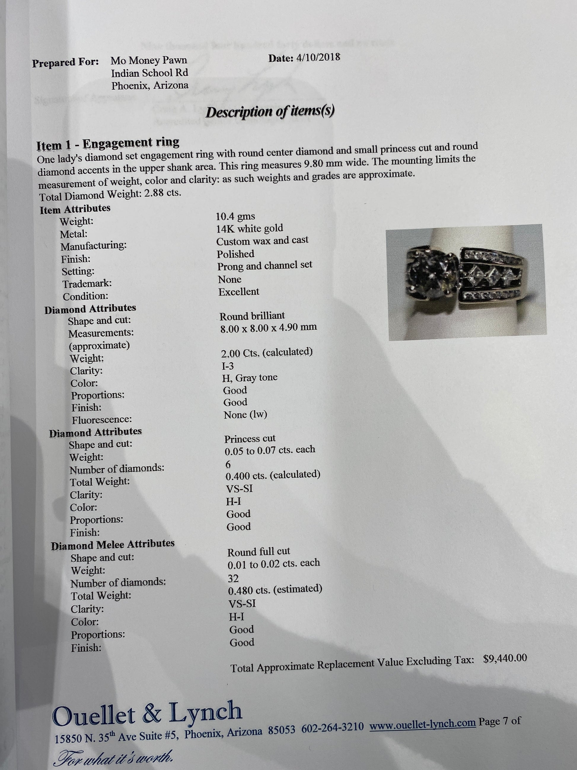 10.4 Grams Of 14k White Gold Diamond Engagement Ring. Engagement Ring Has A 2.00CT Salt & Pepper Round Diamond In The Center With A Clarity & Color Of (I-3-H). Engagement Ring Also Has 0.40CTW Of Princess Cut Diamonds On The Band With A Clarity Of (VS-SI) & Color Of (H-I). Engagement Ring Also Has 0.48 CTW Of Round Diamonds On The Band With A Clarity Of (VS-SI) & Color Of (H-I). Engagement Ring Is A Size 7 & Comes With An Appraisal.