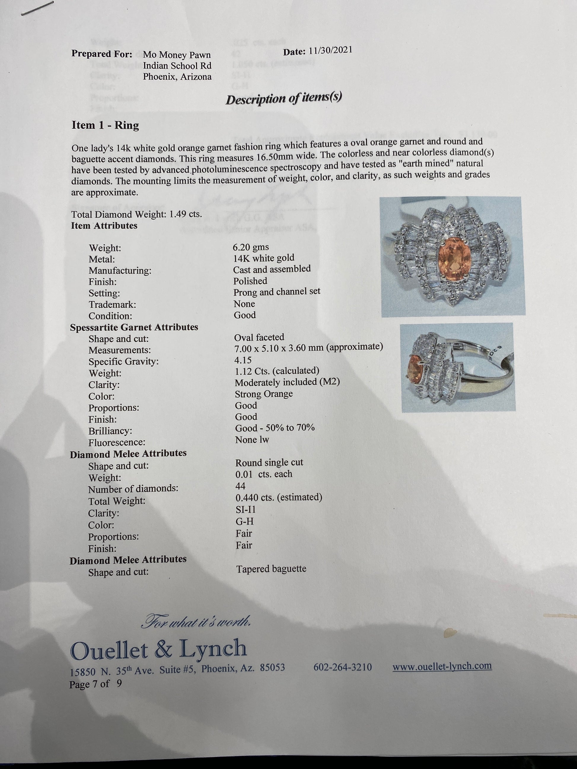 6.2 Grams Of 14k White Gold Ring With A Orange Garnet & Diamonds. Ring Is A Size 8 & has An Appraisal.