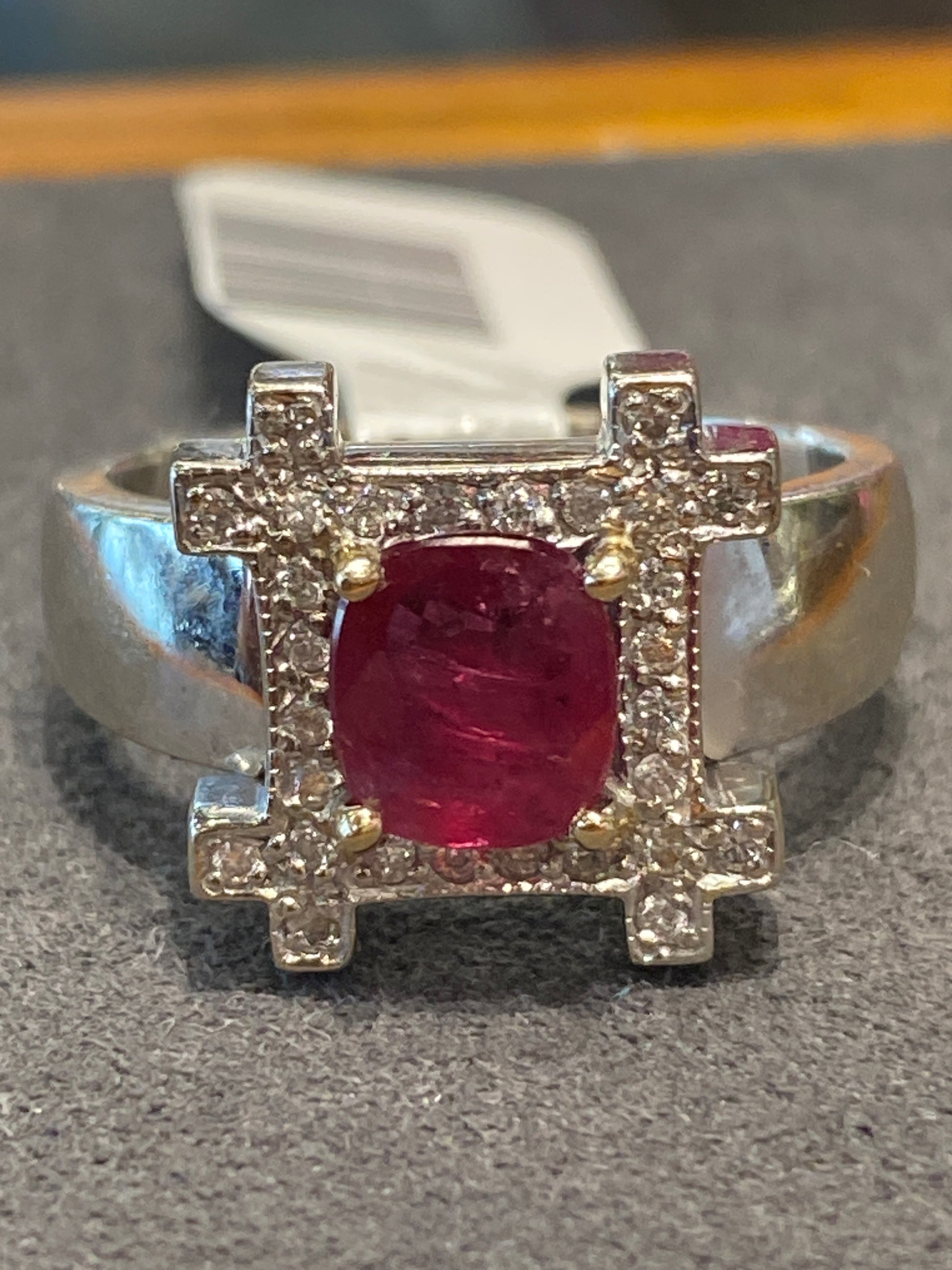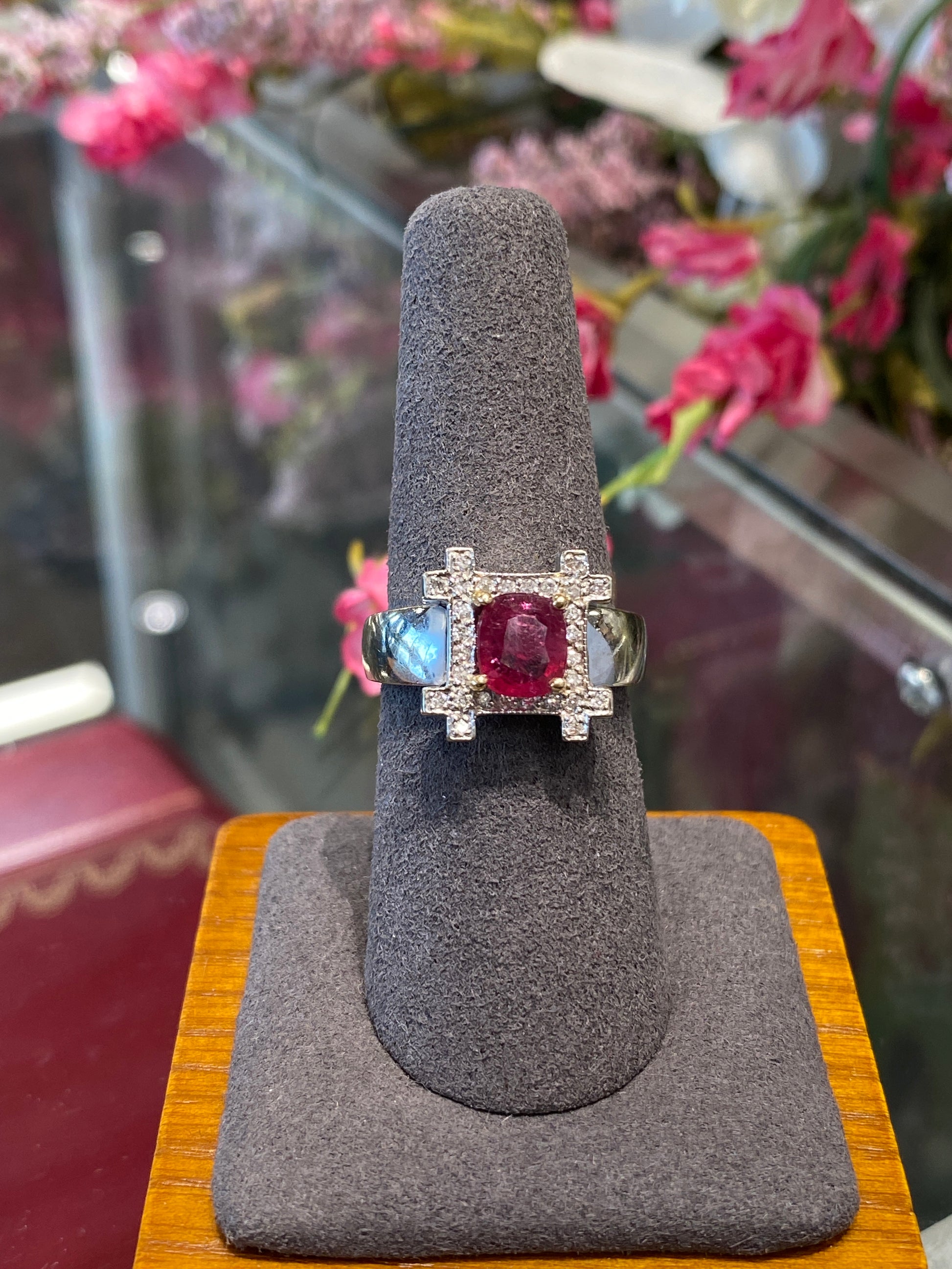 Ring Has A 1.26CT Cushion Cut Ruby & 0.28CTW Or Round Diamonds.