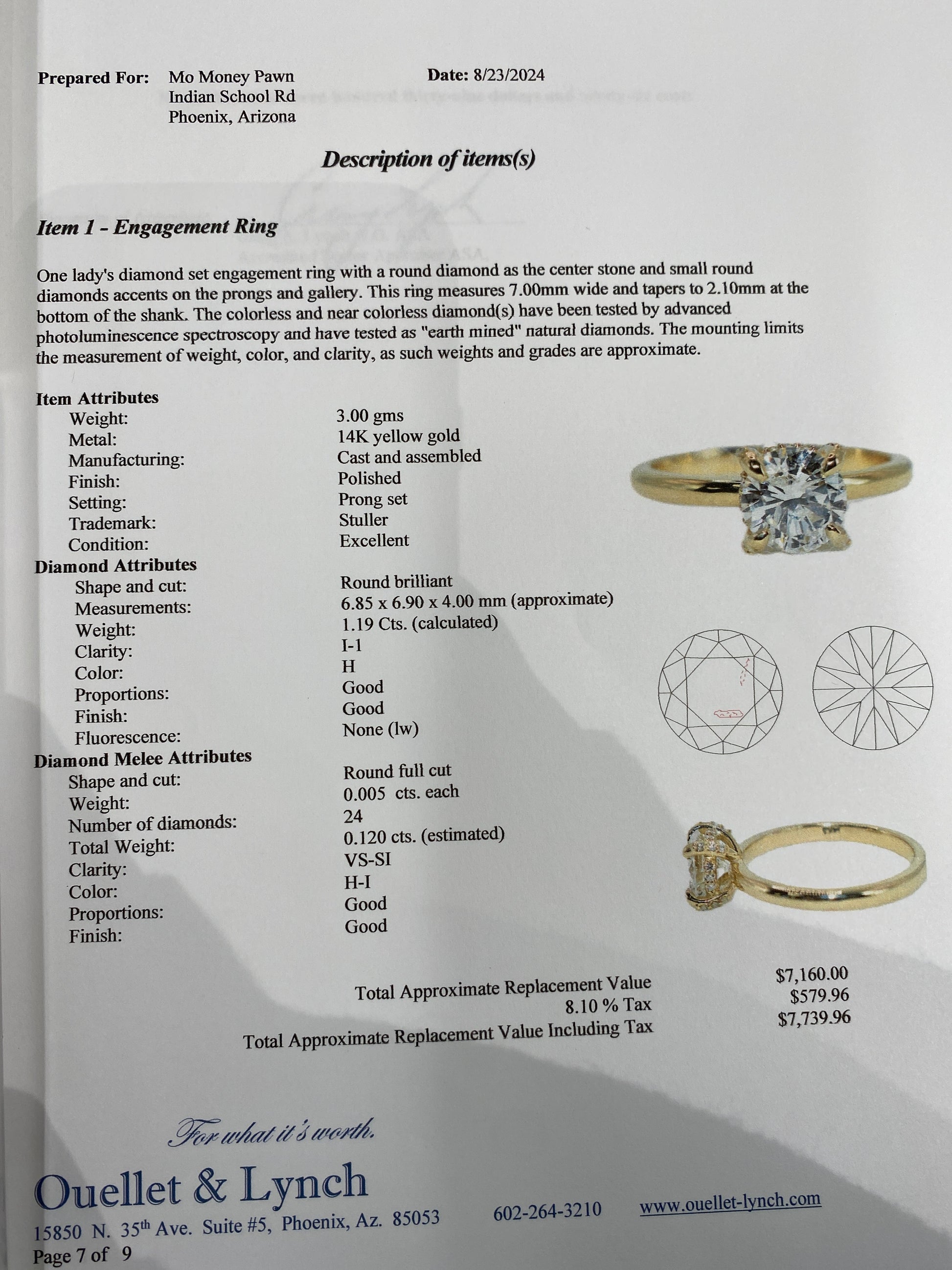 3.3 Grams Of 14K Yellow Gold Engagement Ring. Engagement Ring Has A 1.19CT Round Brilliant Diamond In The Center With A Clarity & Color Of (I-1-H). Engagement Ring Also Has 0.12CTW Of Round Diamonds On The Head Of The Ring With A Clarity Of (VS-SI) & Color Of (H-I). Engagement Ring Is A Size 7 & Comes With An Appraisal.