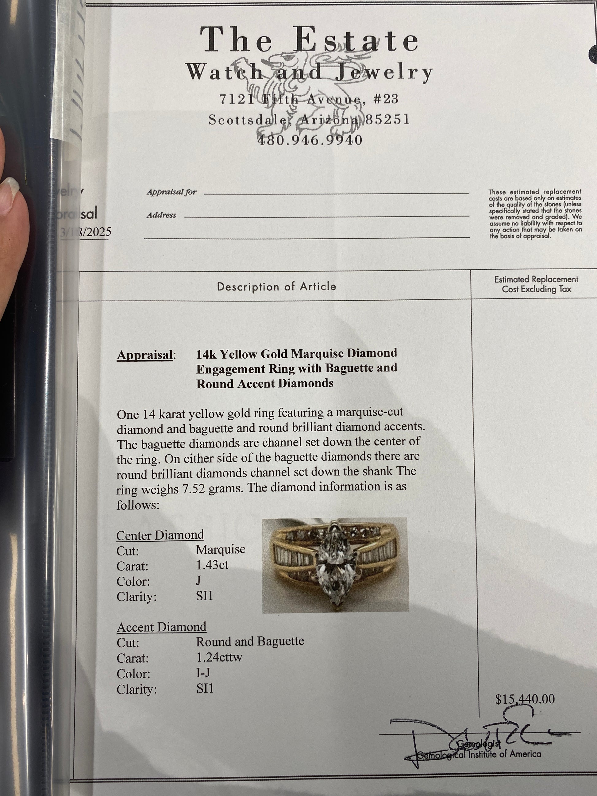 7.5 Grams Of 14k Yellow Gold Diamond Engagement Ring. Engagement Ring Has A 1.43CT Marquise Diamond In The Center With A Clarity & Color Of (SI-1-J). Engagement Ring Also Has 1.24CTW Of Round & Baguette Accent Diamonds With A Clarity & Color Of (SI-1-I / J). Engagement Ring Is A Size 7.5 & Comes With An Appraisal.