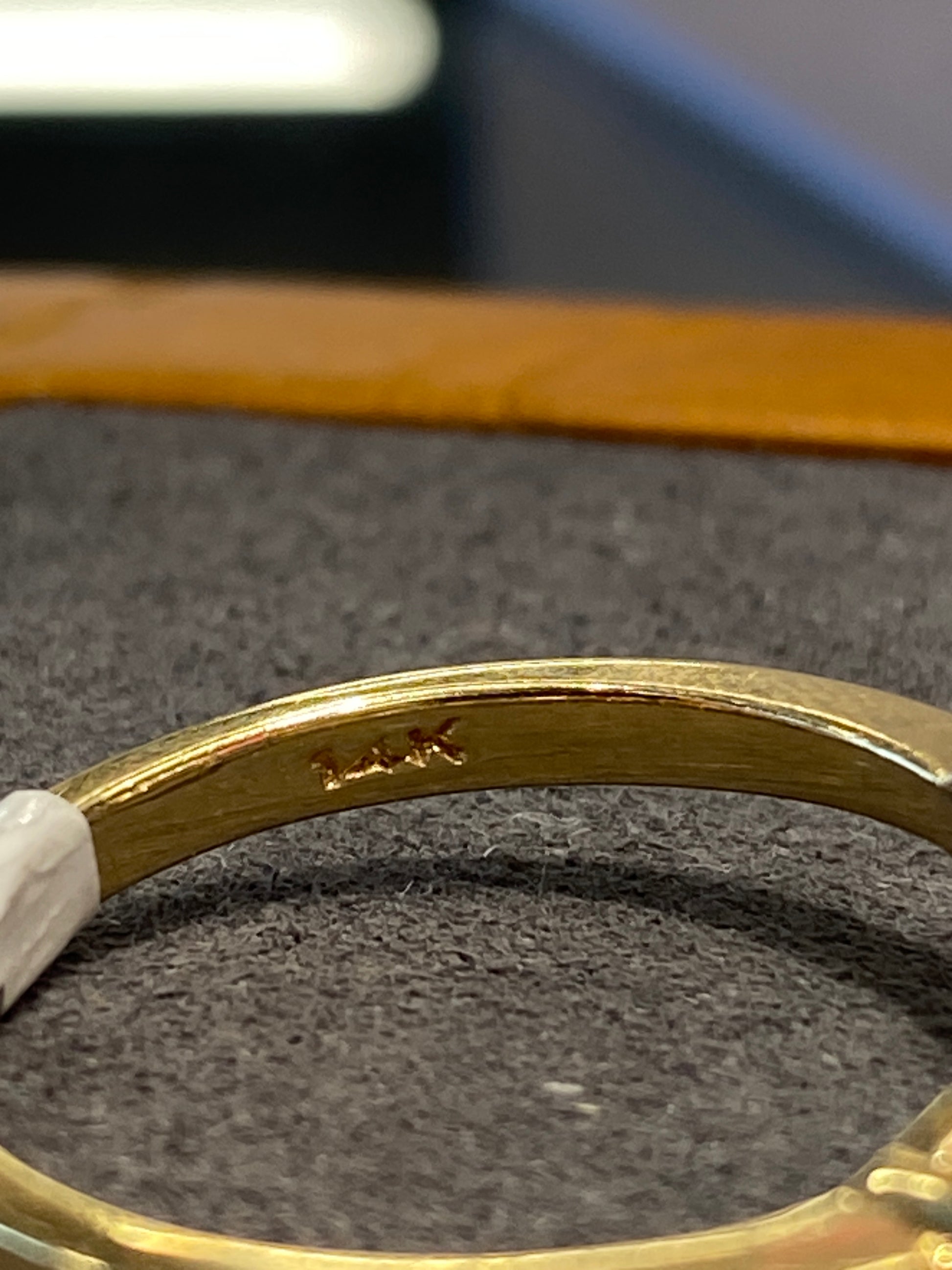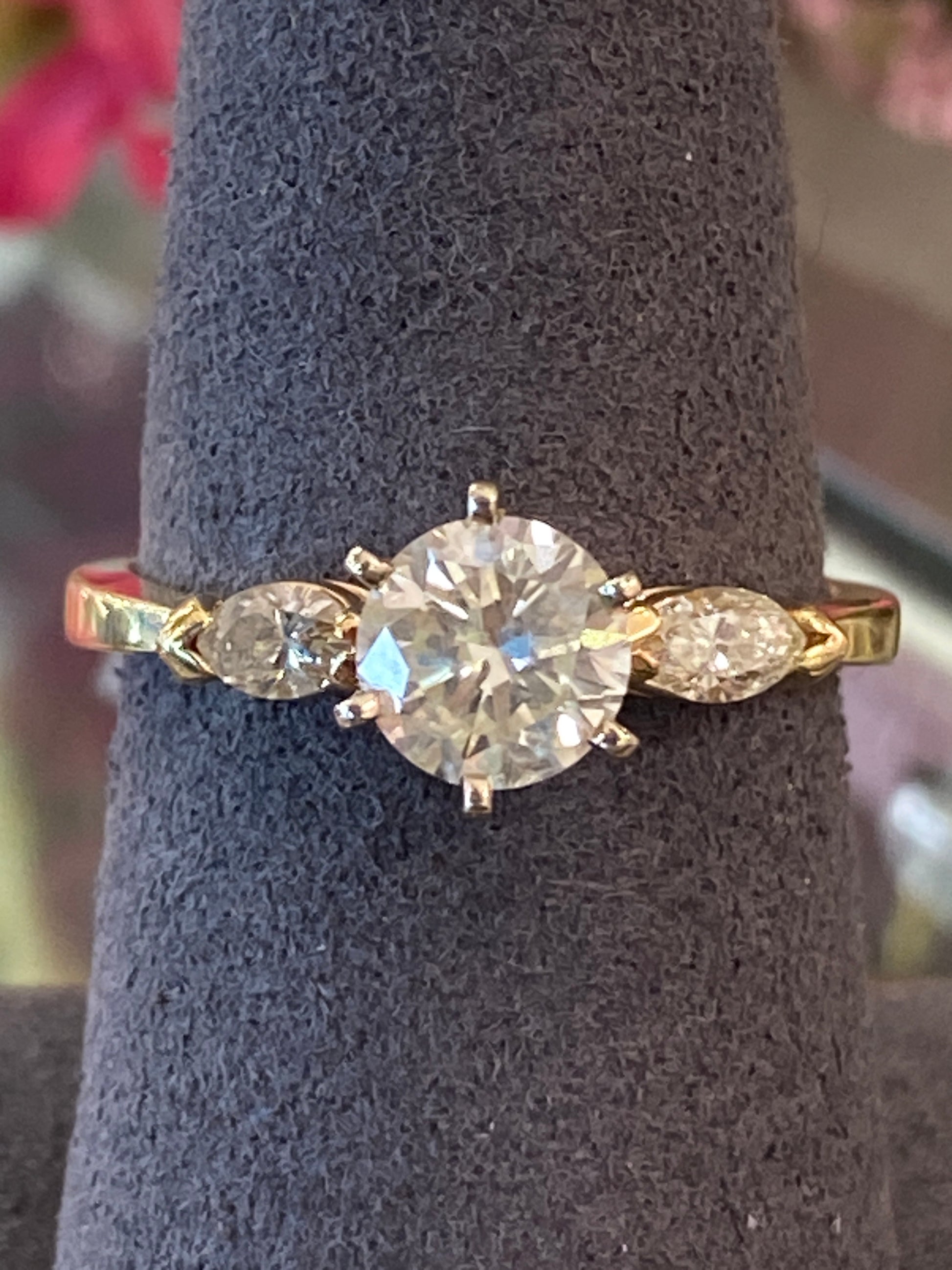 3.5 Grams Of 14k Yellow Gold Diamond Engagement Ring. Engagement Ring Has A 0.96CT Round Diamond In The Center With A Clarity & Color Of (I-1-K). Engagement Ring Also Has 2 Marquise Diamonds On The Side Of The Bands That Are 0.20CTW. Engagement Ring Is A Size 8.