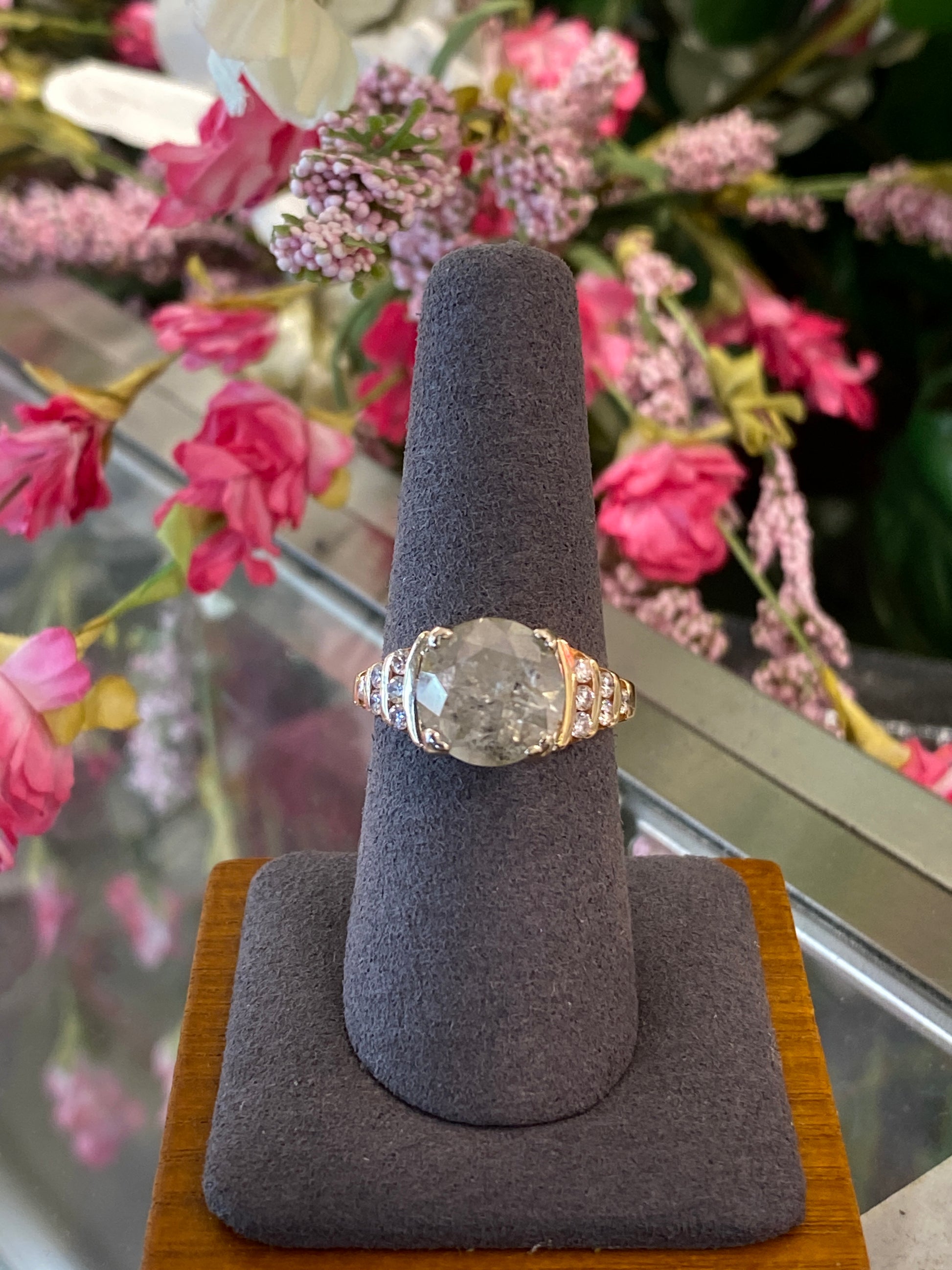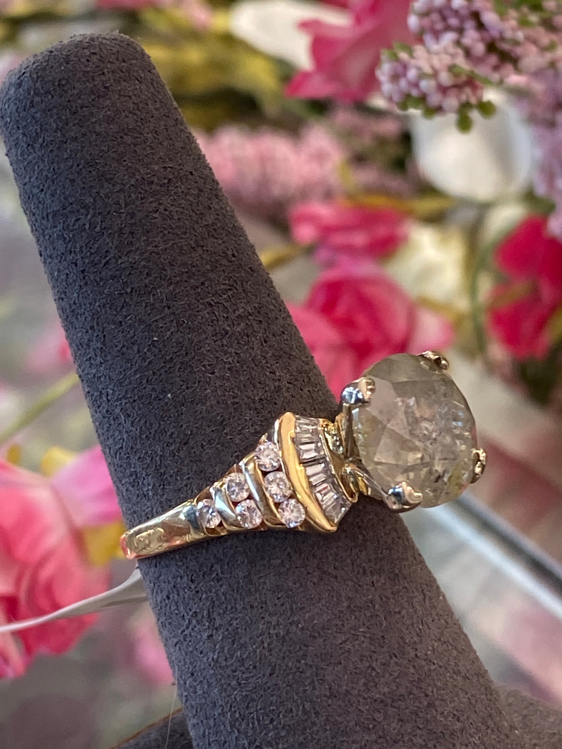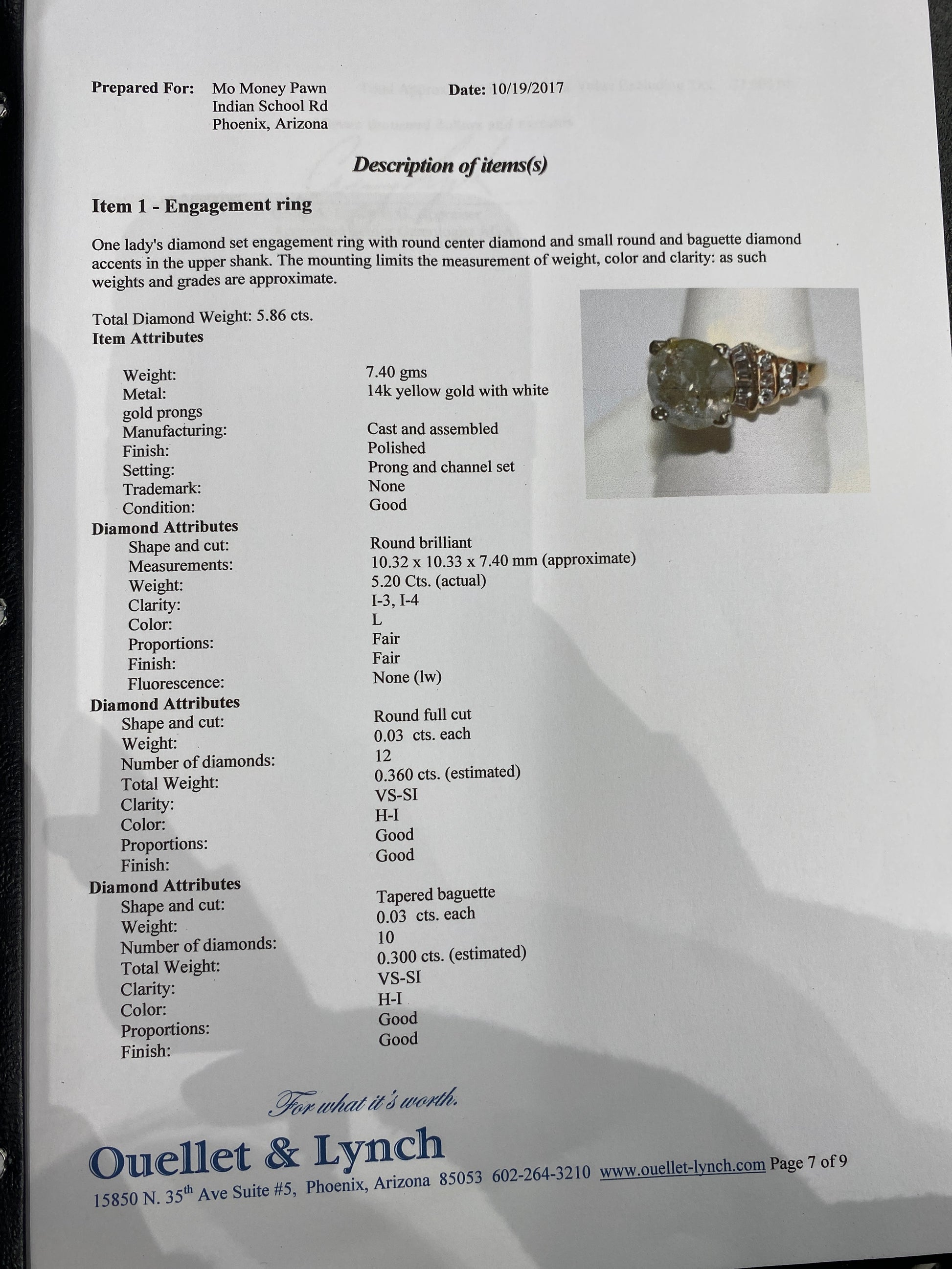 7.4 Grams Of 14k Yellow Gold Diamond Engagement Ring. Engagement Ring Has A 5.20CT Round Diamond In The Center With A Clarity Of (I-3 / I-4). Engagement Ring Also Has 12 Round Accent Diamonds With A Weight Of 0.36CTW & A Clarity Of ( VS / SI) & Color Of ( H / I). Engagement Ring Also Has 10 Tapered Baguettes With A Total Weight Of 0.30CTW. Baguettes Have A Clarity If ( VS / SI) & Color Of ( H / I). Engagement Ring Is A Size 7.5 & Comes With A Appraisal.