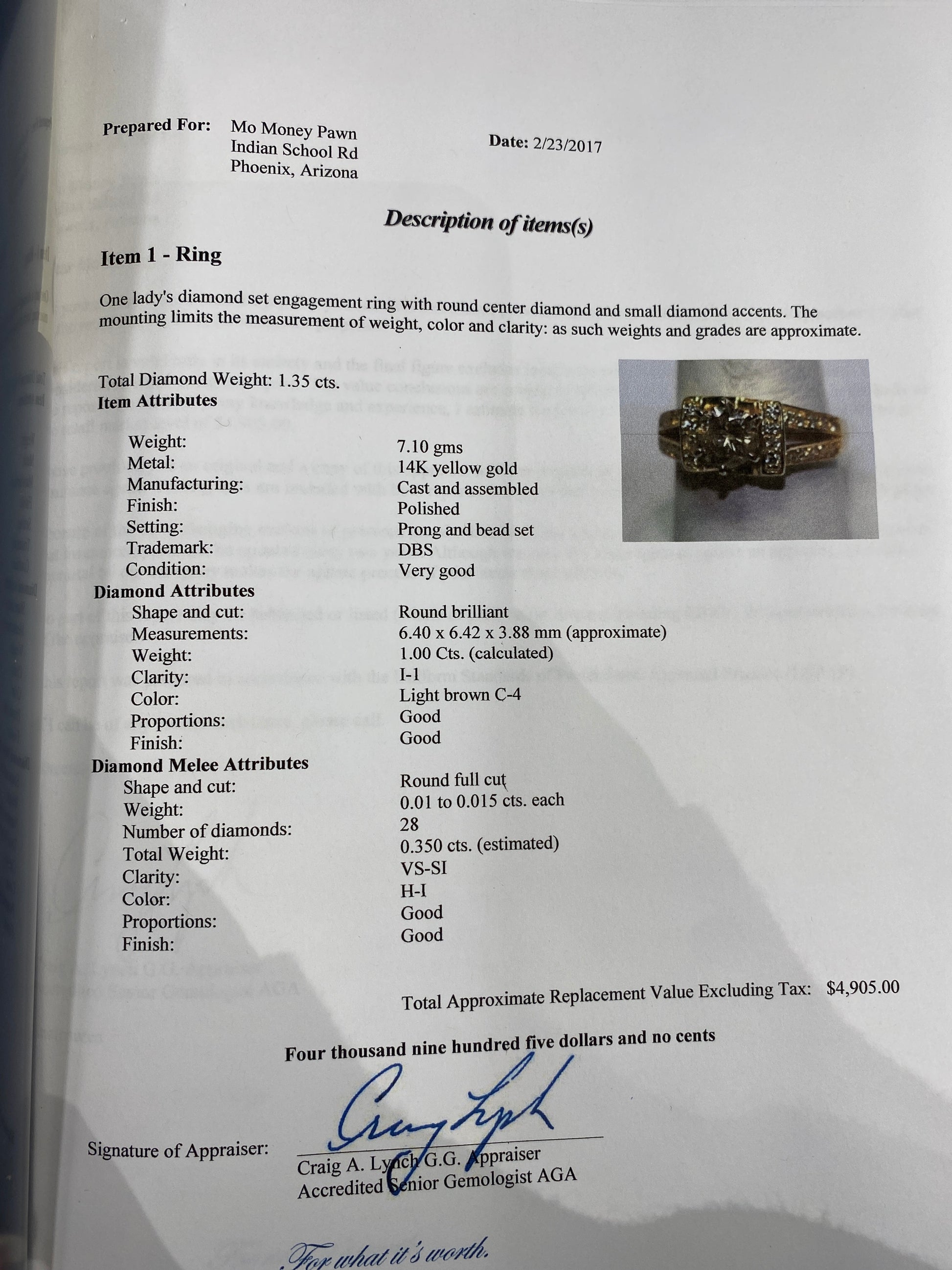 7.1 Grams Of 14k Yellow Gold Diamond Engagement Ring. Engagement Ring Has A 1.00CT Round Diamond With A Clarity & Color Of ( I-1-Light Brown C-4) In The Center. Engagement Ring Also Has 28 Round Diamonds That Have A Total Weight Of 0.35CTW With A Clarity Of (VS - SI) & A Color Of (H - I). Engagement Ring Has A Total Diamond Weight Of 1.35CTW. Engagement Ring Is A Size 7 & Comes With An A Appraisal.