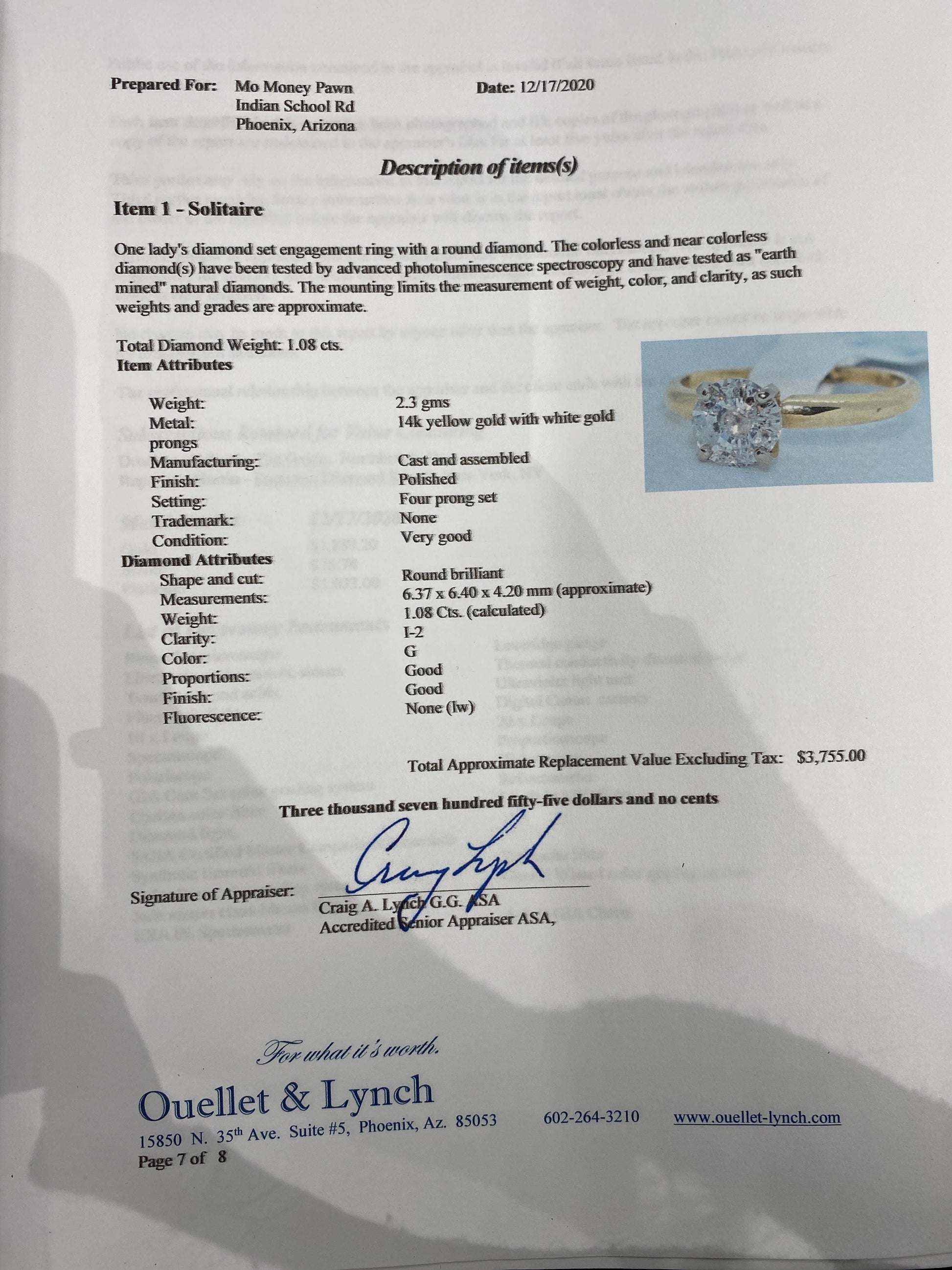 2.3 Grams Of 14k Yellow Gold Diamond Engagement Ring. Engagement Ring Has A 1.08CTW Round Diamond In The Center With A Clarity & Color Of (I-2-G). Engagement Ring Is A Size 6.5 & Comes With An Appraisal.