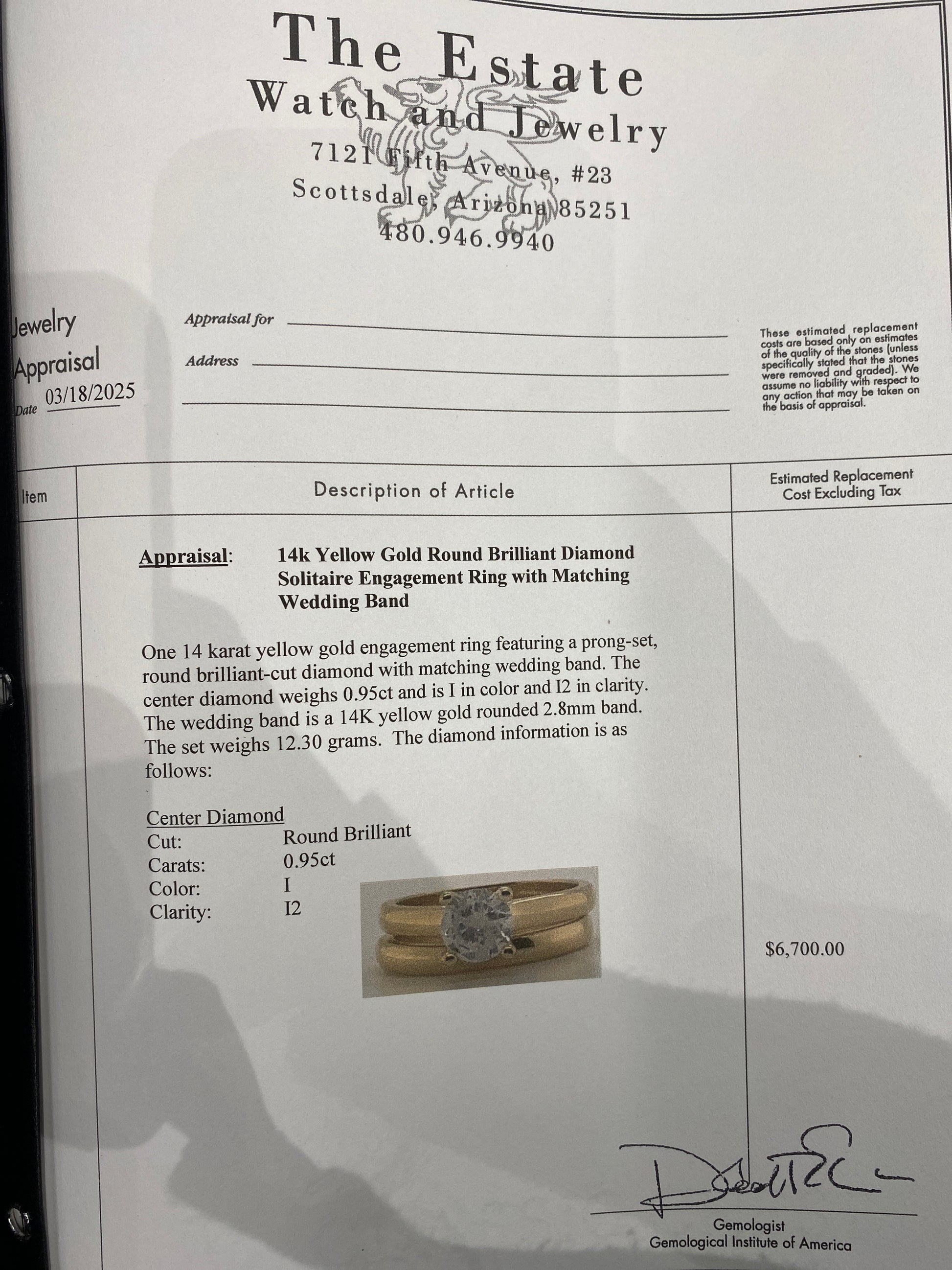 7.0 Grams Of 14k Yellow Gold Diamond Wedding Set. Engagement Ring Has A 0.95CT Round Diamond With A Clarity & Color Of (I-2-I). Wedding Band Is 2.8mm Wide. Wedding Set Is A Size 6.75 & Comes With An Appraisal.