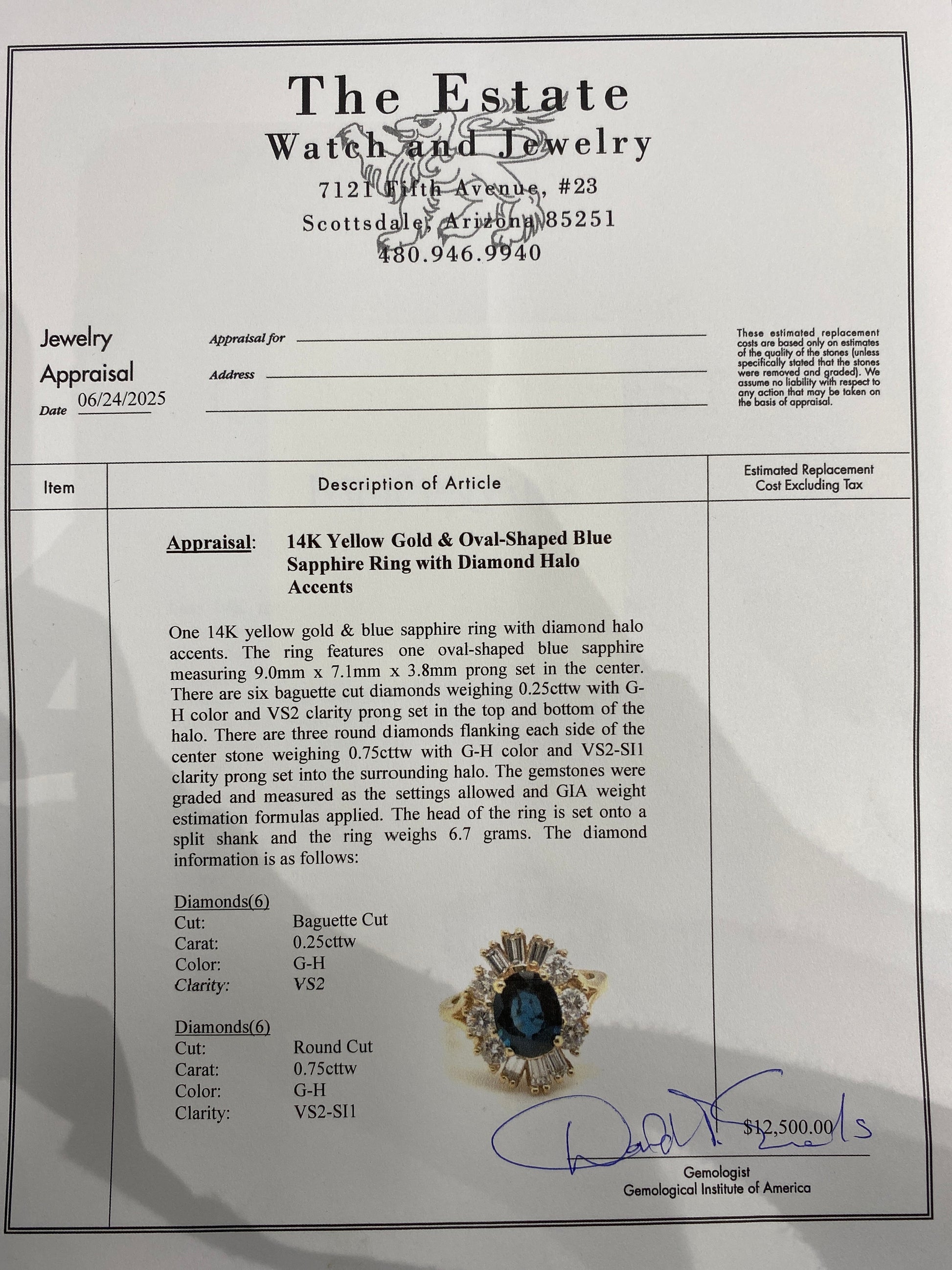 6.7 Grams Of 14k Yellow Gold Sapphire & Diamond Ring. Ring Has A Oval Shaped Sapphire That Measures 9.0MM x 7.1MM x 3.8MM. Ring Also Has 6 Baguette Cut Diamonds Weighing 0.25CTW With A Clarity Of (VS/2) & Color Of (G / H). Ring Also Has 6 Round Diamonds Weighing 0.75CTW With A Clarity Of (VS-2 / SI-1) & Color Of (G/H). Ring Is A Size 6 & Comes With An Appraisal.