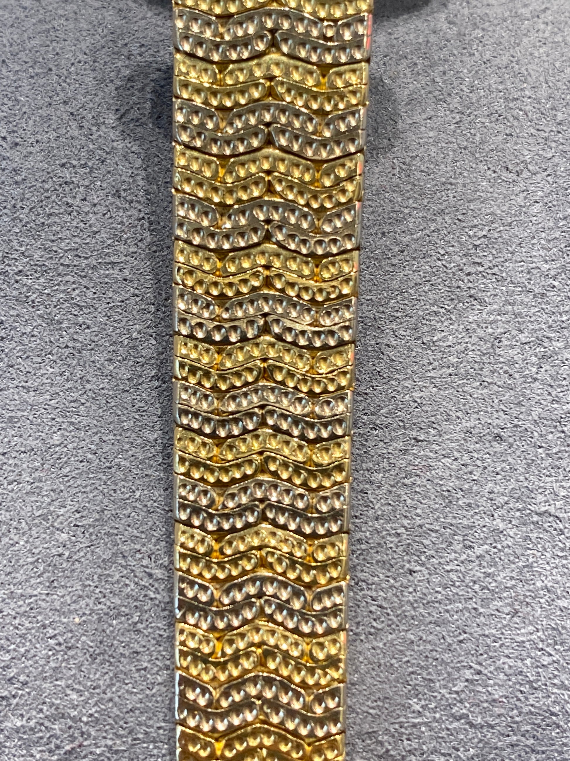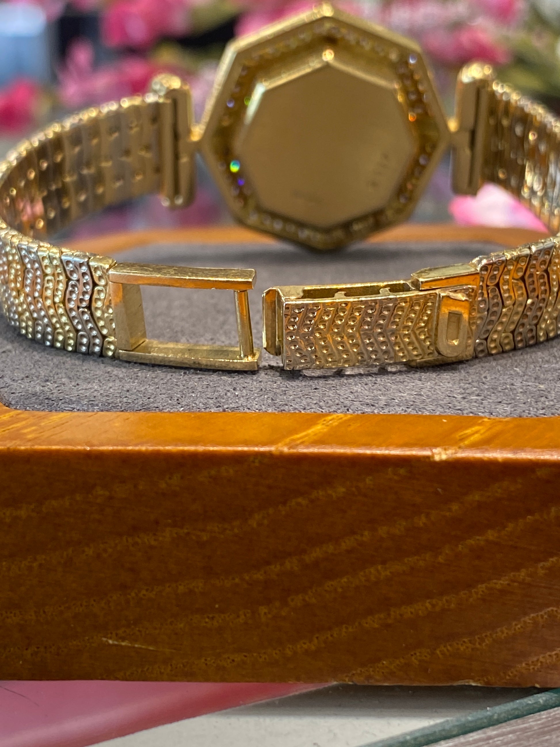 52.9 Grams Of 18k Yellow Gold DeLaneau Ladies Watch. Watch Has A Octagonal Case With Diamonds & A Mother Of Pearl Face. Watch Is 6.5” Long