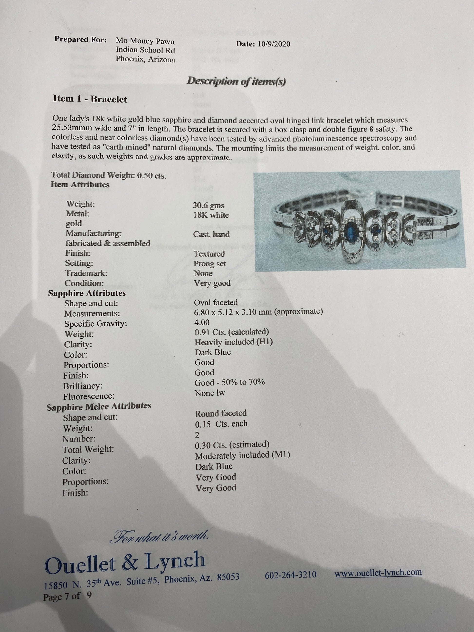 30.6 Grams Of 18K White Gold Diamond & Blue Sapphire Bracelet. Bracelet Has A Oval Blue Sapphire In The Center That Appropriately Measures 6.80 x 5.12 x 3.10mm Which Is 0.91CT. Bracelet Also has 0.30CTW Of Small Round Blue Sapphires. Bracelet Also Has 0.50 CTW Of Round Diamonds With A Clarity Of (SI) & Color Of (H/I). Bracelet Is 7” Long. Bracelet Comes With appraisal