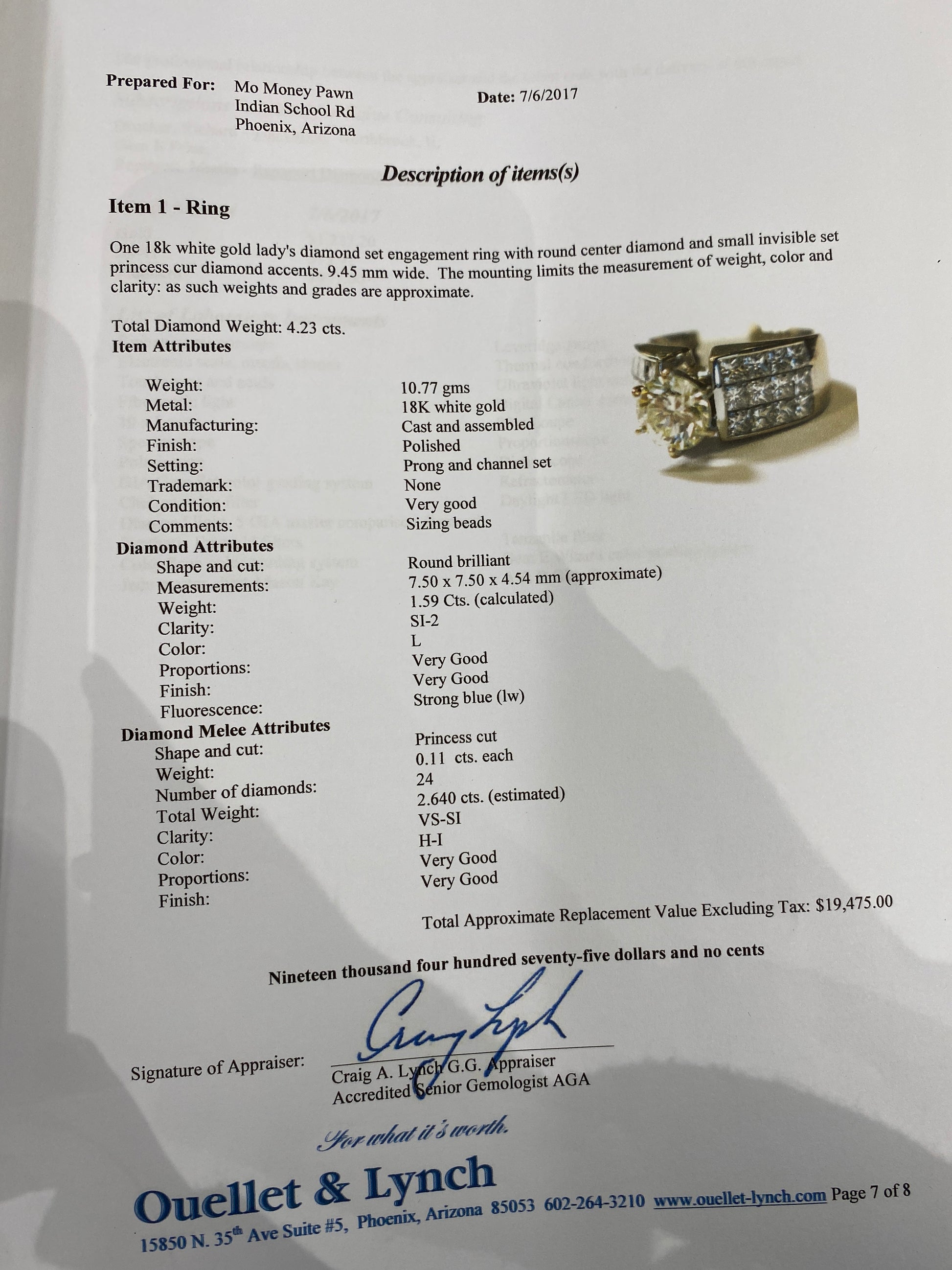 11.5 Grams Of 18k White Gold Diamond Engagement Ring. Engagement Ring Has A Center Round Brilliant Diamond That Is A 1.59CT & Has A Clarity & Color Of (SI-2-L). Engagement Ring Also Has 2.64CTW Of Princess Cut Diamonds On the Band With A Clarity Of (VS-SI) & Color Of (H-I). Engagement Ring Is A Size 7 & Has Sizing Beads Inside The Band. Engagement Ring Comes With Appraisal.