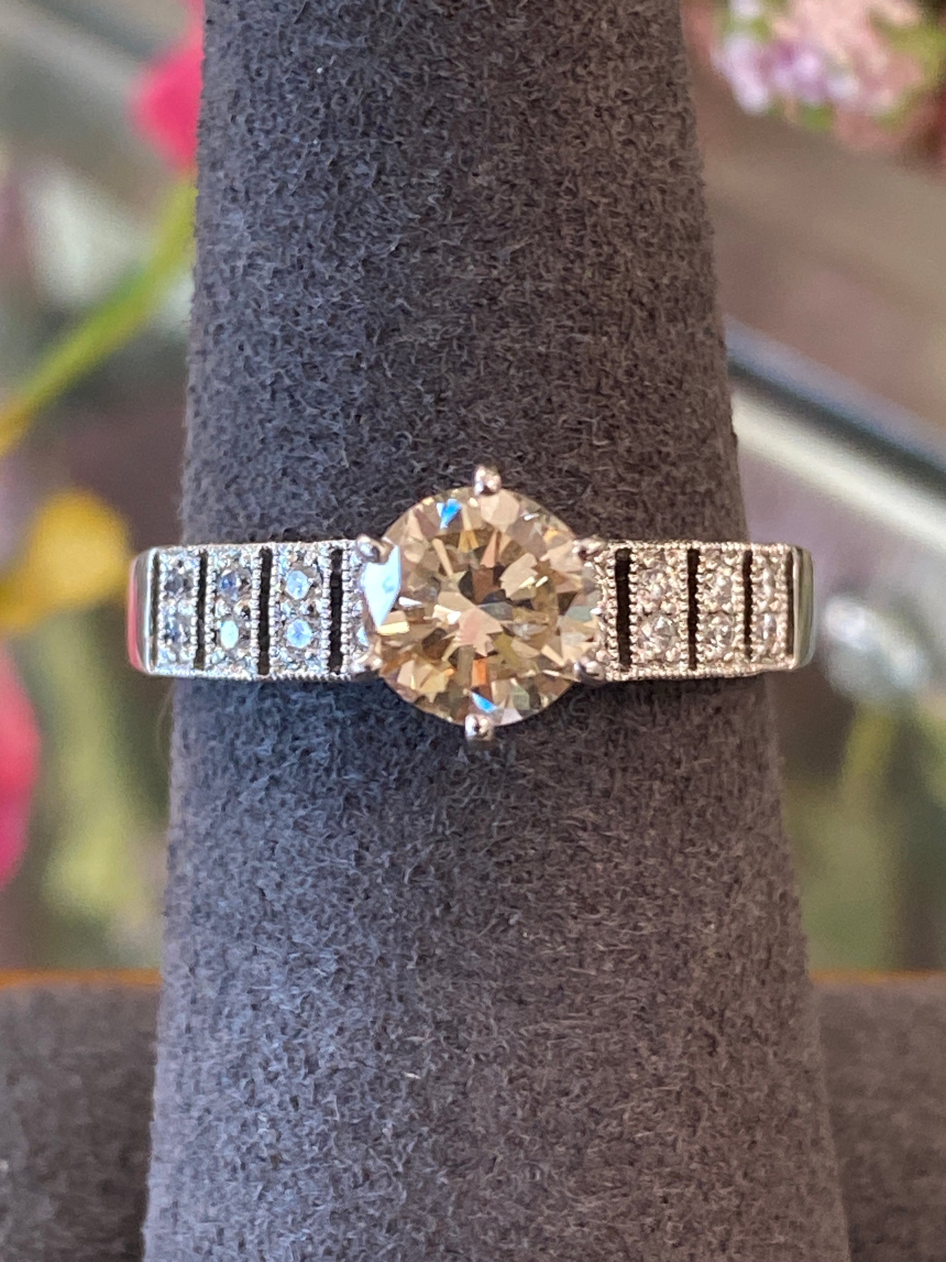 4.7 Grams Of 18k White Gold Diamond Engagement Ring. Engagement Ring Has A 1.02CT Round Brownish/Yellow Diamond In The Center. Engagement Ring Also Has 0.32CTW Of Rond Diamonds On The Side zig The Band. Engagement Ring Is A Size 7.