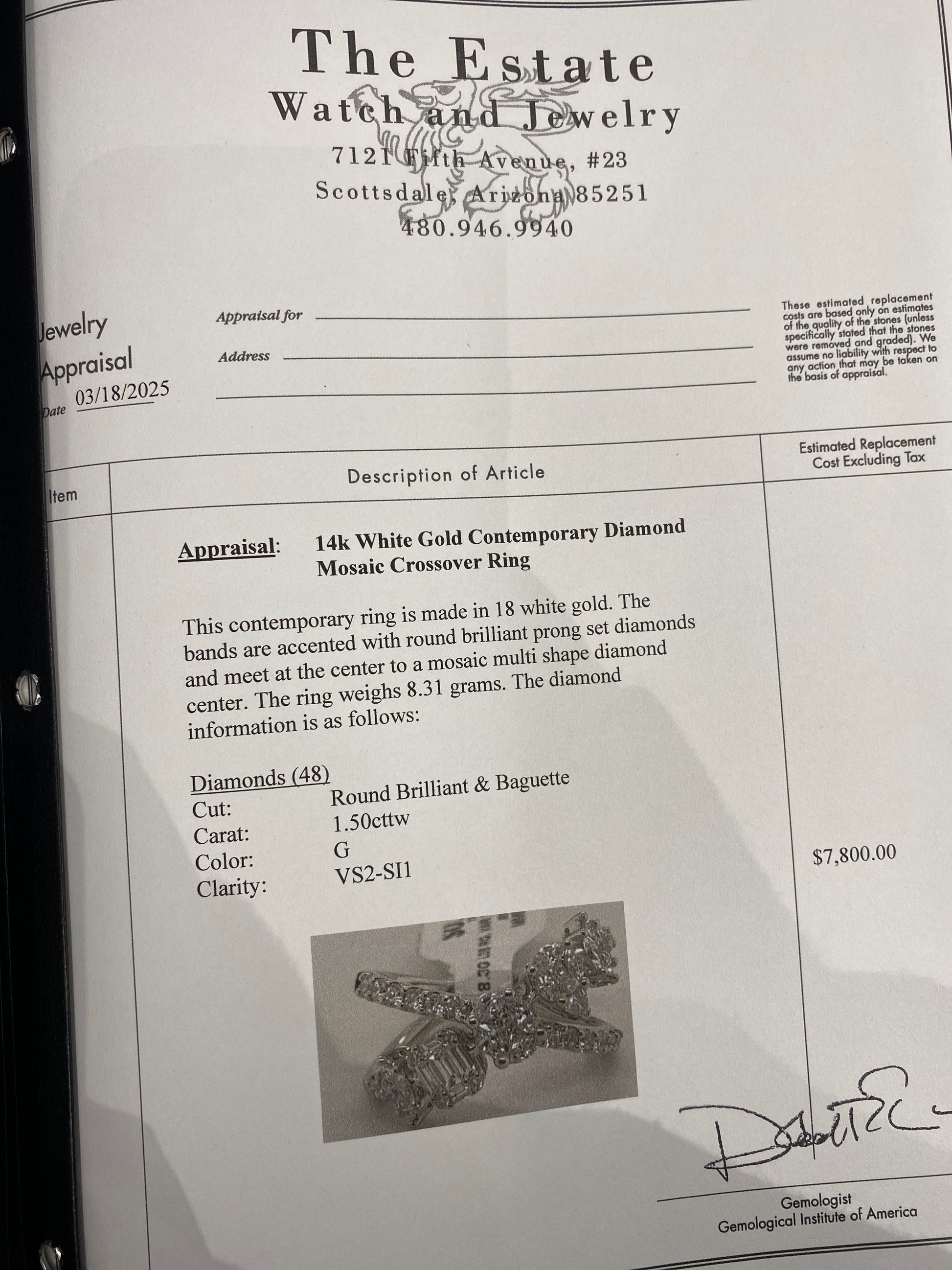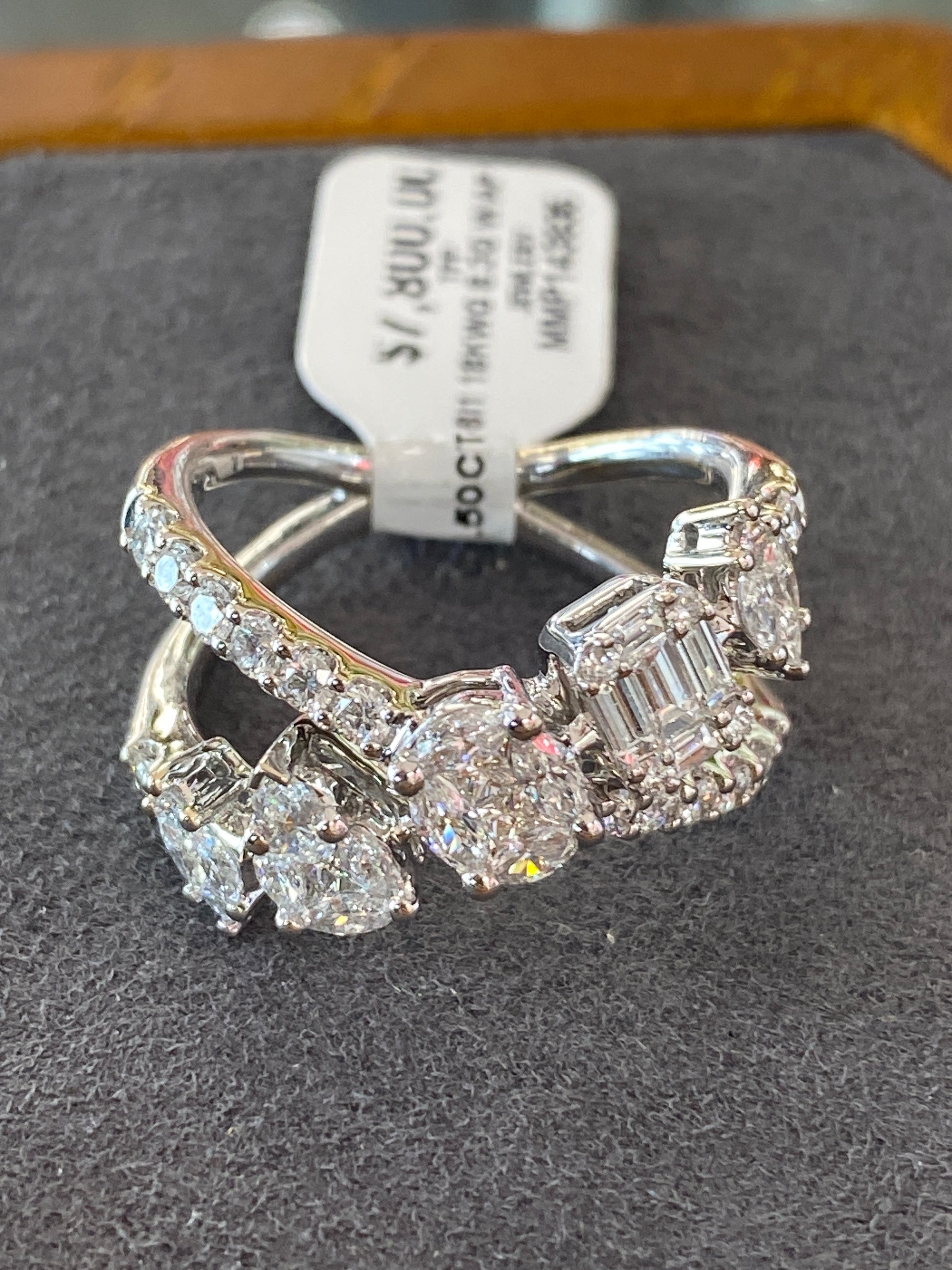 8.3 Grams Of 18k White Gold Diamond Ring. Ring Has 1.50CTW Of Mosaic Multi Shape Diamonds. The Clarity Of The Diamonds Are (VS2-SI1) & A Color Of (G). Ring Is A Size 8.5.