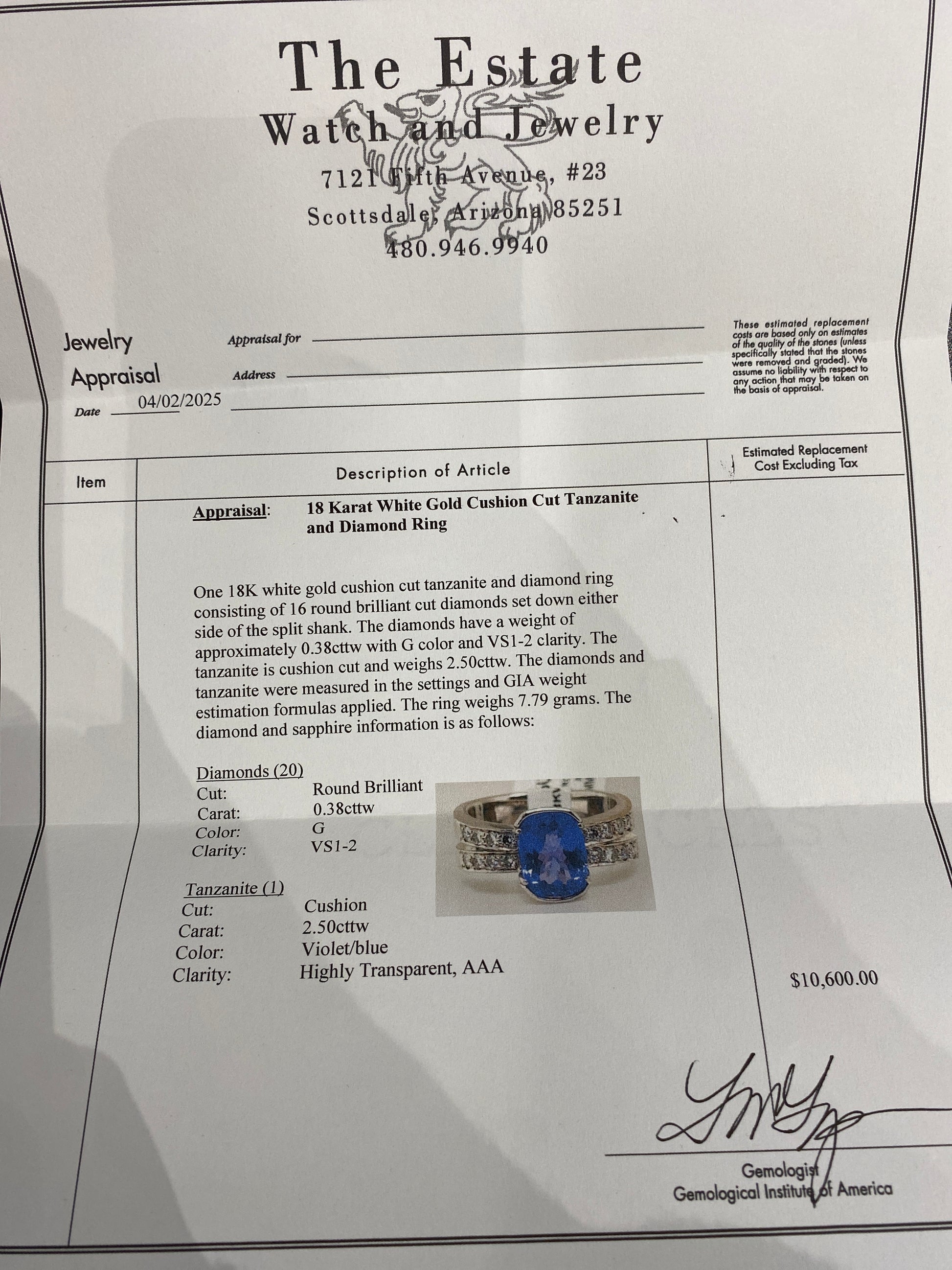 13.6 Grams Of 18k White Gold Tanzanite & Diamond Ring. Ring Has A 2.50CT Cushion Tanzanite In The Center. Ring Also Has 0.38CTW Of Round Accent Diamonds On The aside Of The Band With Clarity & Color Of ( VS-1/2 -G). Ring Is A Size 7.5 & Comes With An Appraisal.