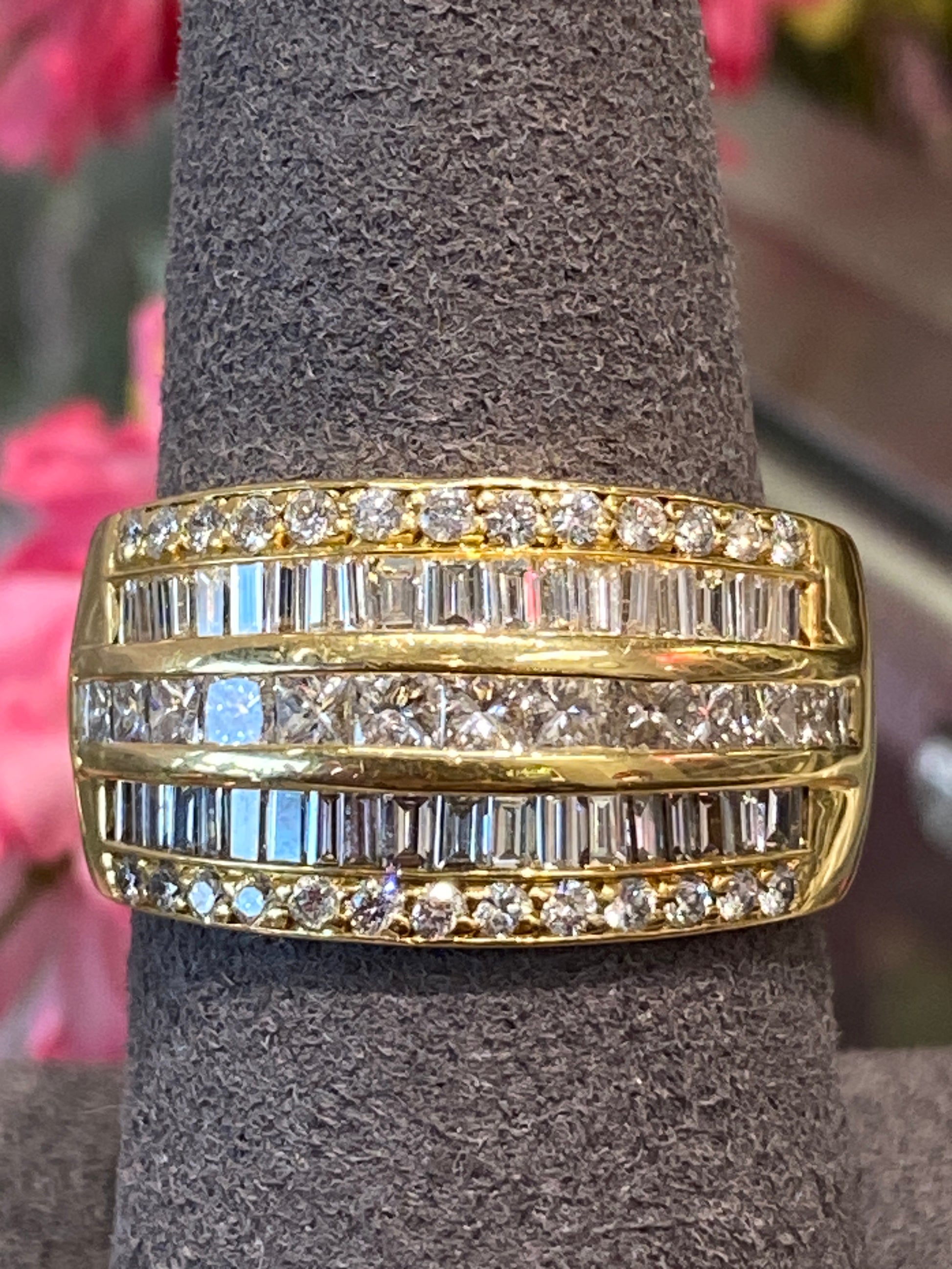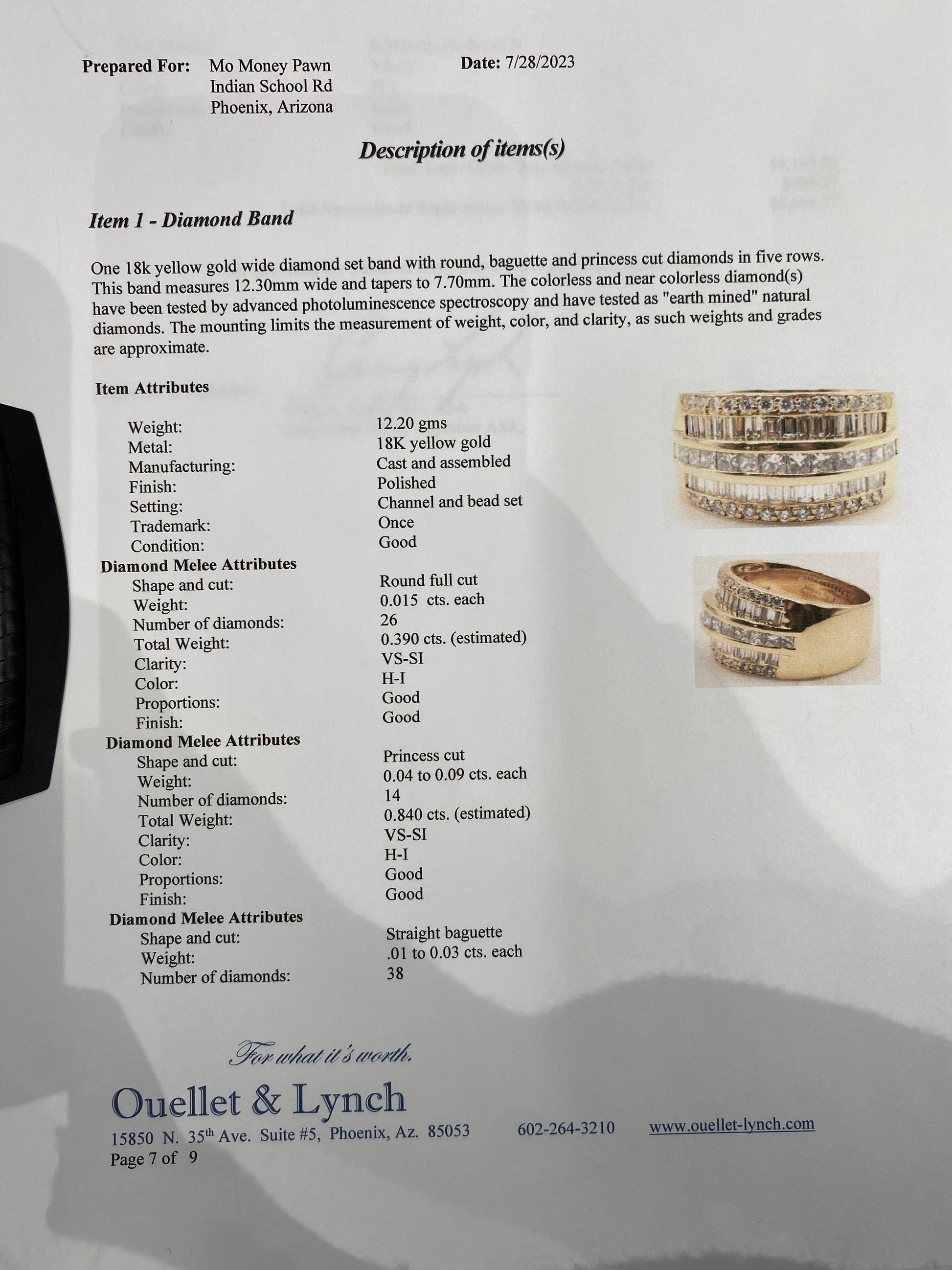 12.2 Grams Of 18k Yellow Gold Diamond Band. Diamond Band Has 26 Round Diamonds With A Total Weight Of 0.39CTW With A Clarity of (VS-SI) & Color Of (H-I). Diamond Band Also Has 14 Princess Cut Diamonds With A Weight Of 0.84CTW With A Clarity Of ( VS-SI) & Color Of (H-I). Diamond Band Also Has 38 Straight Baguettes With A Total Diamond Weight Of 0.76CTW With A Clarity Of ( VS-SI) & Color Of (H-I). Diamond Band Is A Size 8.5 & Comes With An Appraisal.