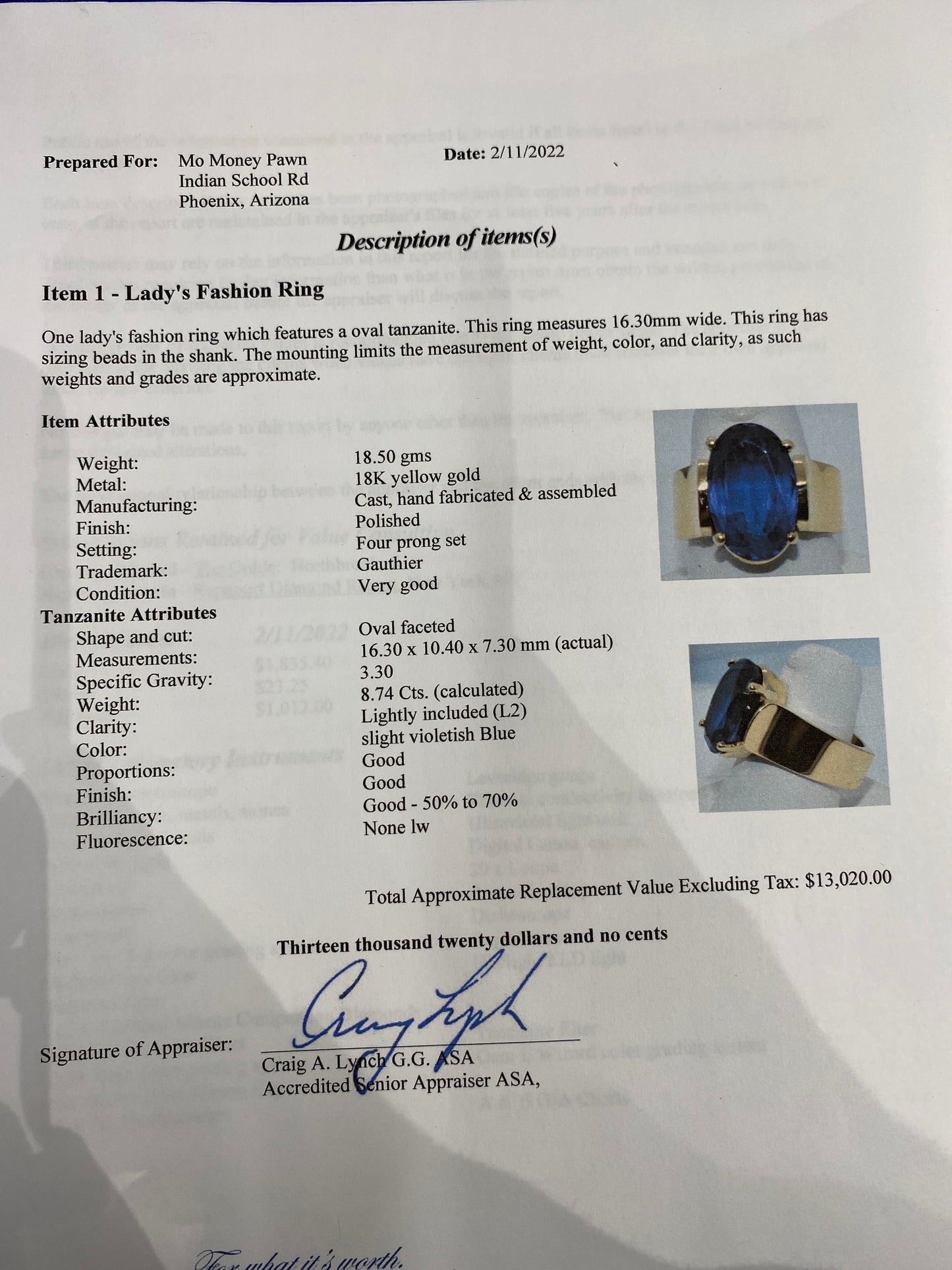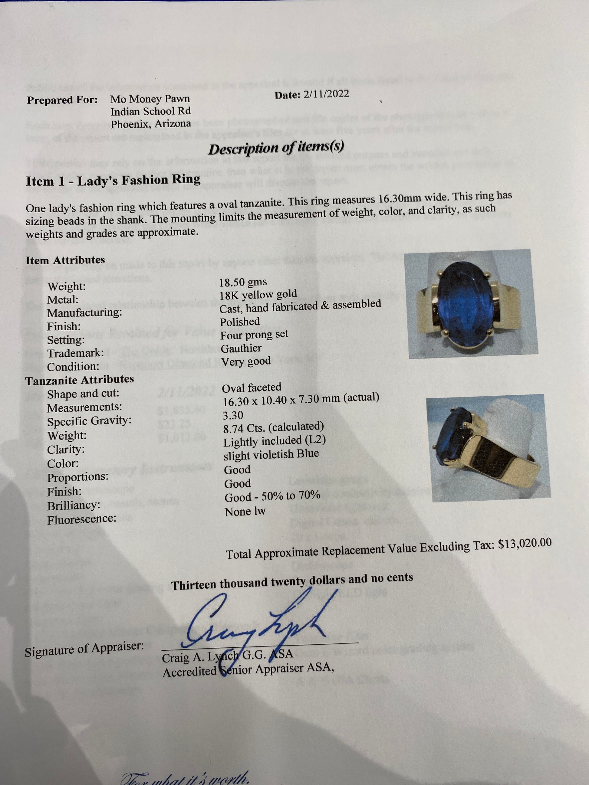 18.6 Grams Of 18k Yellow Gold Guathier Tanzanite Ring With Appraisal. Ring Is A Size 7.