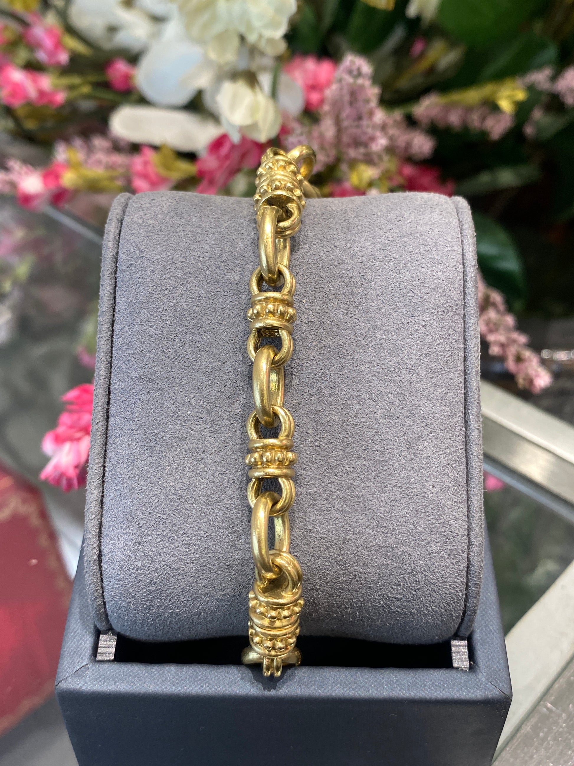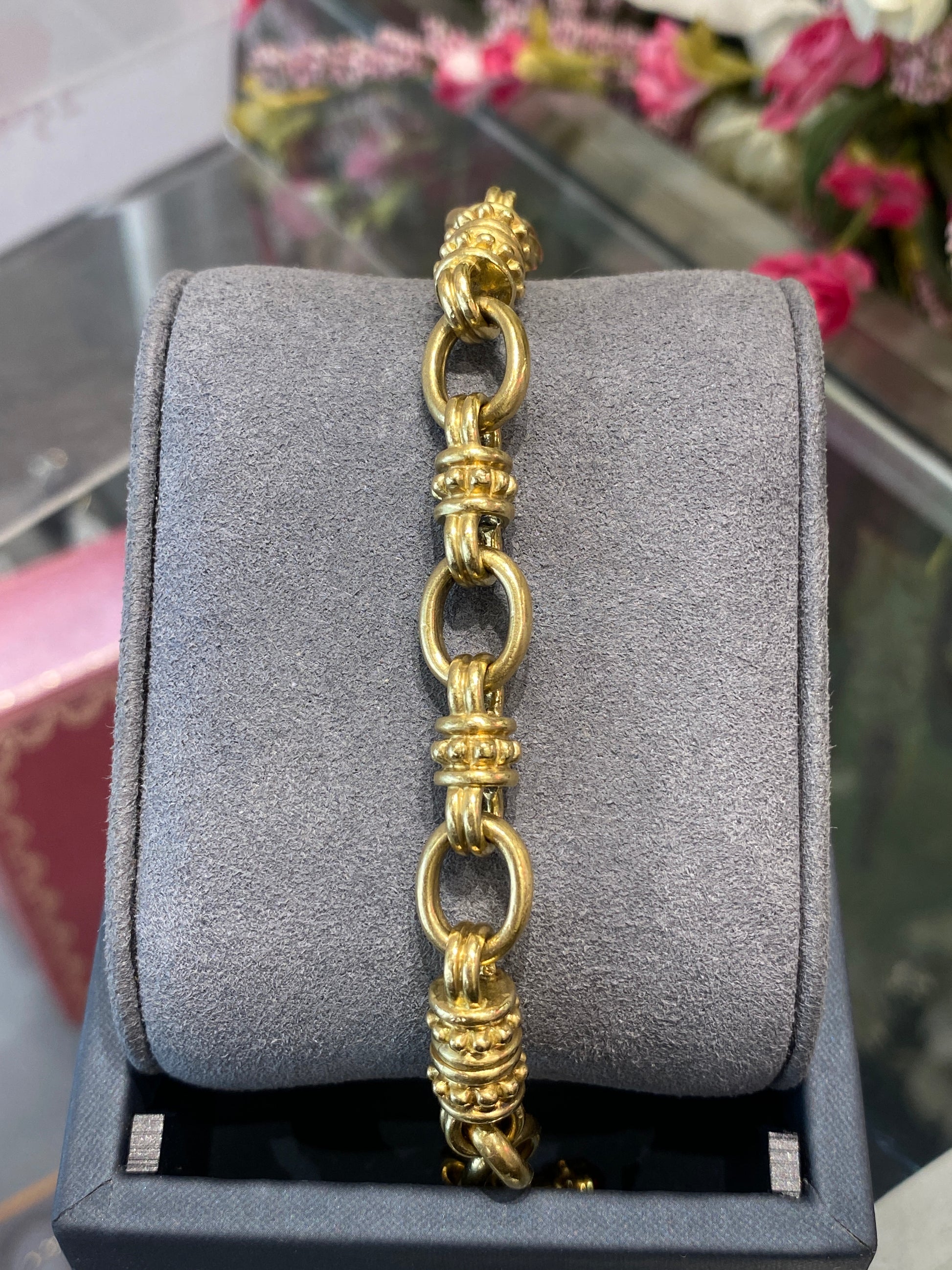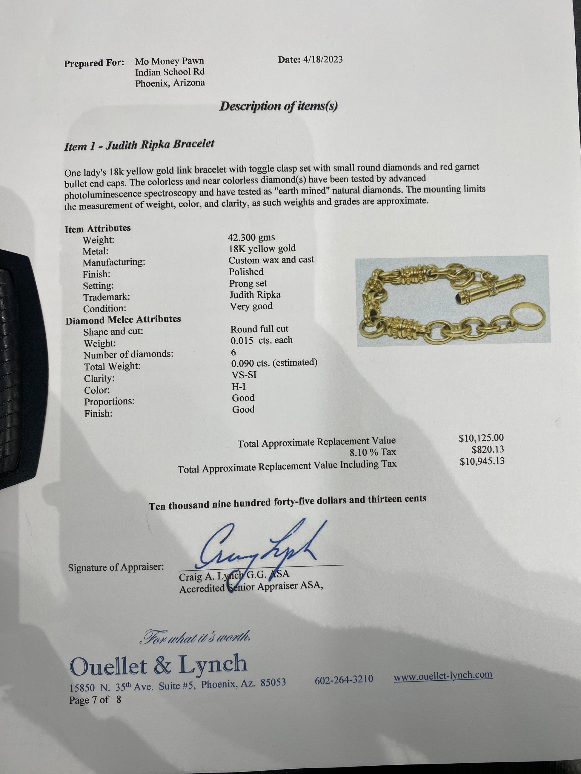42.3 Grams of 18k Yellow Gold Judith Ripka Bracelet With A Toggle Clasp. Bracelet Toggle Clasp Has A Red Garnet Bullet End Caps & Small Round Diamonds. Bracelet Has 0.09CTW Of Round Diamonds & Has A Clarity Of (VS-SI) & Color Of (H-I). Bracelet Is 7” Long. Bracelet Comes With Appraisal.