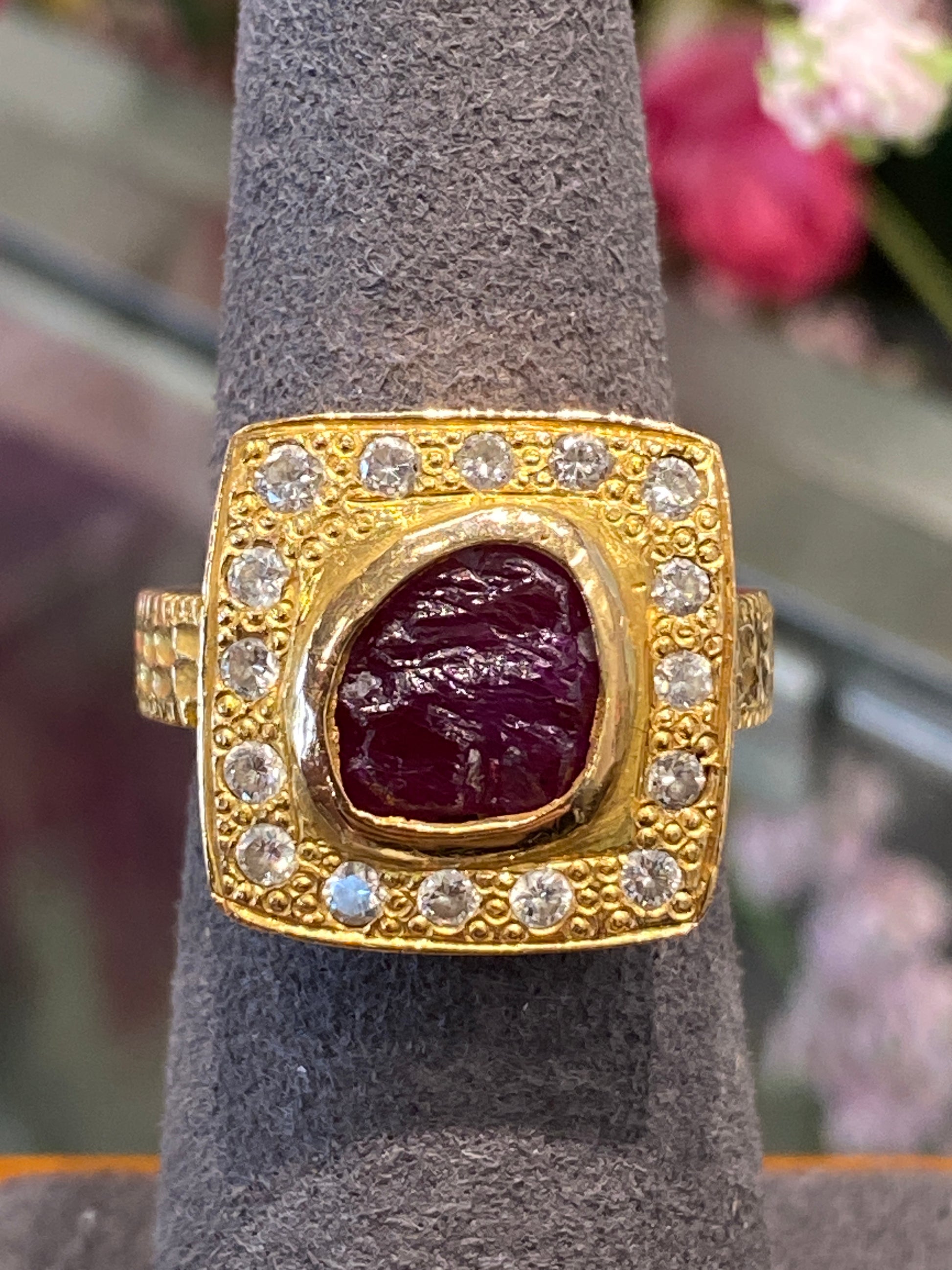 18k Yellow Gold Ring With Red Stone & Diamonds