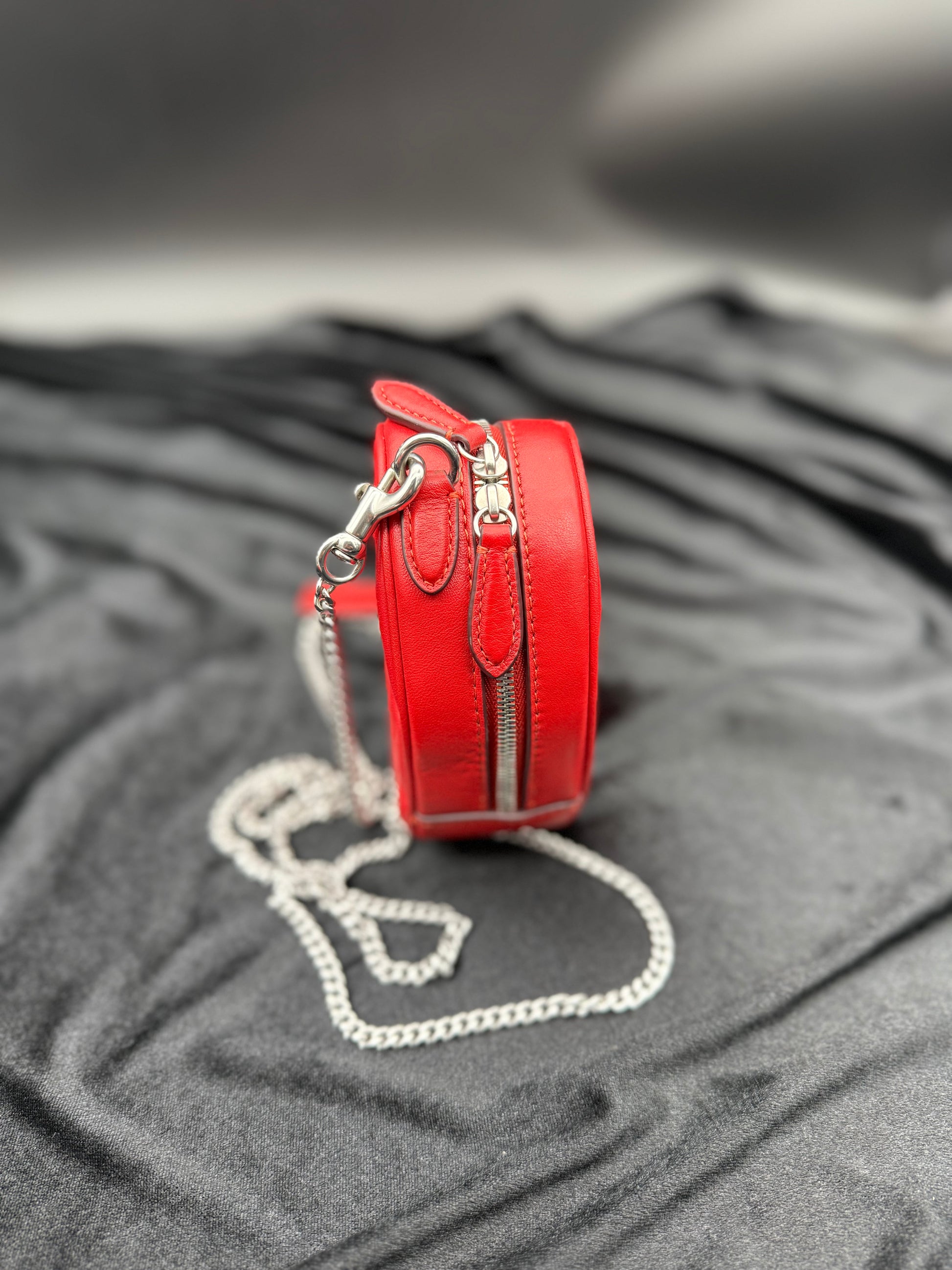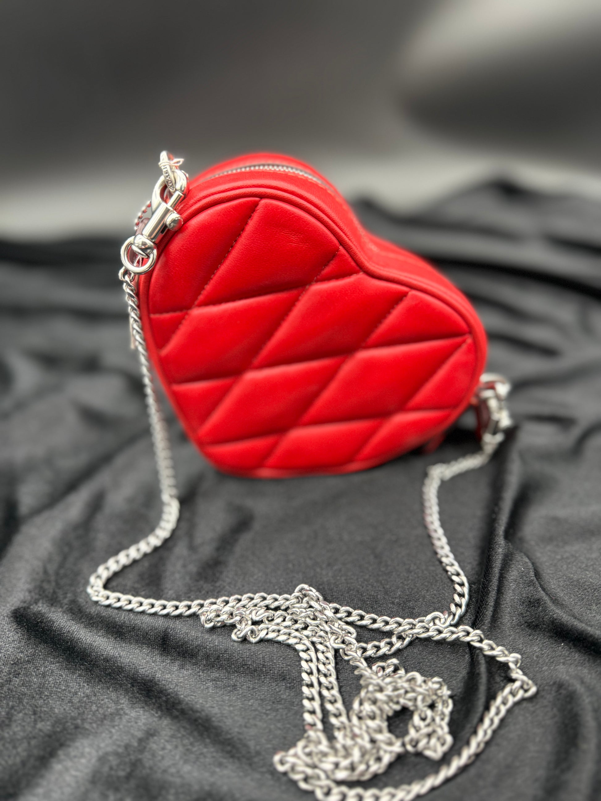 This heart-shaped red leather bag with quilted stitching features a silver chain strap and a metallic "C" emblem. Its playful design combines a romantic silhouette with a bold color, making it a standout accessory for casual or evening wear.