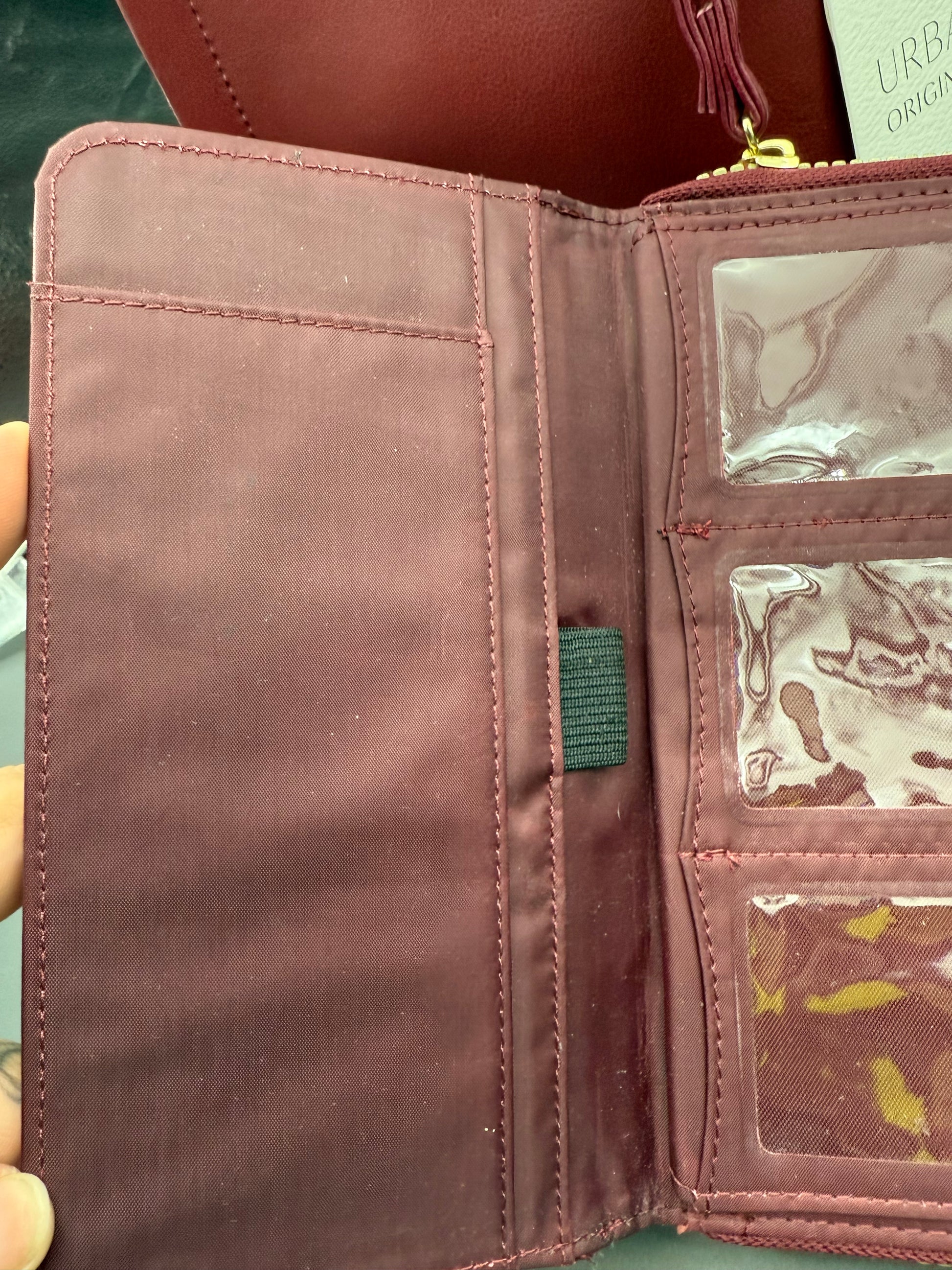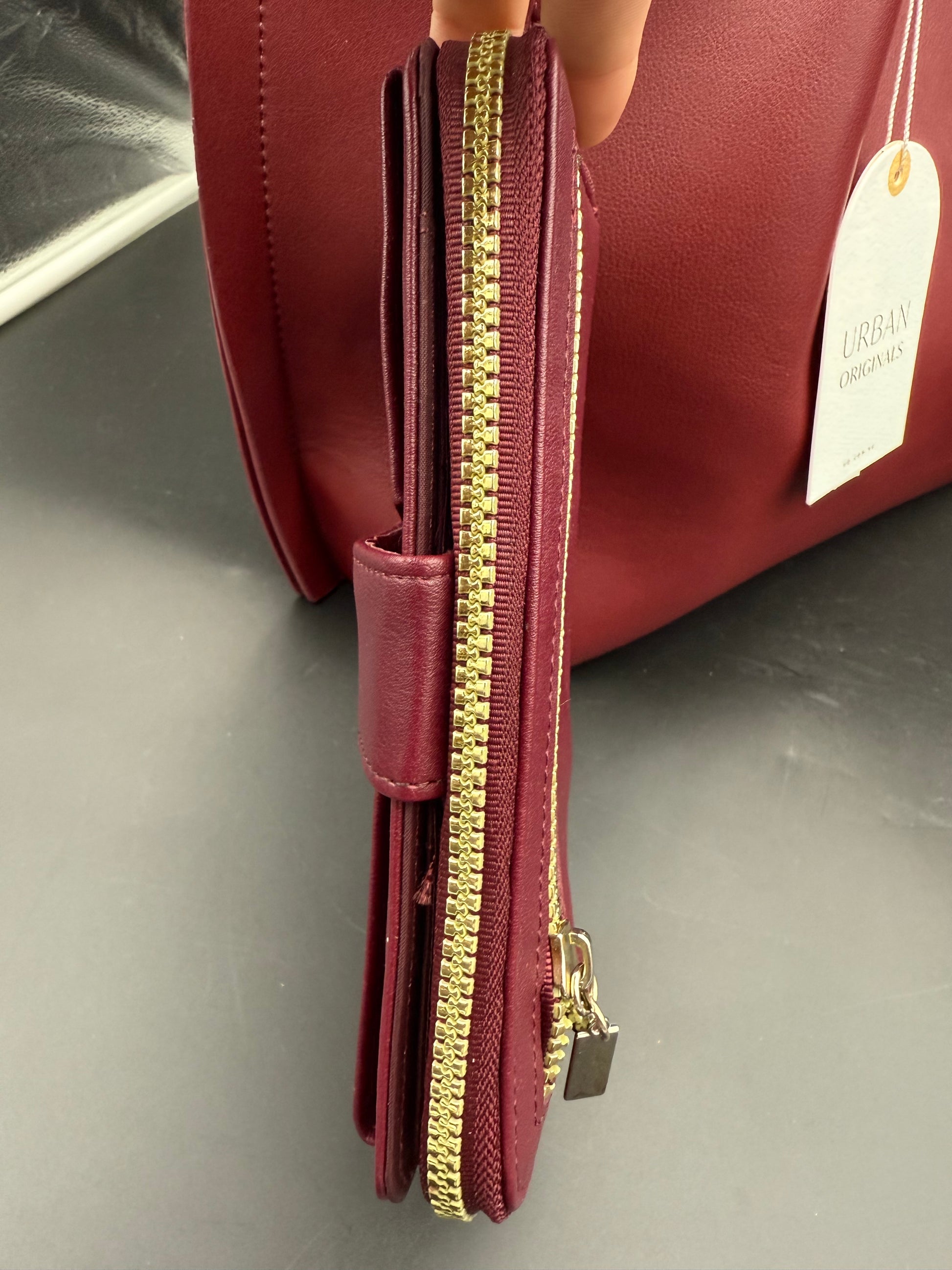 This is a burgundy handbag and matching wallet from Urban Originals. Urban Originals is known for creating eco-friendly, often using vegan leather.