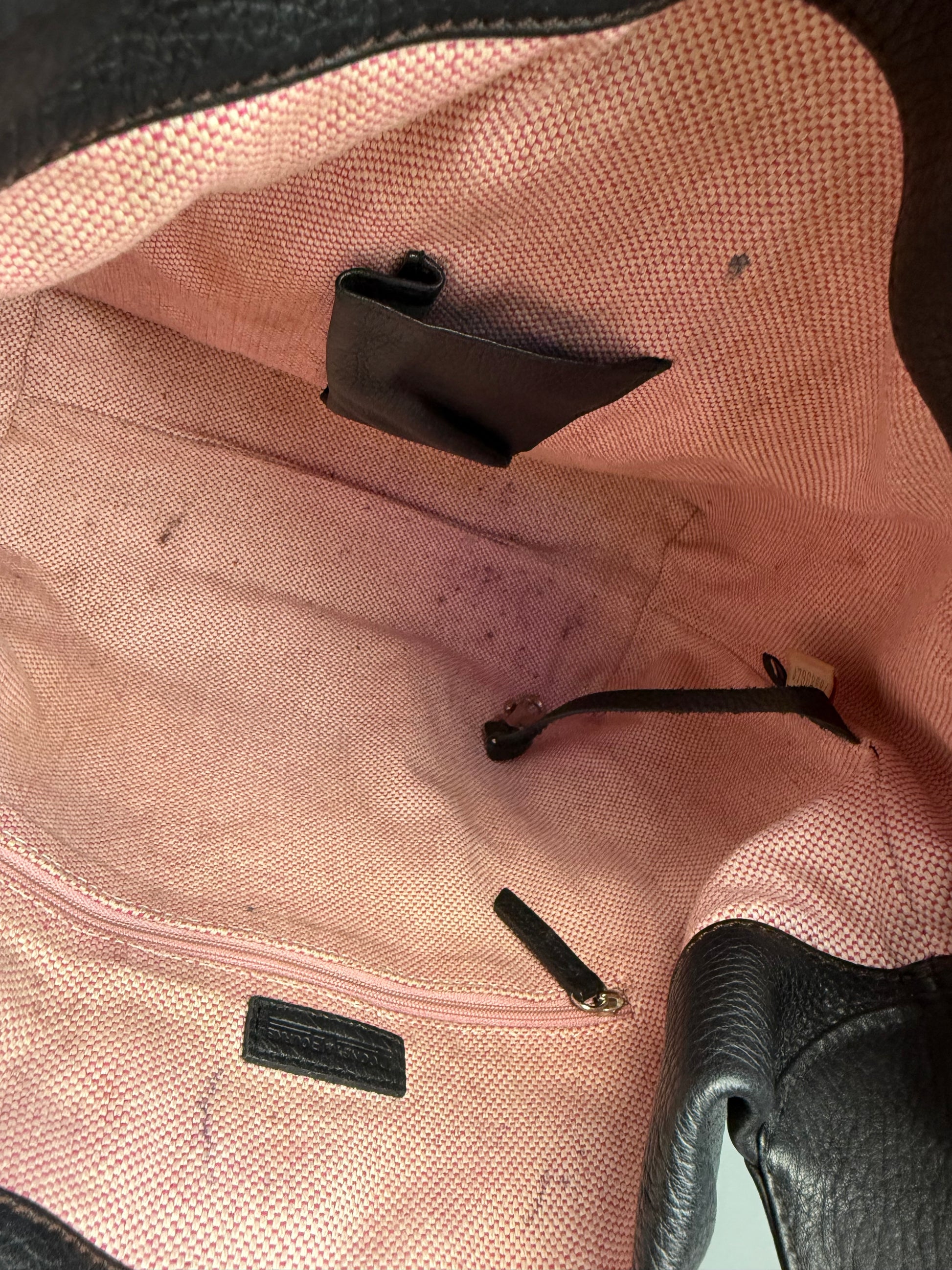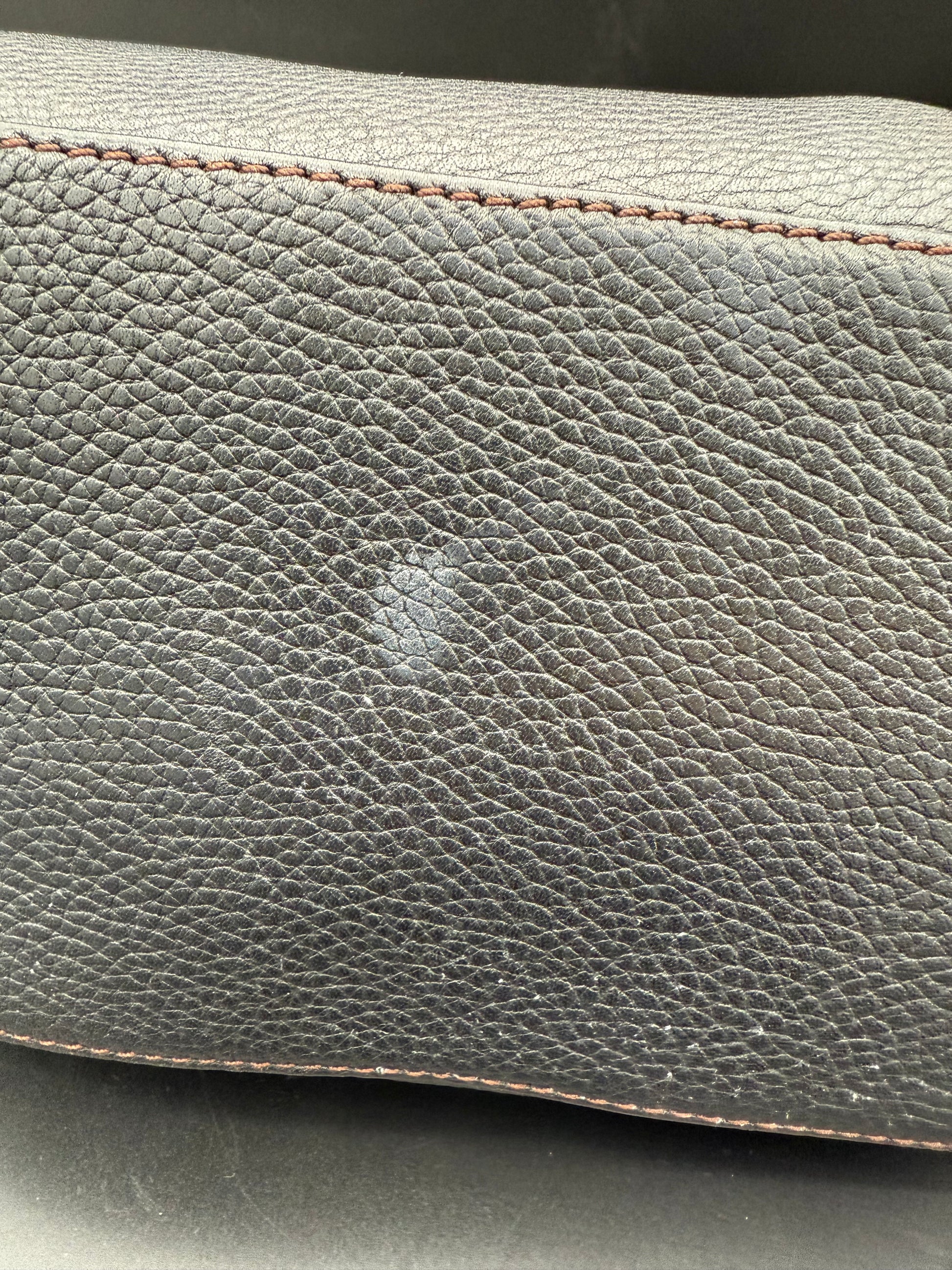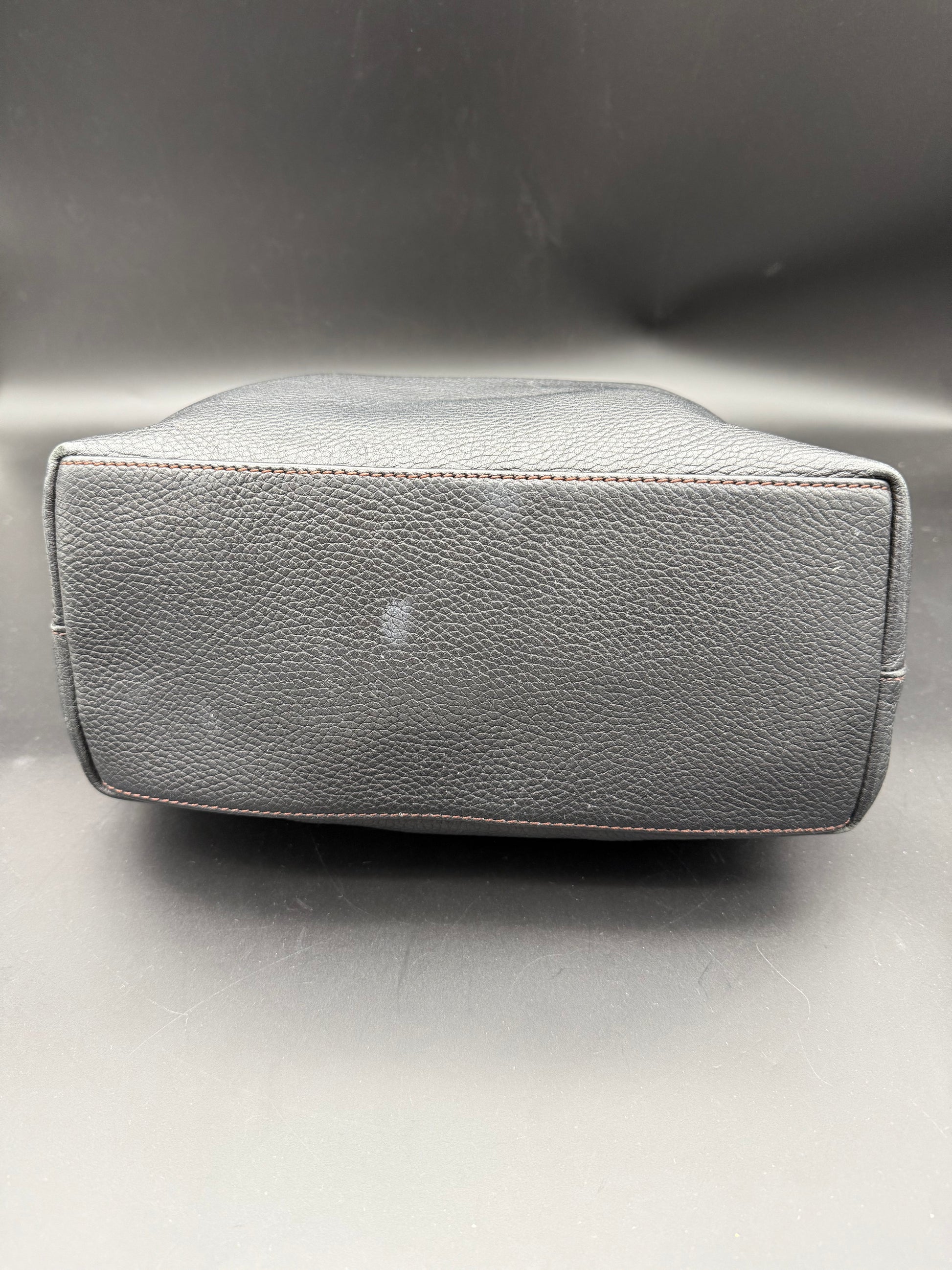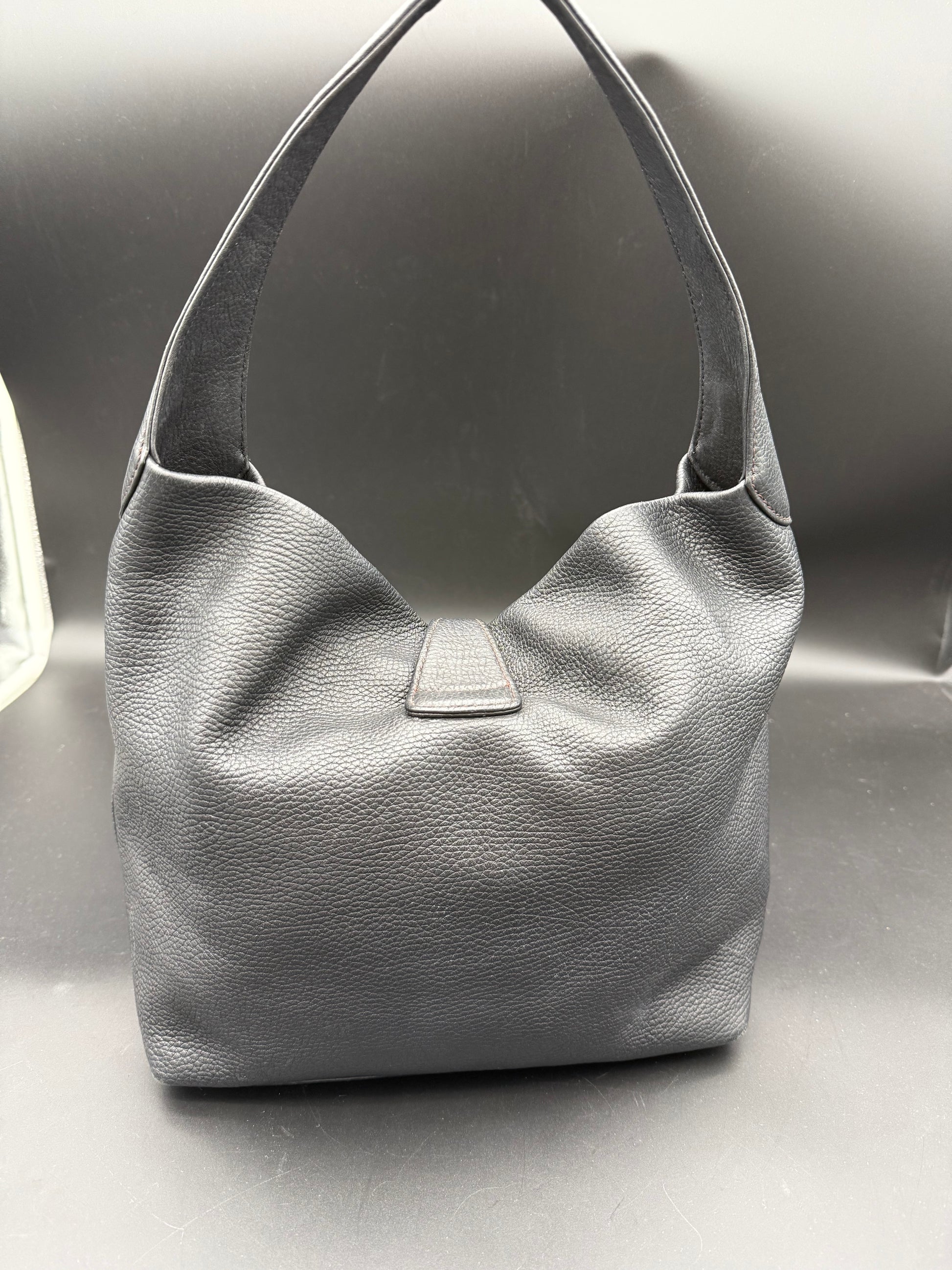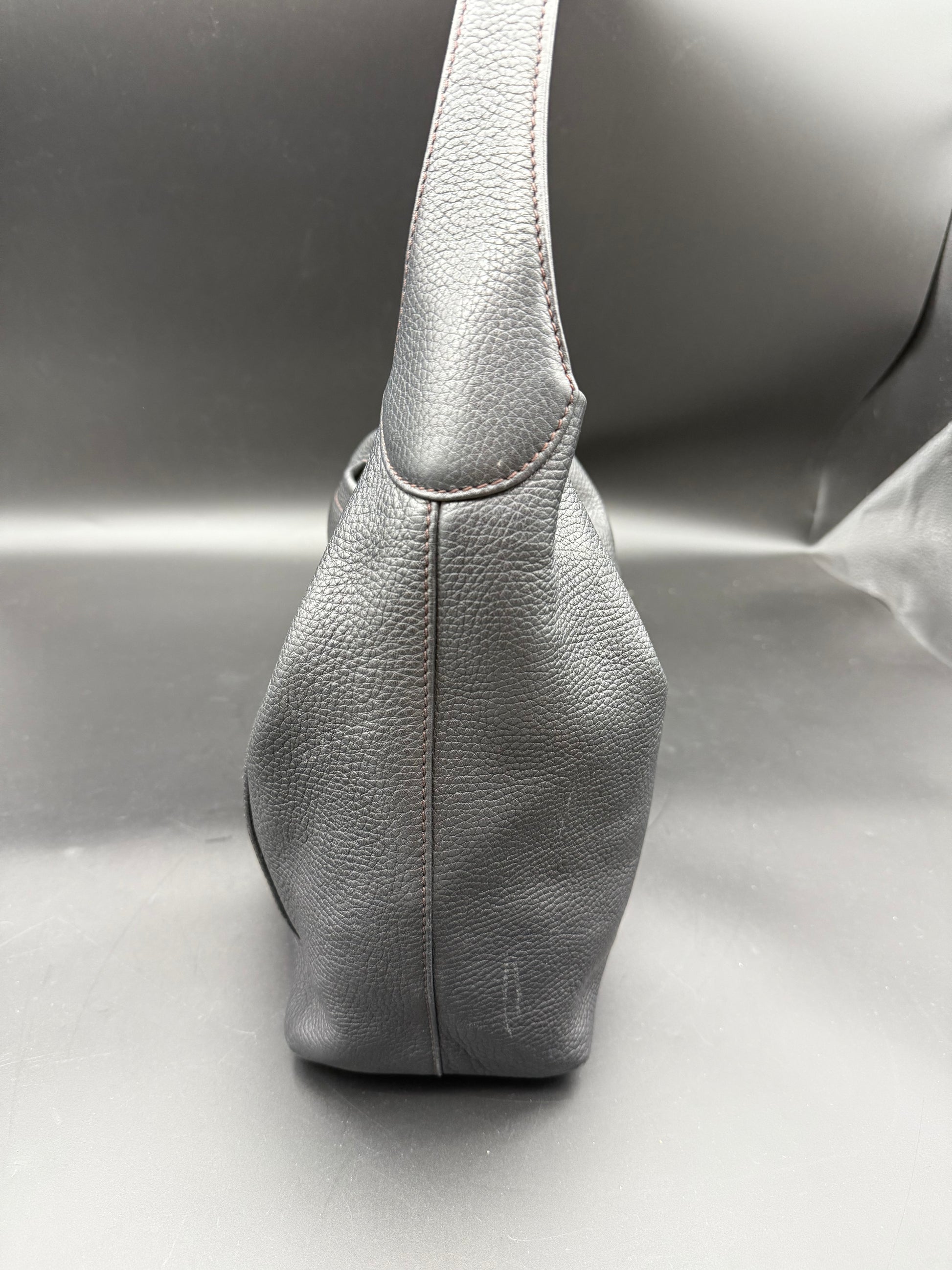 This is a black leather handbag featuring a single strap and a silver-tone clasp closure. The bag has a pebbled texture, visible stitching, and a subtle embossed logo in the bottom corner.