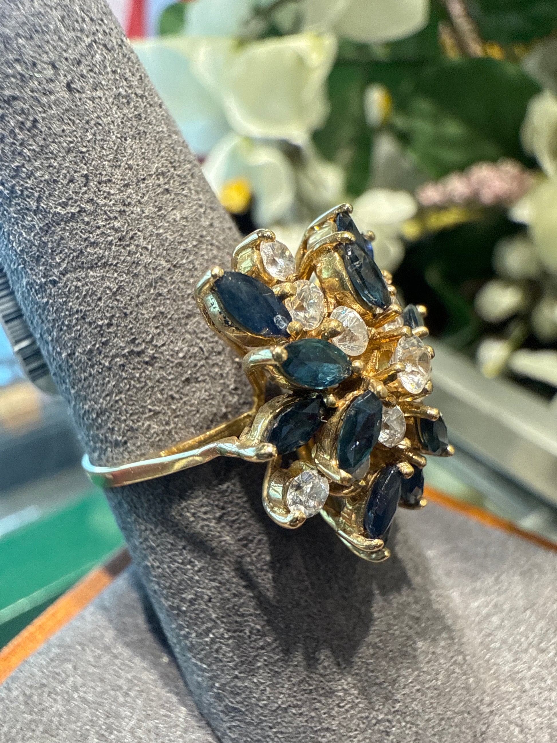14k yellow gold cluster ring with blue stones and cubic zirconias 5.2g size 8