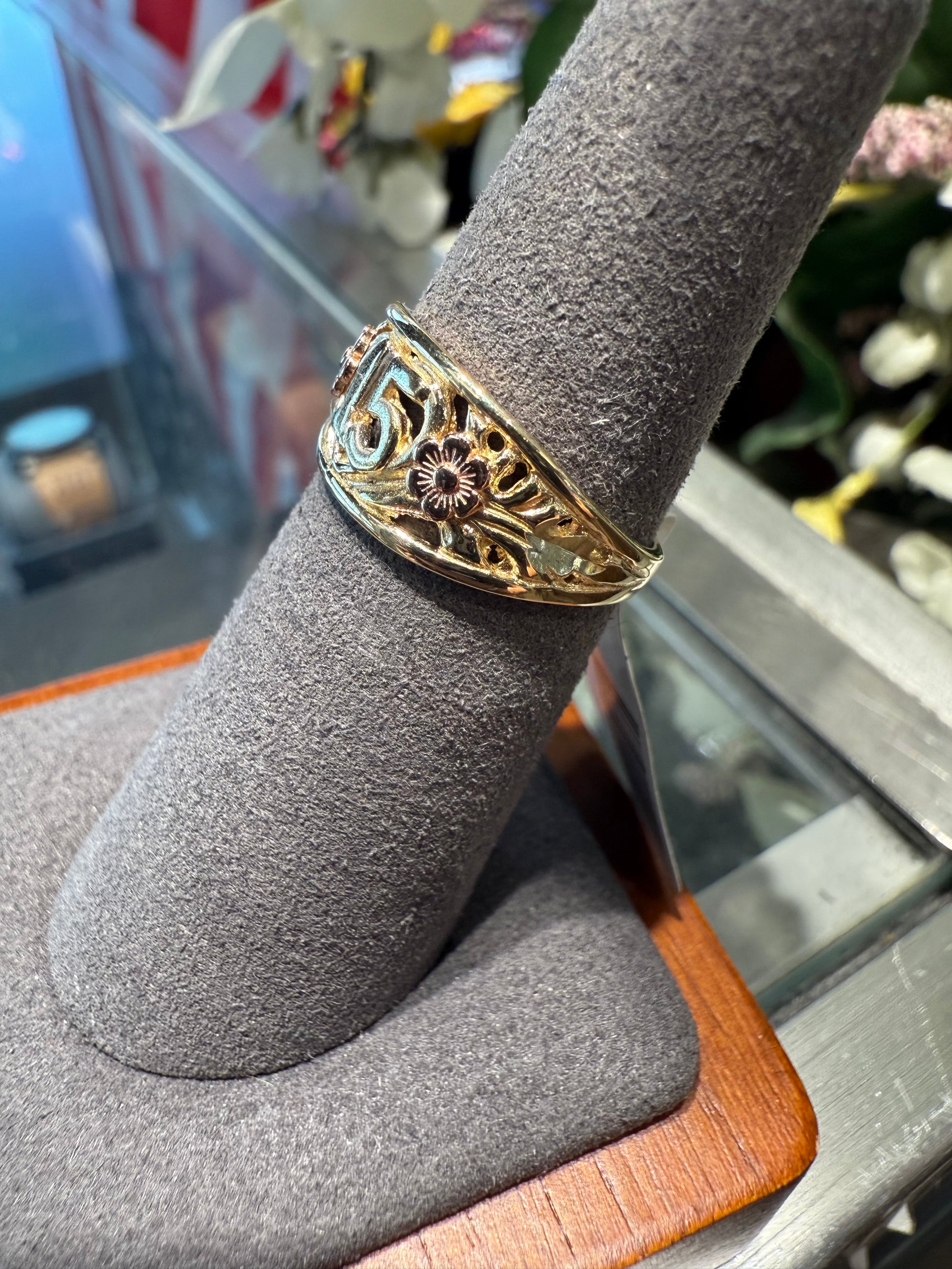 10k two tone gold “15” quince ring w/flowers 2.3g size 6