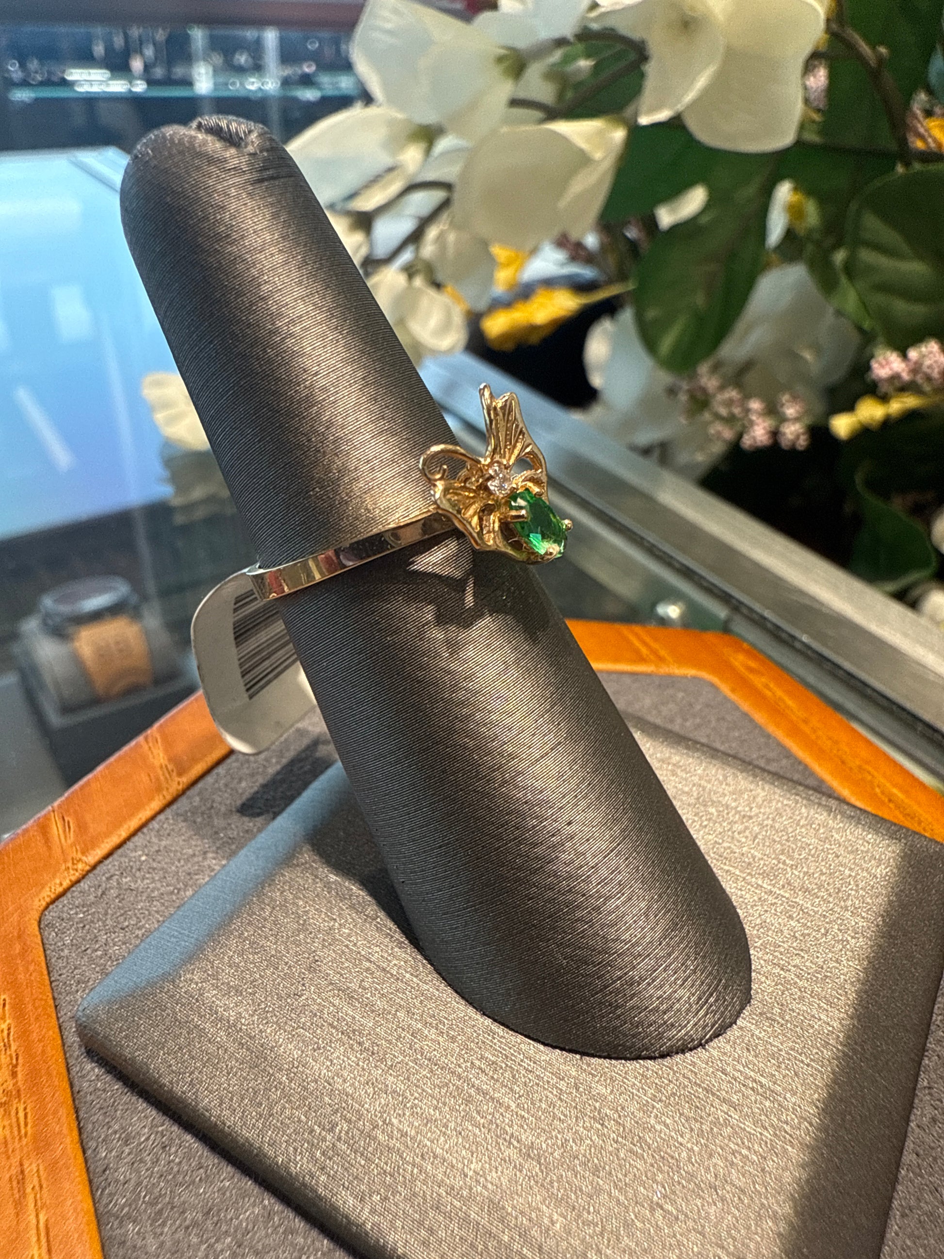 14k yellow gold butterfly ring with green stone and cubic zirconia 2.1g size 6
