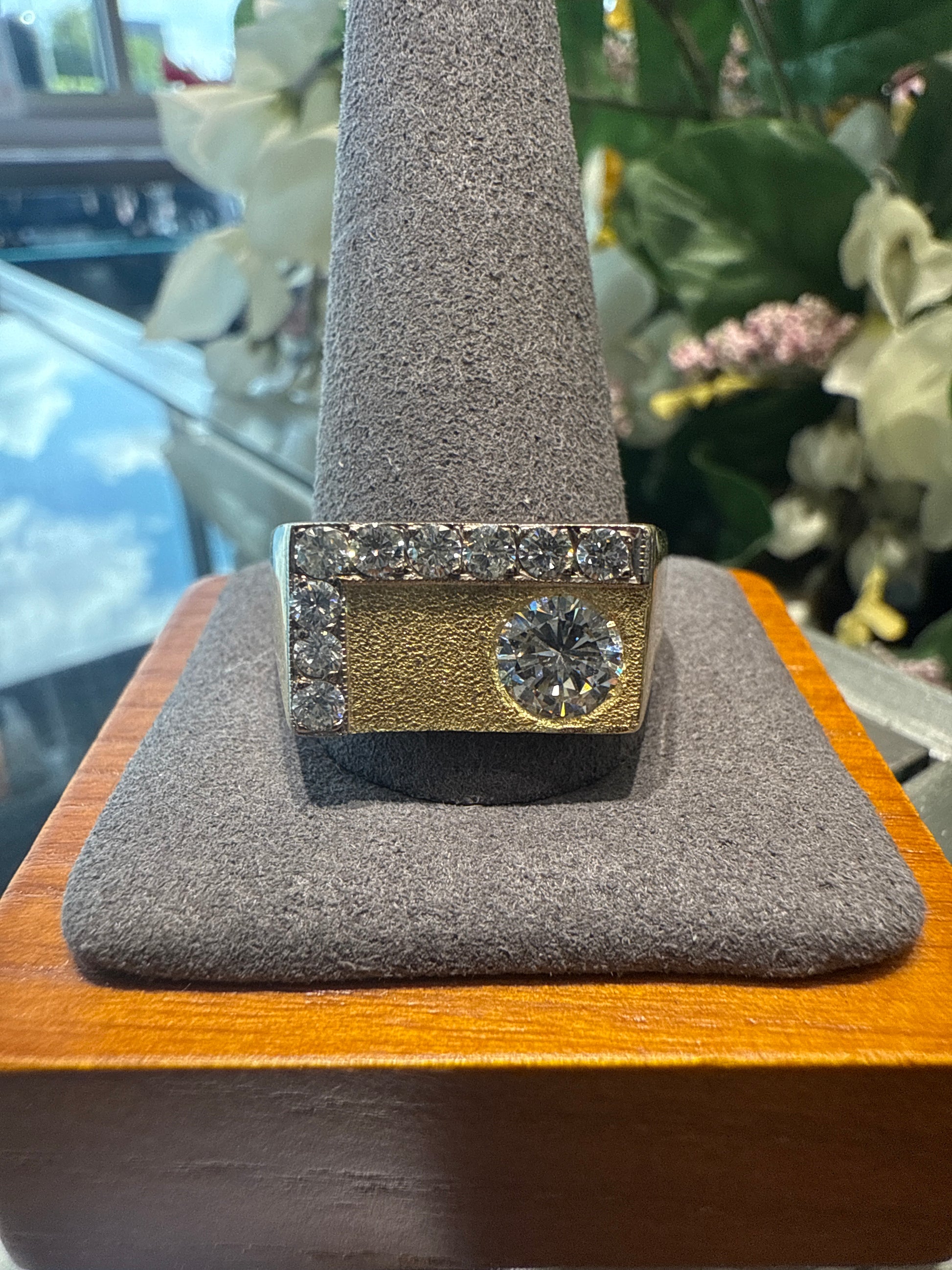 18k yellow gold 17.5g ring W/ 1 round brilliant diamond 0.70ctw and 9 round brilliant diamonds 0.30ctw