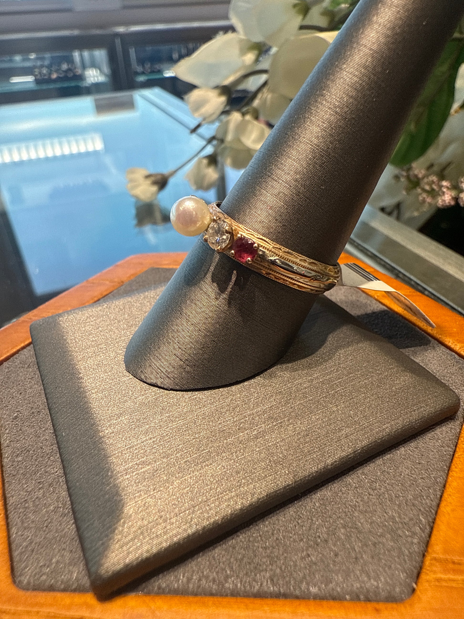 14k yellow gold ring with red stones, diamonds and a pearl 4.8g size 10