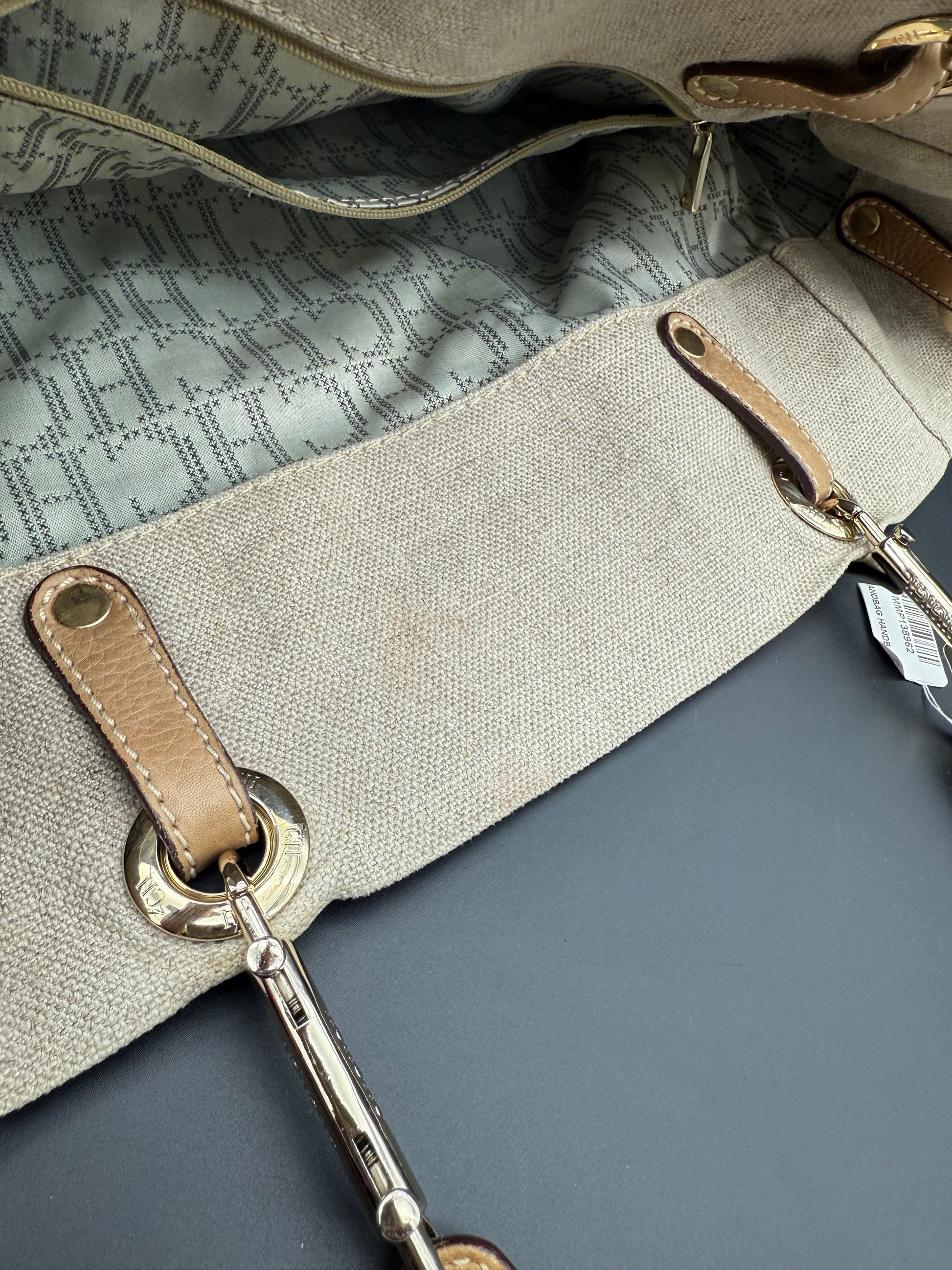 This is a CH Carolina Herrera handbag, identifiable by the repeated "CH" embossed logo pattern on the leather section. Carolina Herrera is known for its elegant, high-quality accessories, blending classic design with modern sophistication.