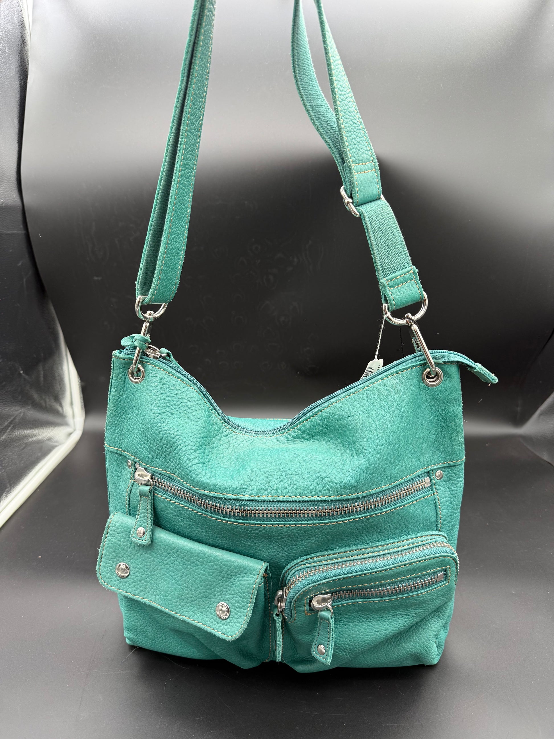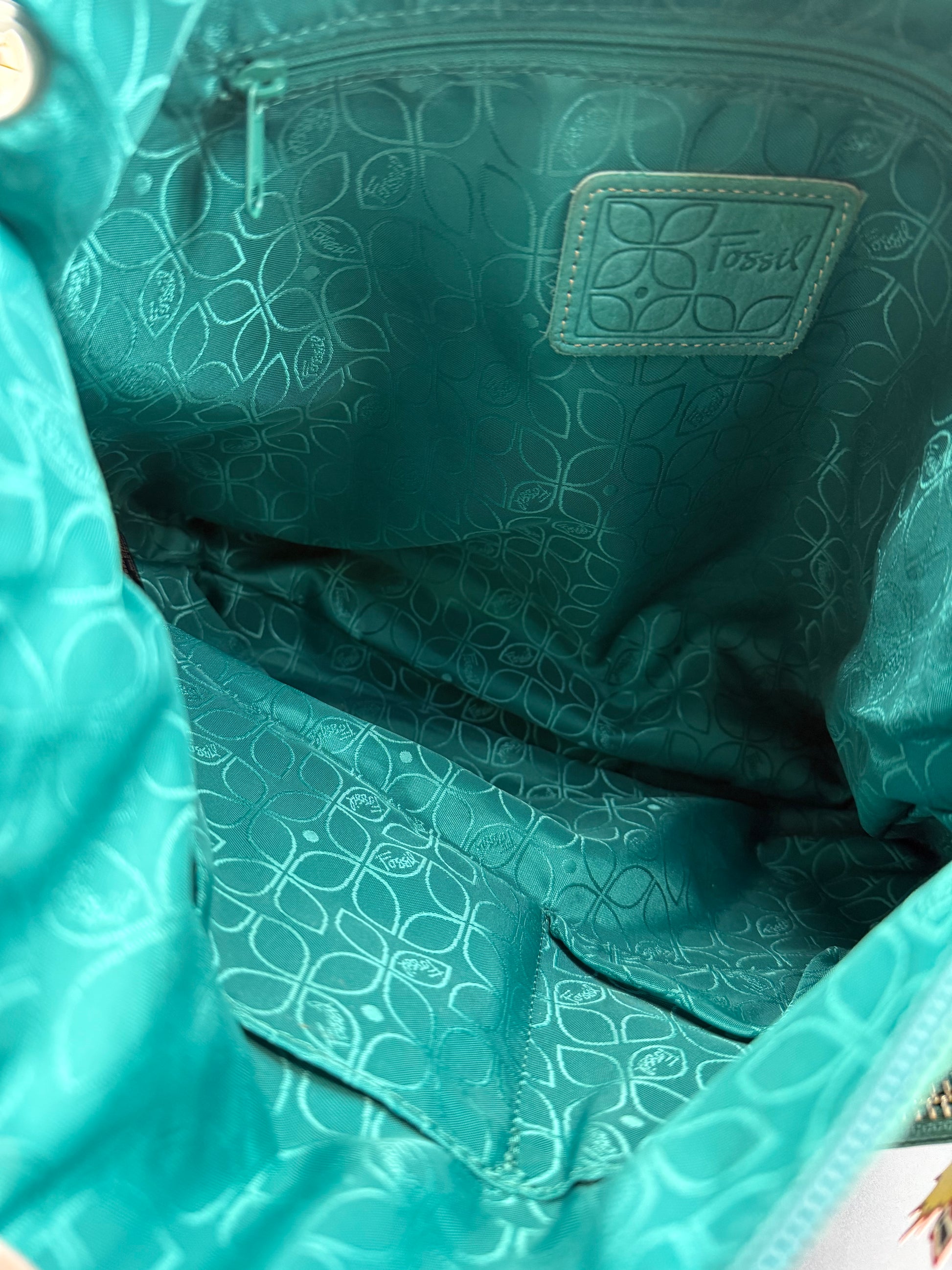 This is a Fossil handbag/crossbody bag made from textured faux leather or leather material. It features multiple compartments, including zippered pockets and a flap pocket with snap closures, offering convenient storage for daily essentials.