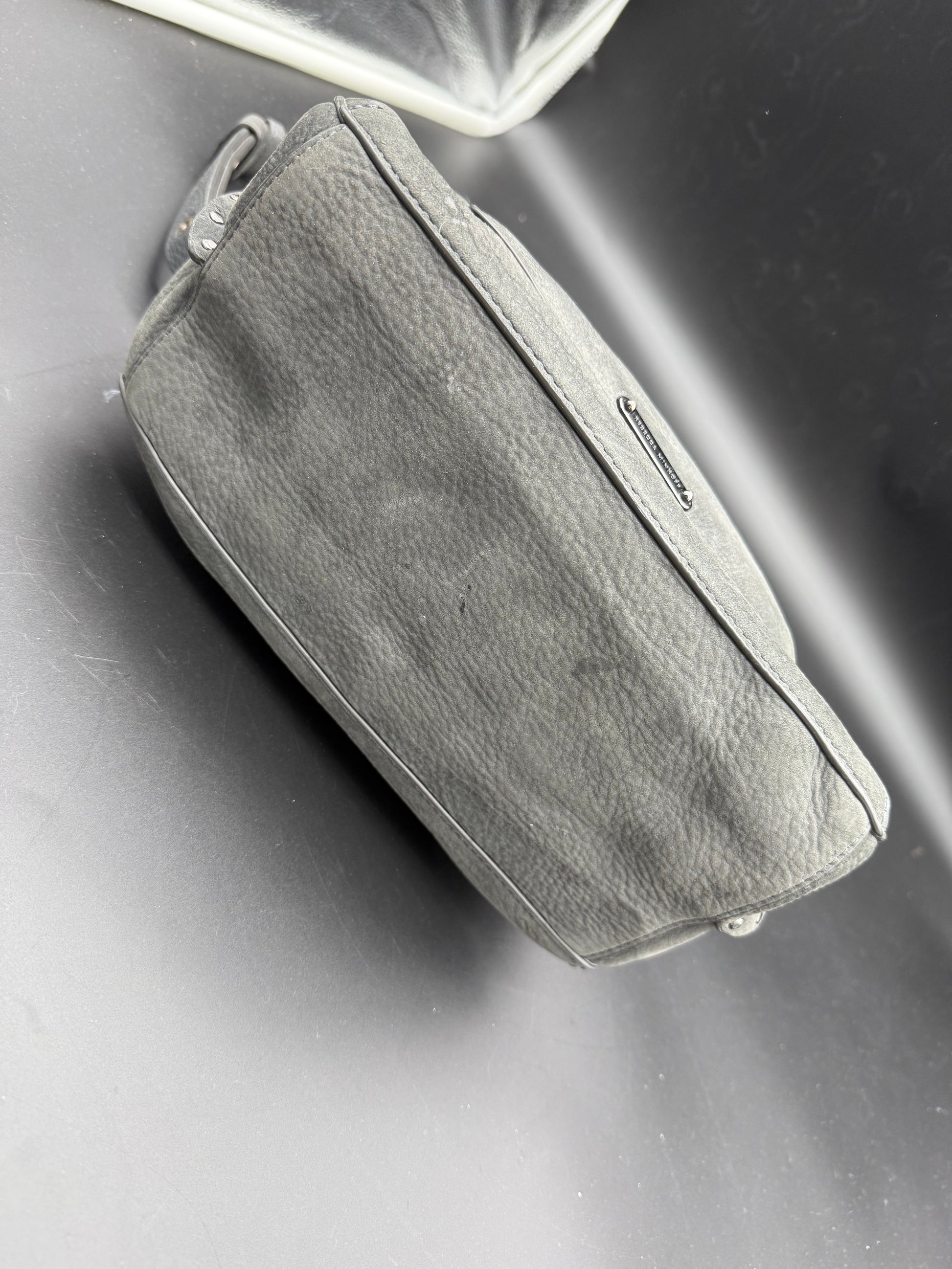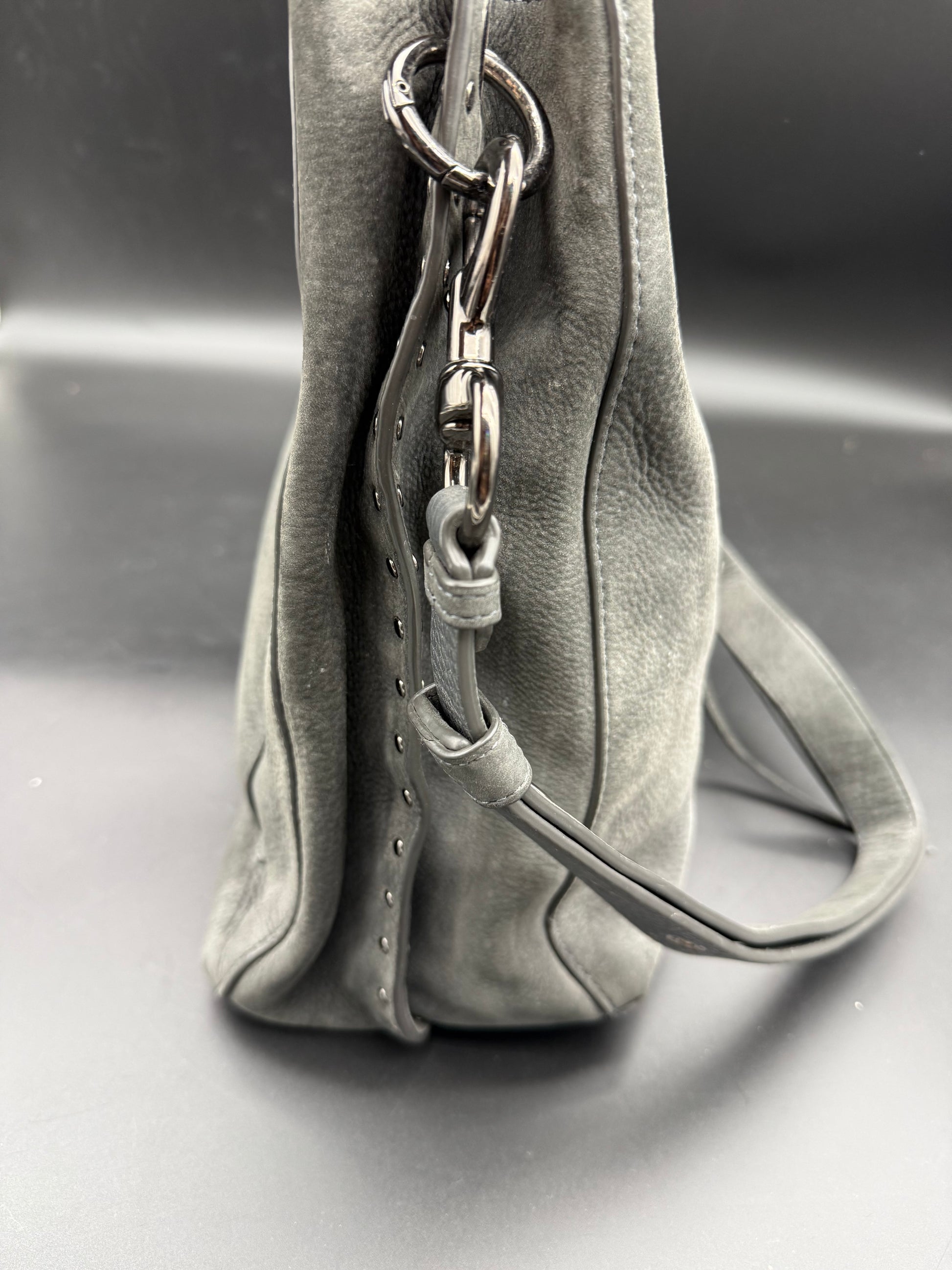 This is a Rebecca minkoff ,gray leather purse/crossbody bag with an adjustable strap and a drawstring closure. Its minimalist design and soft texture make it versatile for casual or semi-formal use.